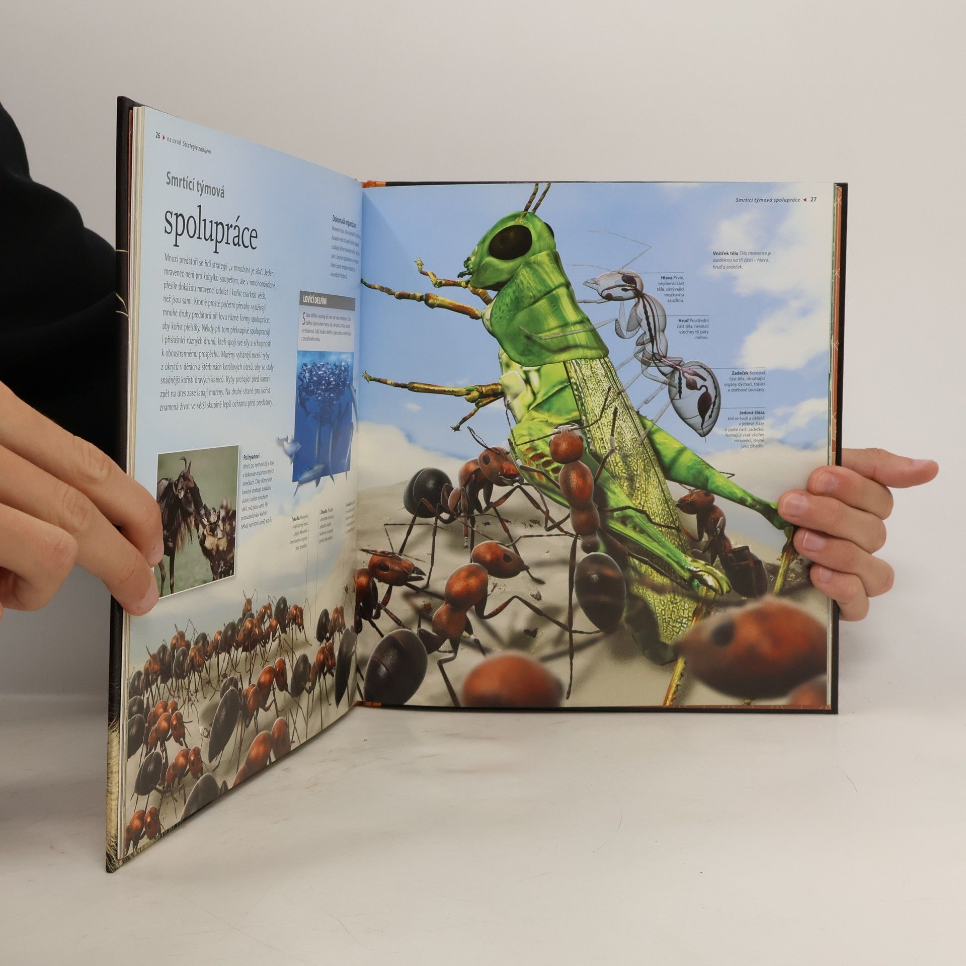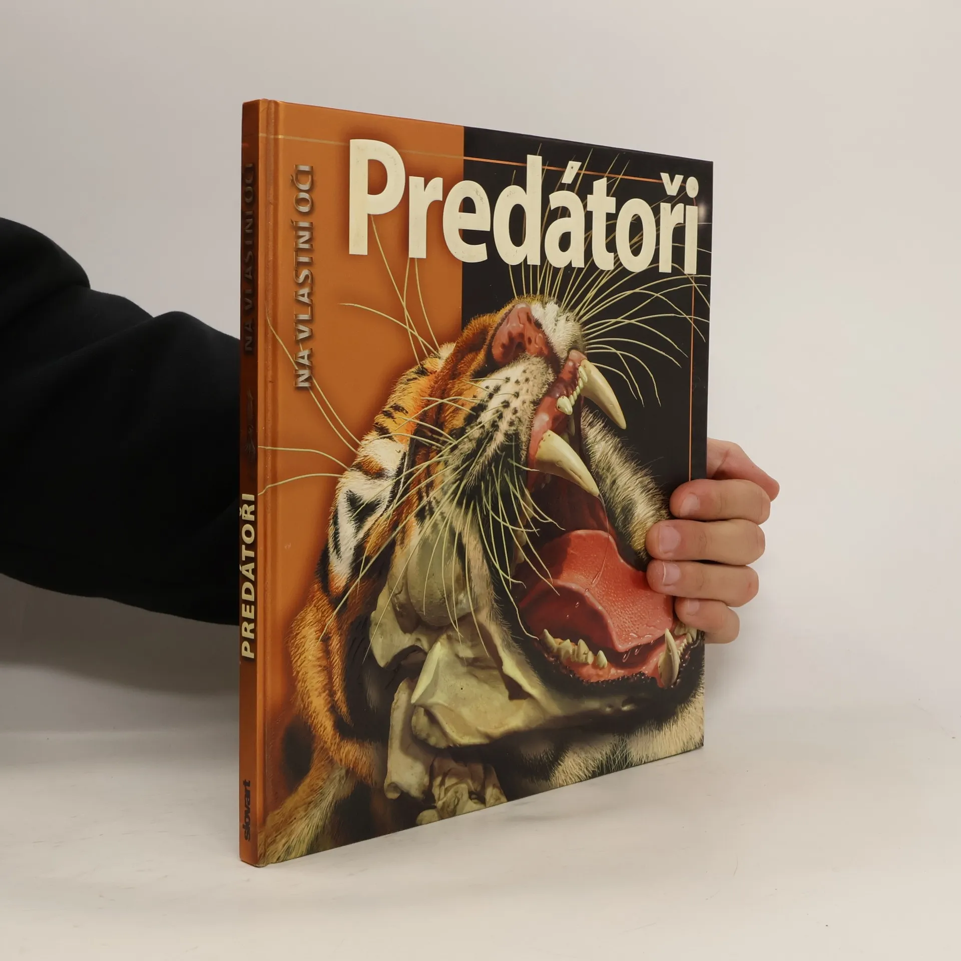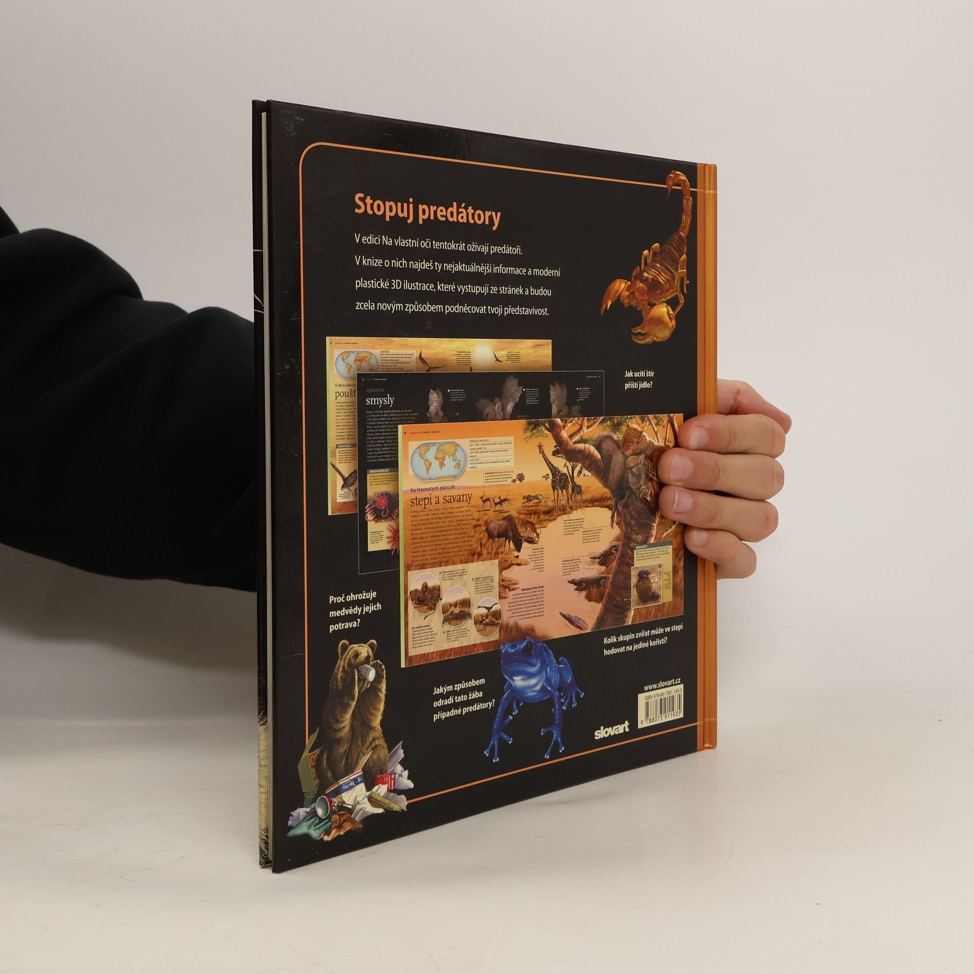 V dalším dílu edice Na vlastní oči ožívají predátoři. Moderní plastické 3D ilustrace jsou tu mimořádně působivé. Jednotlivé kapitoly popisují různé strategie predátorů – mnozí z nich jsou vybaveni účinnými zbraněmi, jako jsou zobáky, zuby, drápy a pařáty či výjimečné smysly, jiní spoléhají na velikost, sílu či rychlost, jed nebo smrtící sevření, popř. na týmovou spolupráci pod heslem „v množství je síla“, hodí se i důmyslné pasti a skrýše. Druhá část knihy seznamuje dětské čtenáře s jednotlivými skupinami predátorů (kočkovité nebo psovité šelmy, medvědi, žraloci, krokodýlové, dravci a sovy) a s prostředím, kde žijí: deštný prales, poušť, polární oblasti, korálový útes nebo stepi a savany.