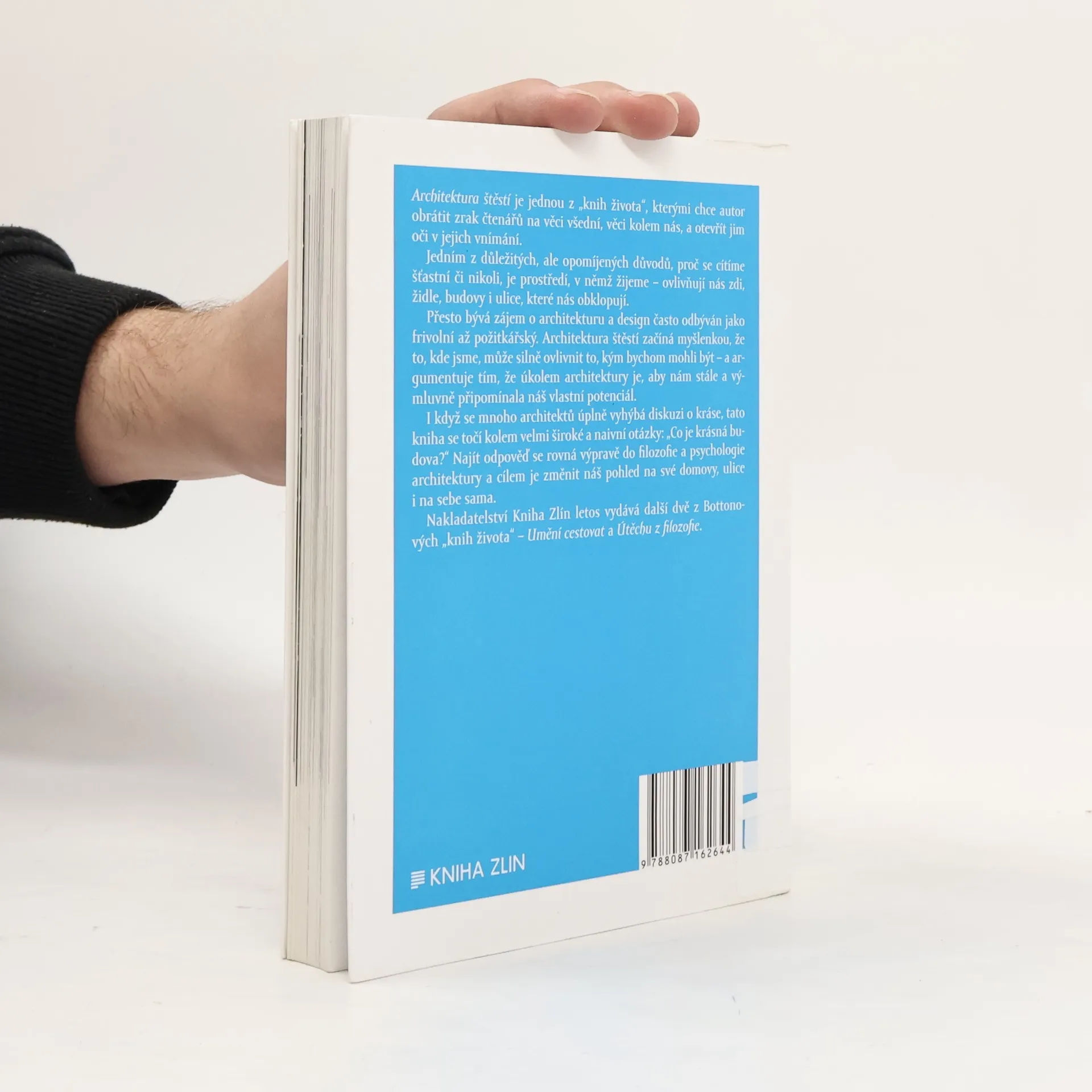 Architektura štěstí je jednou z „knih života“, kterými chce autor obrátit zrak čtenářů na věci všední, věci kolem nás a otevřít jim oči v jejich vnímání. Jedním z důležitých, ale opomíjených důvodů, proč se cítíme šťastní či nikoli, je prostředí, v němž žijeme – ovlivňují nás zdi, židle, budovy i ulice, které nás obklopují. Přesto bývá zájem o architekturu a design často odbýván jako frivolní až požitkářský. Architektura štěstí začíná od myšlenky, že to kde jsme, může silně ovlivnit to, kým bychom mohli být – a argumentuje tím, že je úkolem architektury je, aby nám stále a výmluvně připomínala náš vlastní potenciál. I když se mnoho architektů úplně vyhýbá diskuzi krásy, tato kniha se točí kolem velmi široké a naivní otázky „Co je krásná budova?“ Najít odpověď se rovná výpravě do filozofie a psychologie architektury a cílem je změnit náš pohled na naše domovy, ulice i na sebe sama. Ve vydavatelství Kniha Zlín vychází také další z „knih života“, Umění cestovat a Útěcha ve filozofii.