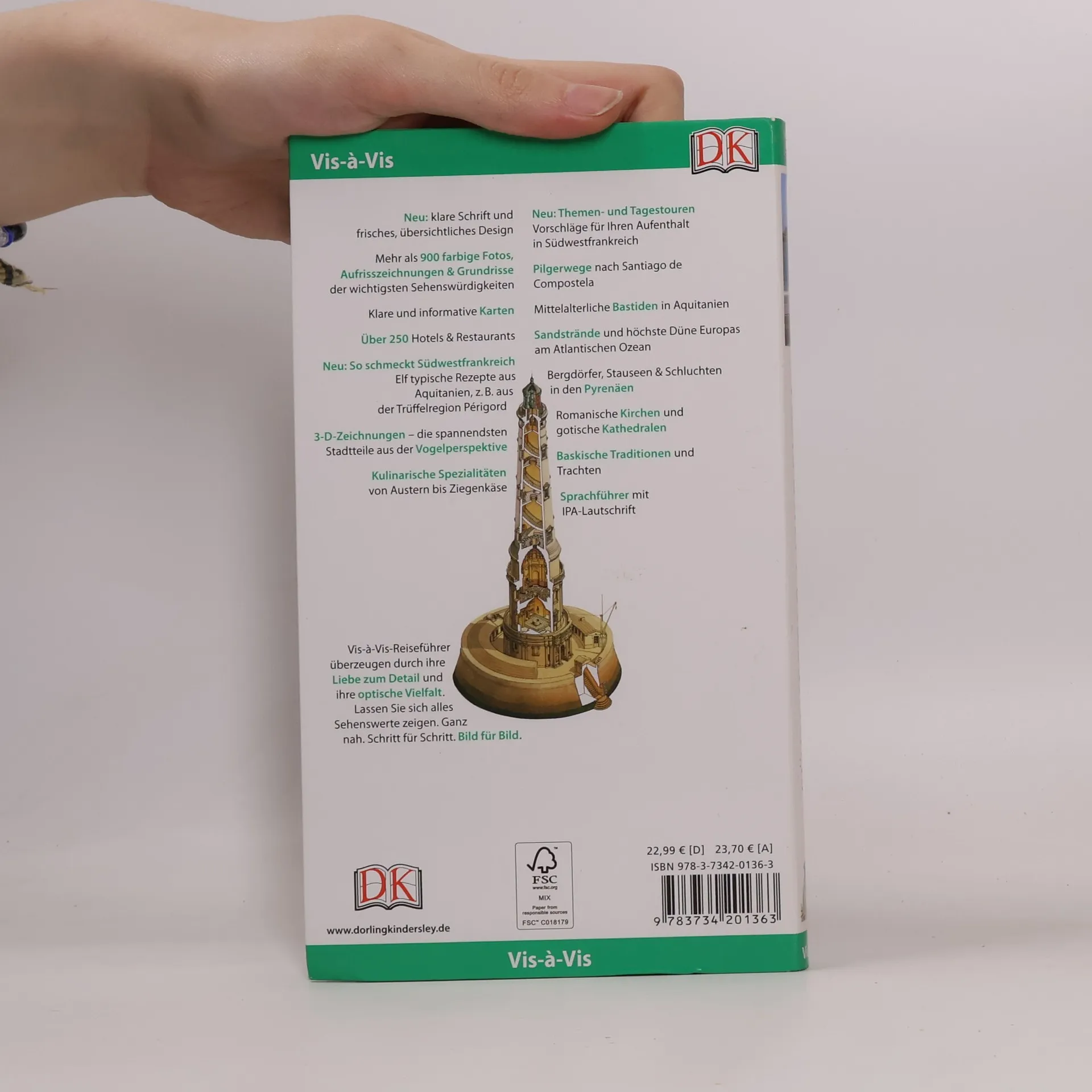 Von verschlafenen malerischen Dörfern bis zu Frankreichs Weinhauptstadt Bordeaux – die landschaftliche, kulturelle und kulinarische Vielfalt Aquitaniens bietet beste Voraussetzungen für einen abwechslungsreichen Urlaub voller Genuss. Der Atlantische Ozean im Westen lässt nicht nur Surfer-Herzen höher schlagen! Im Vis-à-Vis Südwestfrankreich finden Sie für jedes Vorhaben alle Informationen, die Sie benötigen: vom Hotel im Renaissance-Schloss in Ribourne über das traditionelle Restaurant in Bourdeilles bis zu Bootsverleihen auf den Kanälen. Alle wichtigen Sehenswürdigkeiten wie Phare de Corduan, Grand-Théâtre in Bordeaux oder die Kathedrale von Bayonne werden anhand von detaillierten 3D-Zeichnungen und anschaulichen Farbfotos ausführlich beschrieben. Die Pilgerwege nach Santiago de Compostela durch Aquitanien werden ebenso vorgestellt. Zahlreiche Features zur Geschichte und den Traditionen veranschaulichen die Besonderheiten Südwestfrankreichs. Dazu gibt es ein Mini-Kochbuch zum Herausnehmen mit typischen Gerichten der Region. Die hervorragenden Abbildungen - exakte Schnittzeichnungen, dreidimensionale Grundrisse, Übersichtskarten und Stadtpläne - erleichtern Ihnen die Orientierung vor Ort. Umfangreiche Porträts zu Restaurants, Shopping, Nachtleben und Unterhaltung runden den Reiseführer ab.