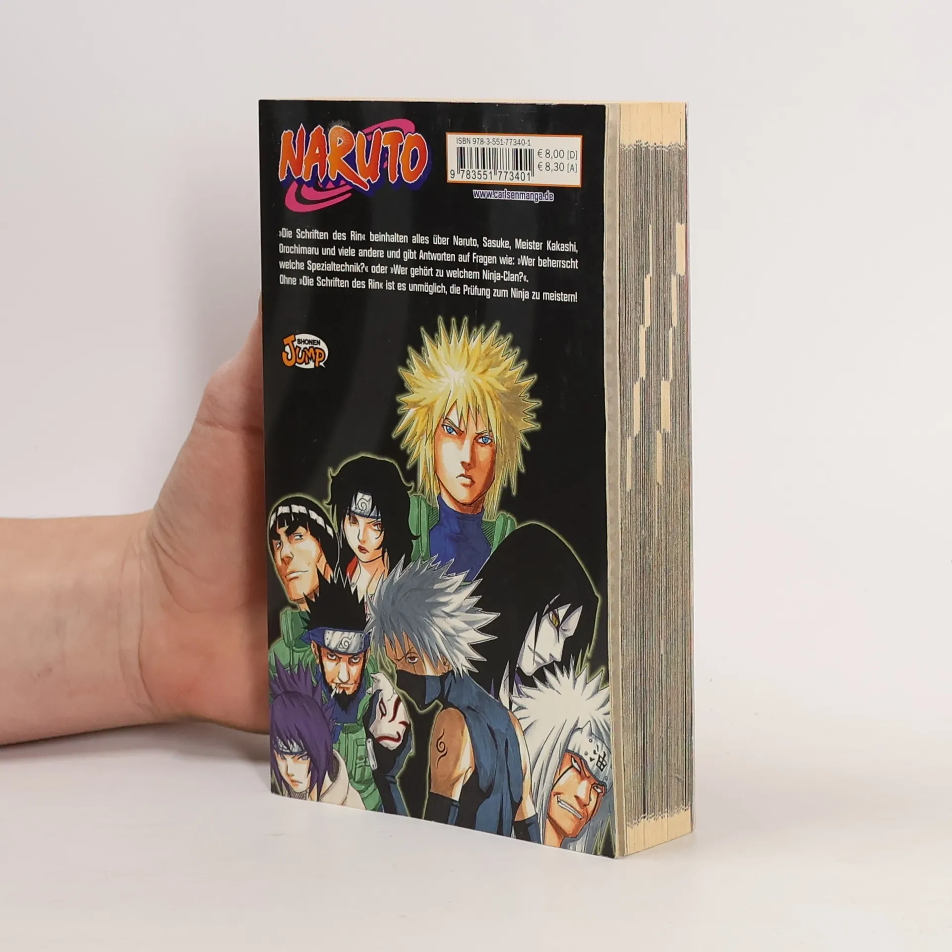 der ultimative Guide zur Serie! Auf rund 280 Seiten erzählen »Die Schriften des Rin« alles über die Hauptfiguren Naruto, Sasuke, Sakura, Meister Kakashi, Gaara, Orochimaru und viele andere. Wer beherrscht welche Spezialtechniken? Wer gehört zu welchem Ninja-Clan? Welches Ninja-Mädchen schwärmt für welchen Ninja-Jungen? Dies und noch viel mehr erfahrt ihr in der ersten Informationsschriftrolle aus der Feder von Star-Mangaka Masashi Kishimoto. Ohne »Die Schriften des Rin« ist es unmöglich, die Prüfung zum Ninja zu meistern!