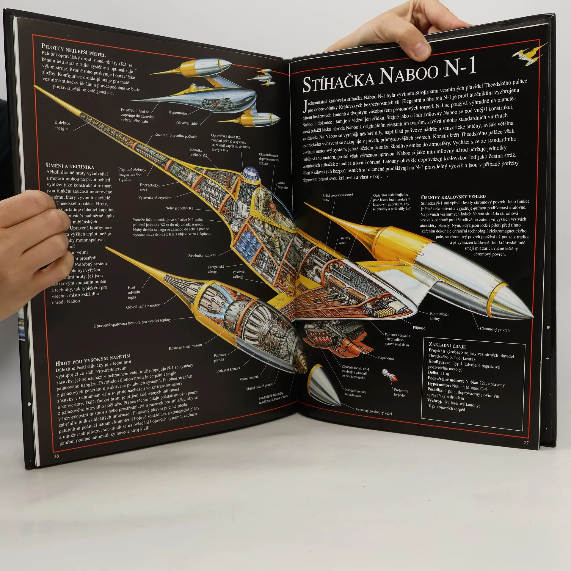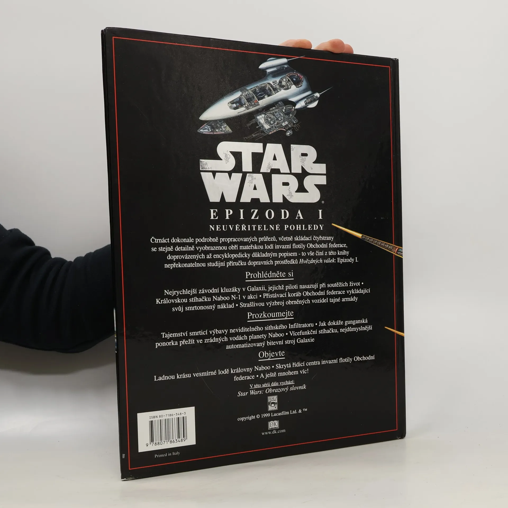 Čtrnáct dokonale podrobně propracovaných průřezů, včetně skládací čtyřstrany se stejně detailně vyobrazenou obří mateřskou lodí invazní flotily Obchodní federace, doprovázených až encyklopedicky důkladným popisem – to vše činí z této knihy nepřekonatelnou studijní příručku dopravních prostředků Hvězdných válek: Epizody I. Prohlédněte si: •Nejrychlejší závodní kluzáky v Galaxii, jejichž piloti nasazují při soutěžích život •Královskou stíhačku Naboo N-1 v akci •Přistávací koráb Obchodní federace vykládající svůj smrtonosný náklad •Strašlivou výzbroj obrněných vozidel tajné armády Prozkoumejte: •Tajemství smrtící výbavy neviditelného sithského Infiltratoru •Jak dokáže gunganská ponorka přežít ve zrádných vodách planety Naboo •Vícefunkční stíhačku, nejdůmyslnější automatizovaný bitevní stroj Galaxie Objevte: •Ladnou krásu vesmírné lodě královny Naboo •Skrytá řídící centra invazní flotily Obchodní federace •A ještě mnohem víc!