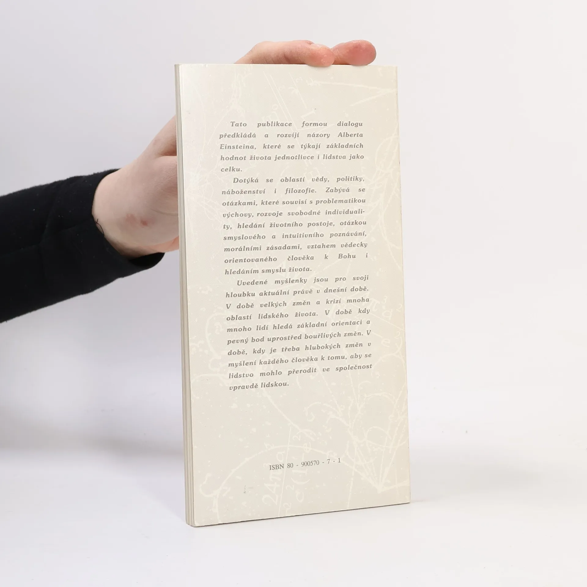 Tato publikace formou dialogu předkládá a rozvíjí názory A. Einsteina, které se týkají základních hodnot života jednotlivce i lidstva jako celku.