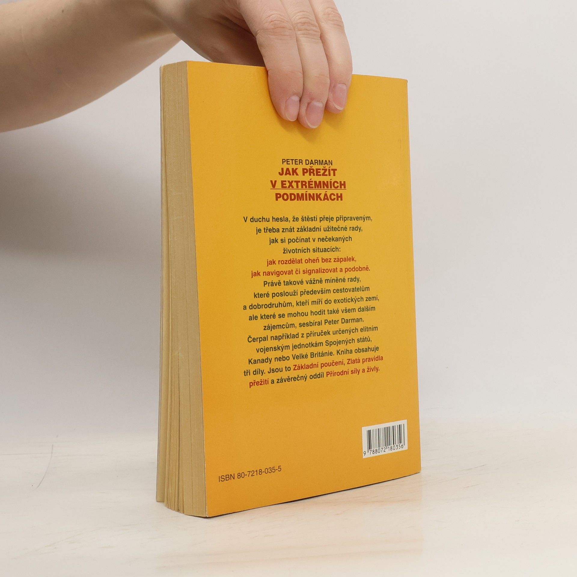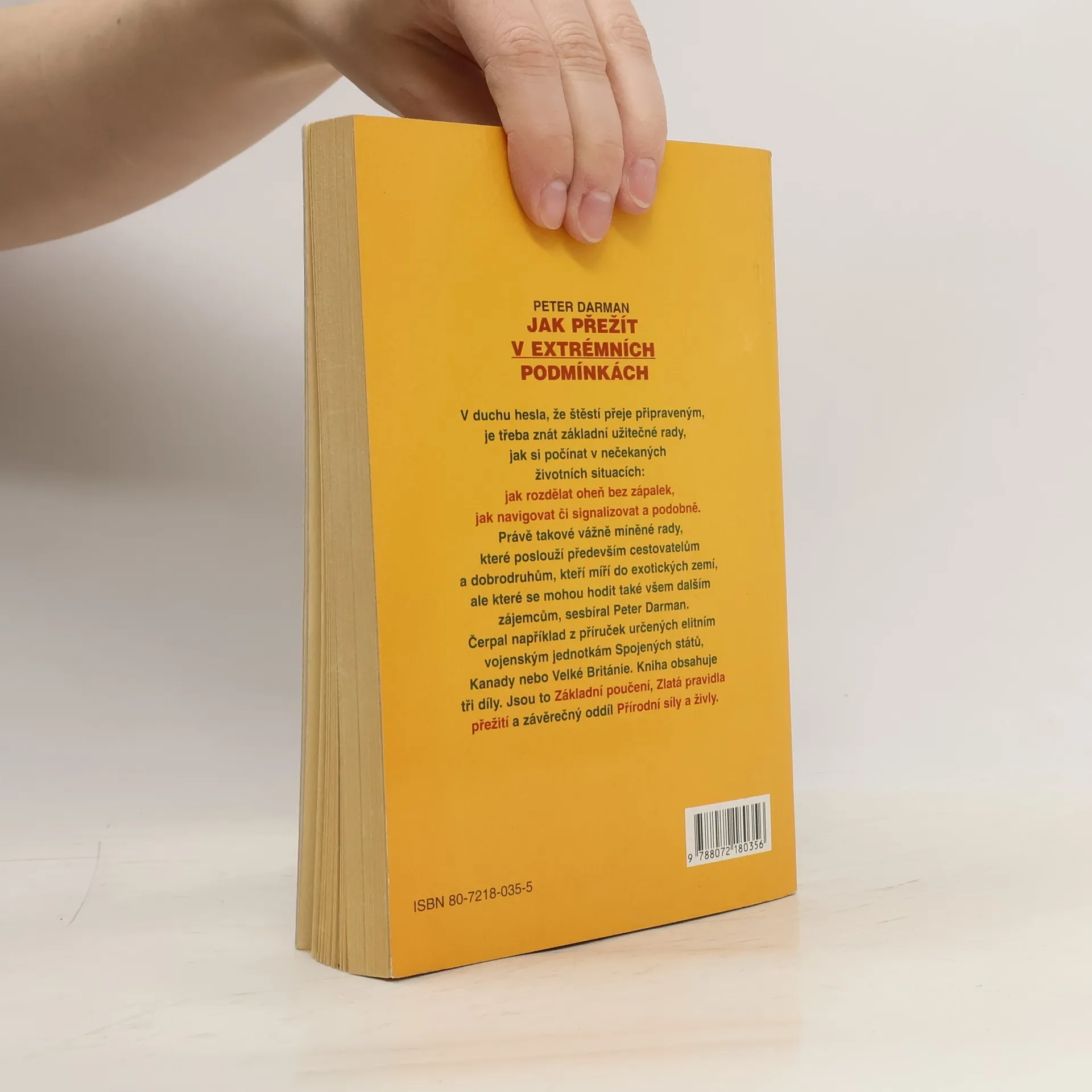 Rady, které poslouží cestovatelům do exotických zemí. Kniha je rozdělena do tří dílů: Základní poučení, Zlatá pravidla, Přírodní síly a živly. V duchu hesla, že štěstí přeje připraveným je třeba znát základní užitečné rady, jak si počínat v nečekaných životních situacích : jak rozdělat oheň bez zápalek, jak navigovat či signalizovat. Právě takové rady sesbíral Peter Darman. Čerpal například z příruček určeným elitním vojenským jednotkám Spojených států, Kanady nebo Velké Británie. Z anglického originálu, vydaného nakladatelstvím Brown Packaging Books Ltd, London přeložil Ing. Bruno Cempírek. Vydání první.