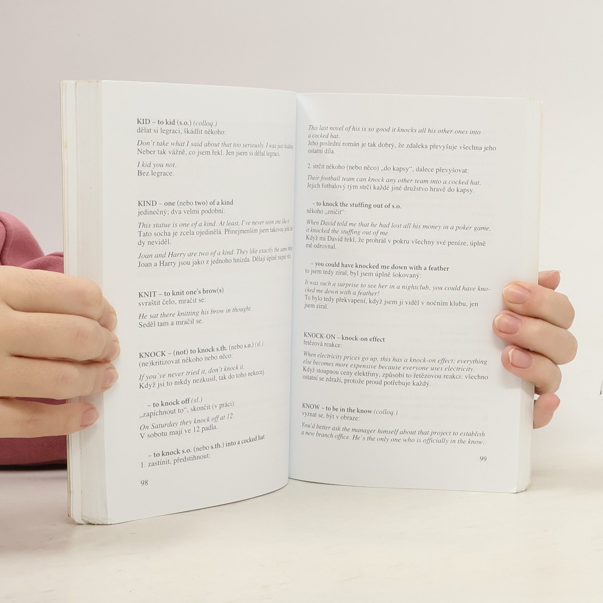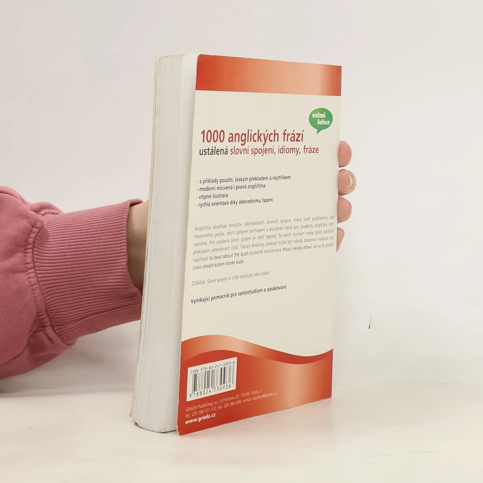 Angličtina obsahuje množství idiomatických slovních spojení, která tvoří podstatnou část hovorového jazyka. Jejich správné pochopení a používání bývá pro studenty angličtiny dost náročné. Pro ustálená slovní spojení je totiž typické, že jejich význam nelze zjistit pouhým překladem jednotlivých částí. Takový doslovný překlad může být někdy dokonce matoucí: tak například „to beat about the bush“ skutečně neznamená „tlouci okolo křoví“, ale je to prostě české „chodit kolem horké kaše“. Proto je třeba osvojovat si slovní spojení vždy jako celek. Tato kniha vám nabízí 1000 idiomatických a frazeologických spojení s českými překlady, které si můžete procvičovat a učit se je. Poslouží všem studentům, samoukům i těm, kdo si chtějí svou angličtinu zopakovat a zlepšit.