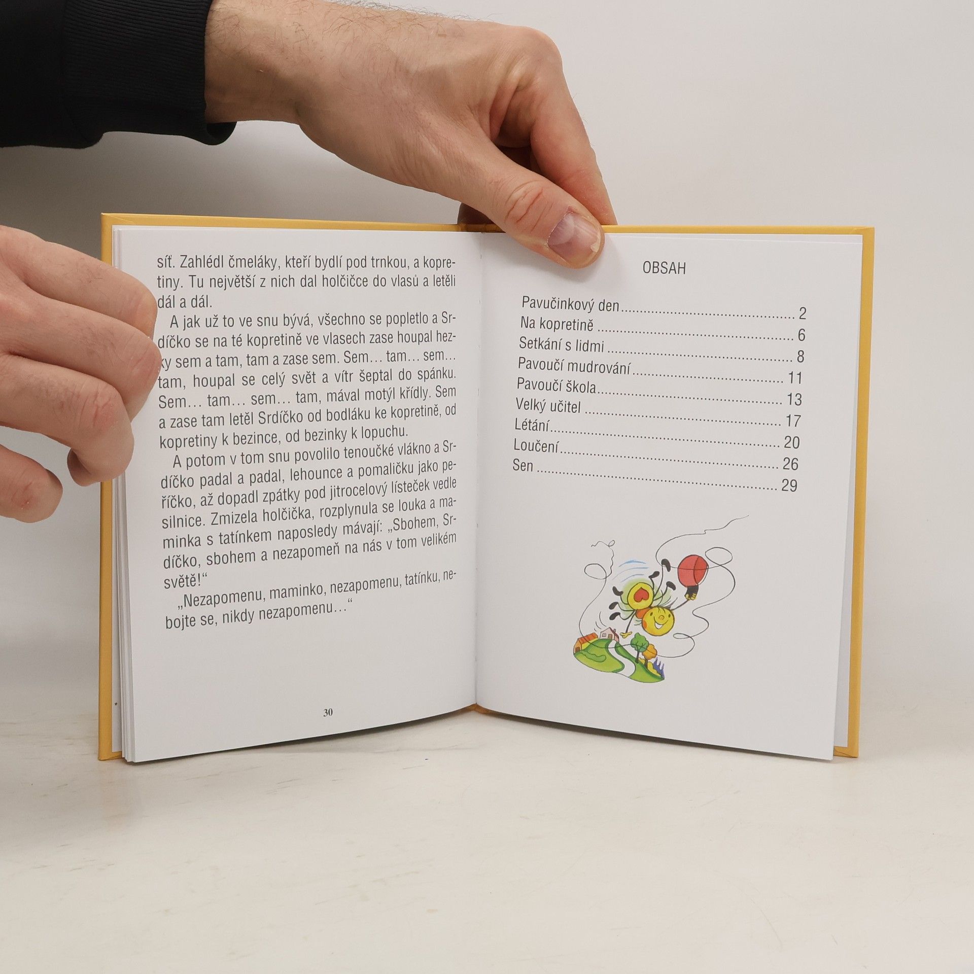Úryvek: Je ráno. Louka se pomalinku probouzí a první broučci a berušky vystrkují tykadla do ranního sluníčka. I pavouček Srdíčko je už vzhůru a pozoruje oblohu vymalovanou studánkovou modří, protkanou jen sem tam malým mráčkem. Takové dny má Srdíčko nejraději. Odmalinka jim říká pavučinkové.