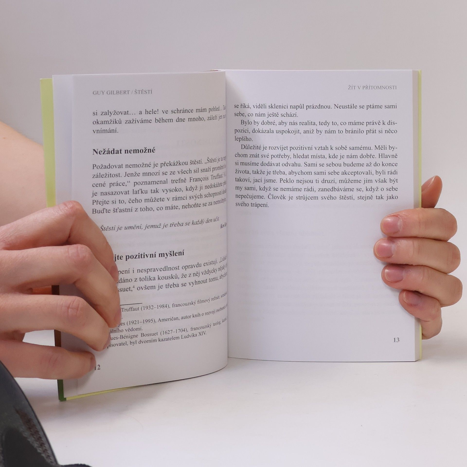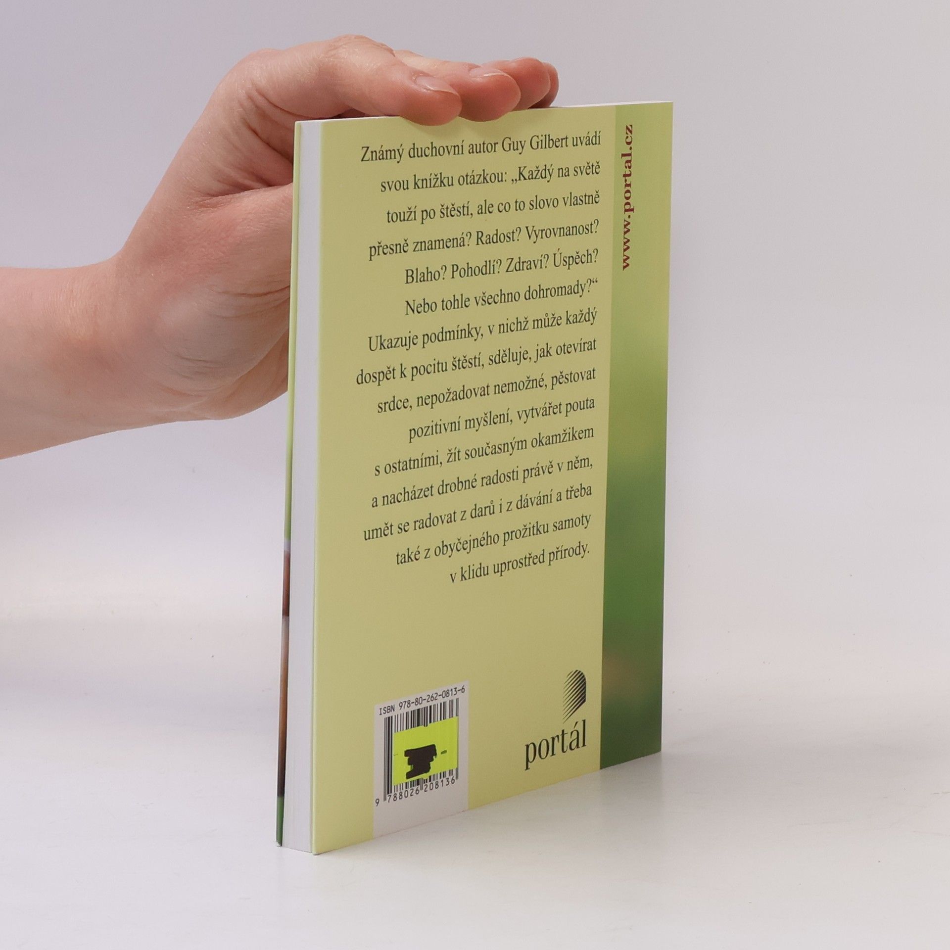 Knížka známého duchovního autora je uvedena otázkou: „Co opravdu je pro člověka štěstí? Radost? Potěšení? Pocit bezpečí? Zdraví? Bohatství? Toto všechno dohromady?“ Guy Gilbert ukazuje podmínky, v nichž může každý dospět k pocitu štěstí, sděluje, jak otevírat srdce, nepožadovat nemožné, pěstovat pozitivní myšlení, vytvářet pouta s ostatními, žít současným okamžikem a nacházet drobné radosti právě v něm, umět se radovat z darů i z dávání a třeba i z obyčejného prožitku samoty v klidu uprostřed přírody. Jeho slova míří ke všem generacím – lidem středního věku, seniorům i mladým