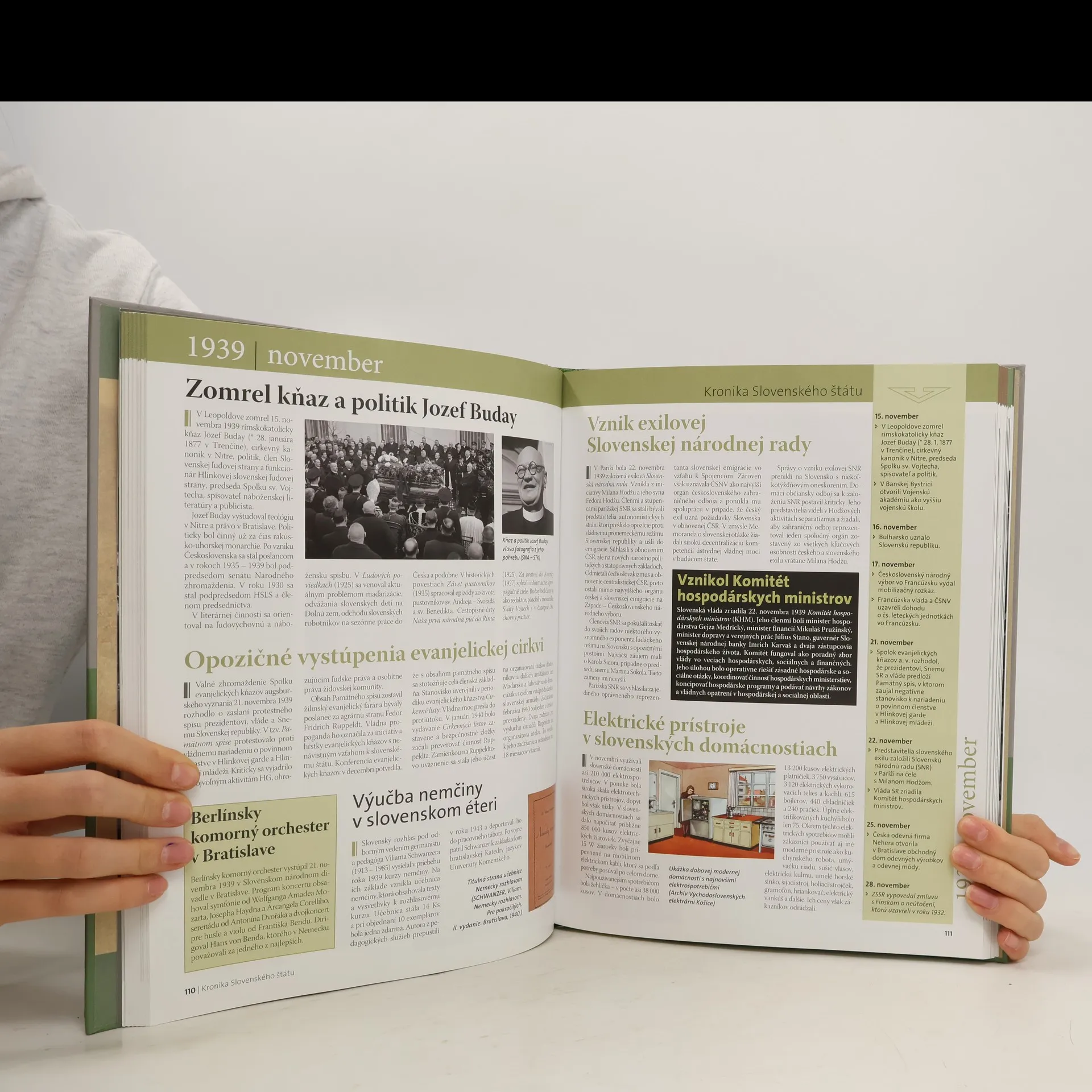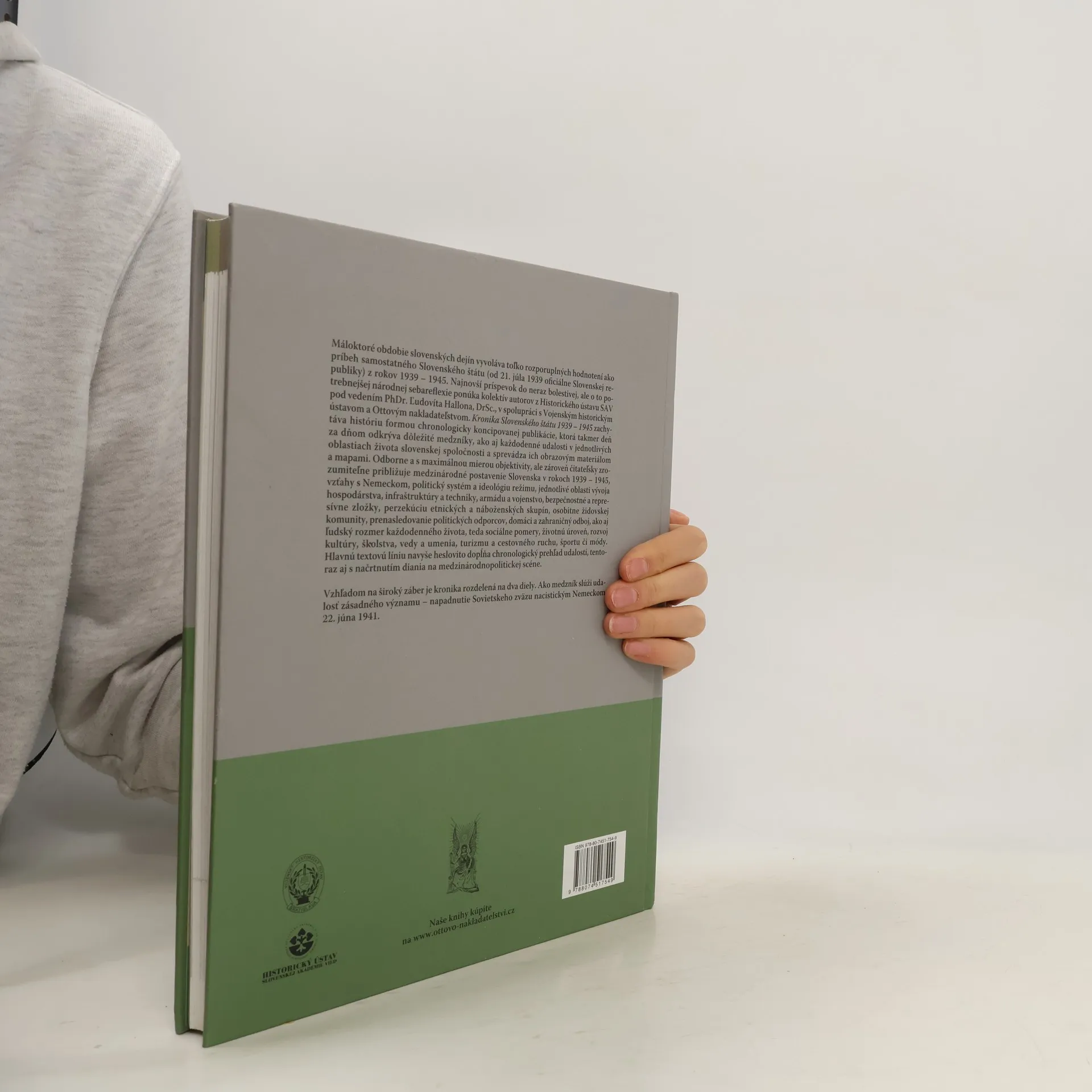 Máloktoré obdobie slovenských dejín vyvoláva toľko emocionálne nasýtených aj racionálne podložených hodnotení ako príbeh prvého samostatného štátu v rokoch 1939 - 1945. Slovenský štát, od 21. júla 1939 Slovenská republika, dostal rozporuplnosť už pri svojom zrode. Najnovší príspevok do národnej sebareflexie ponúka kolektív autorov z Historického ústavu SAV pod vedením PhDr. Ľudovíta Hallona, DrSc. v spolupráci s Vojenským historickým ústavom a Ottovým nakladateľstvom. Publikácia zachytáva históriu formou chronologicky koncipovanej kroniky, ktorá takmer deň za dňom odkrýva dôležité historické medzníky a každodenné udalosti v slovenskej spoločnosti, doplnené obrazovým materiálom a mapami. Odborne a objektívne, ale zároveň prístupne, kniha približuje medzinárodné postavenie Slovenska, vzťahy s Nemeckom, politický systém a ideológiu režimu, hospodárstvo, armádu, bezpečnostné zložky, perzekúciu etnických a náboženských skupín, politických odporcov, ako aj každodenný život, sociálne pomery, kultúru, školstvo, vedu a umenie. Hlavnú textovú líniu dopĺňa chronologický prehľad udalostí, vrátane medzinárodnopolitického diania. Kronika je rozdelená na dva diely, pričom ako medzník slúži napadnutie Sovietskeho zväzu nacistickým Nemeckom 22. júna 1941.