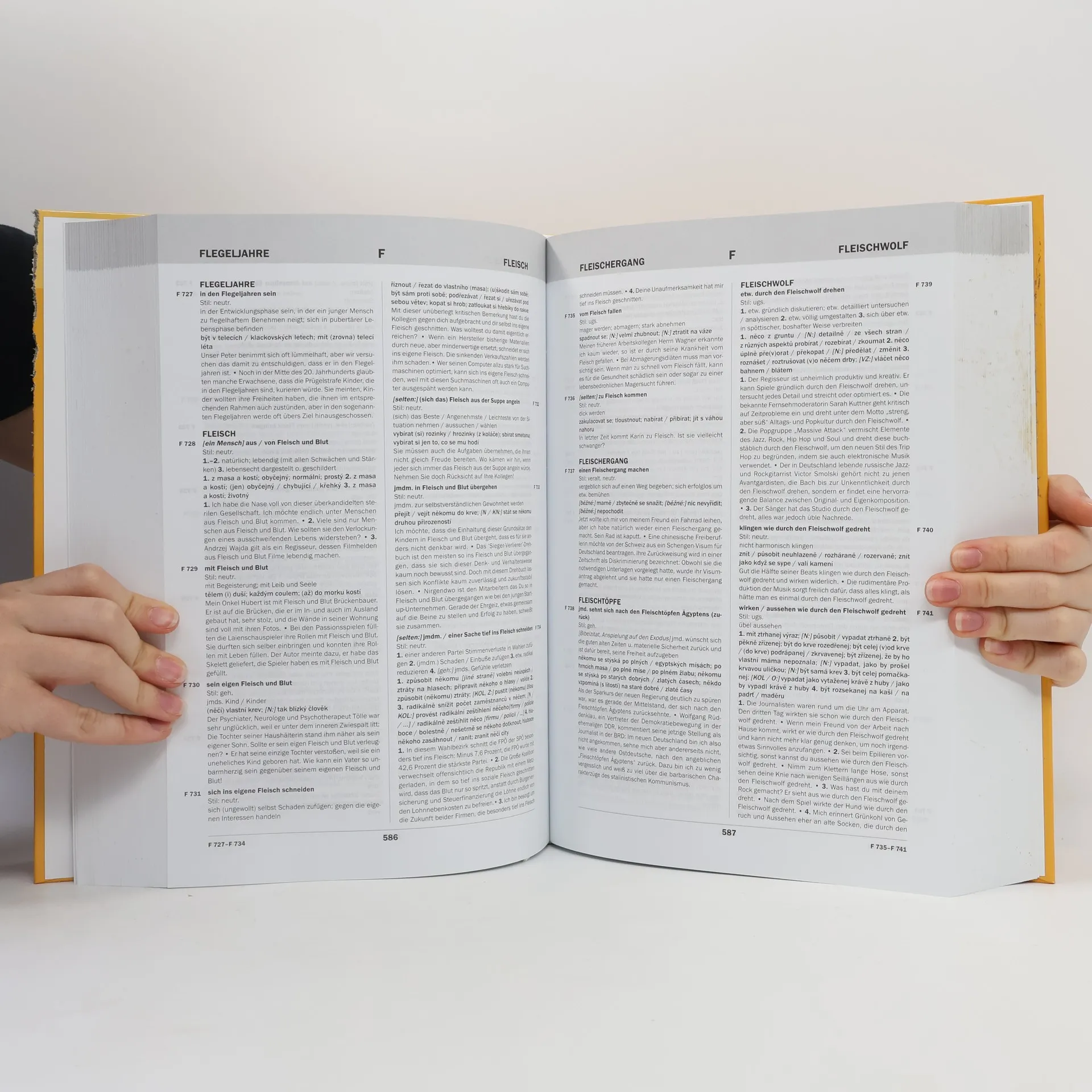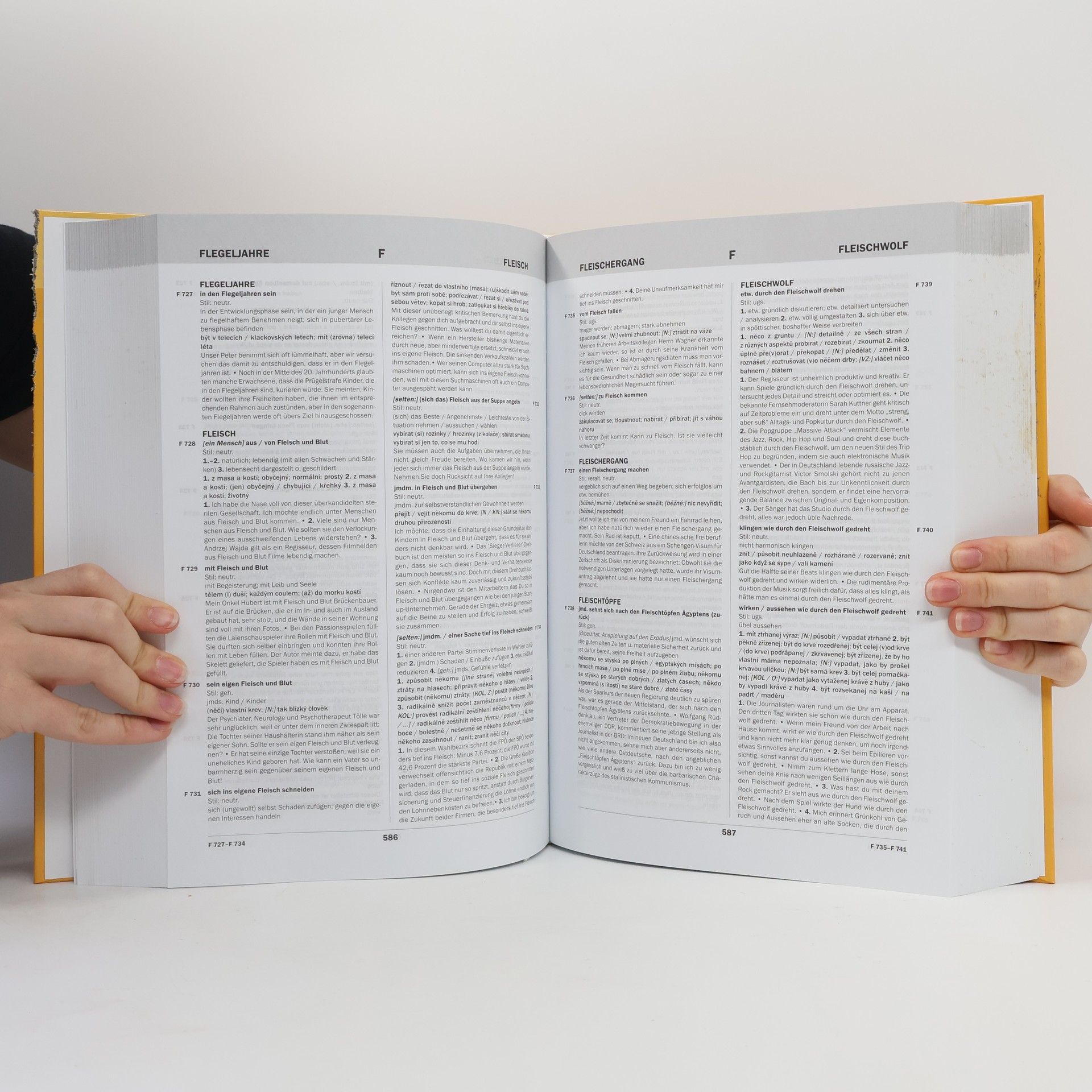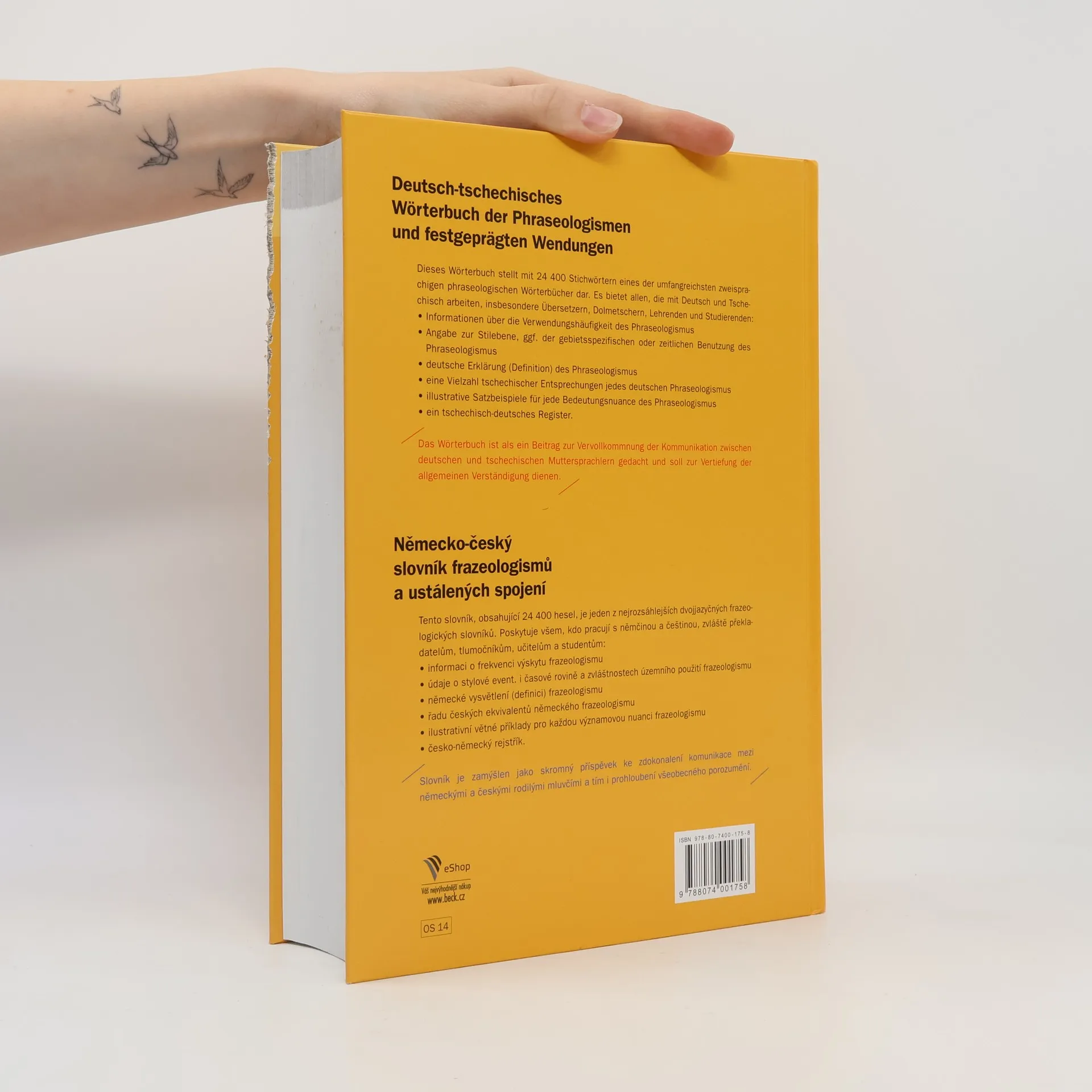 Tento slovník, obsahující 24 400 hesel, je jeden z nejrozsáhlejších dvojjazyčných frazeologických slovníků. Poskytuje všem, kdo pracují s němčinou a češtinou, zvláště překladatelům, tlumočníkům, učitelům a studentům: * informaci o frekvenci výskytu frazeologismu * údaje o stylové event. i časové rovině a zvláštnostech územního použití frazeologismu * německé vysvětlení (definici) frazeologismu * řadu českých ekvivalentů německého frazeologismu * ilustrativní větné příklady pro každou významovou nuanci frazeologismu * česko-německý rejstřík. Slovník je zamýšlen jako skromný příspěvek ke zdokonalení komunikace mezi německými a českými rodilými mluvčími a tím i prohloubení všeobecného porozumění.