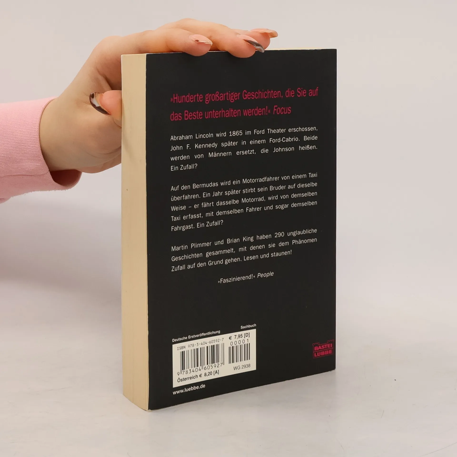 Abraham Lincoln wird 1865 im Ford Theater erschossen, John F. Kennedy später in einem Ford-Cabrio. Beide werden von Männern ersetzt, die Johnson heißen. Ein Zufall? Auf den Bermudas wird ein Motorradfahrer von einem Taxi überfahren. Ein Jahr später stirbt der Bruder des Mannes auf dieselbe Weise ═ er fährt dasselbe Motorrad, wird von demselben Taxi erfasst, mit demselben Fahrer und sogar demselben Fahrgast. Ein Zufall? Martin Plimmer und Brian King haben 290 unglaubliche Geschichten gesammelt, mit denen sie dem Phänomen Zufall auf den Grund gehen. Lesen und staunen!