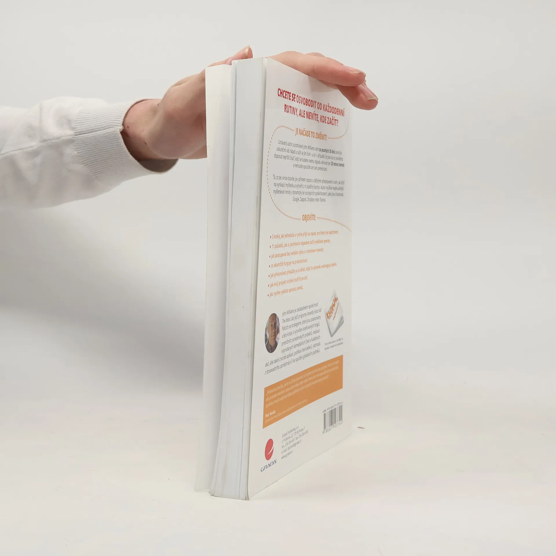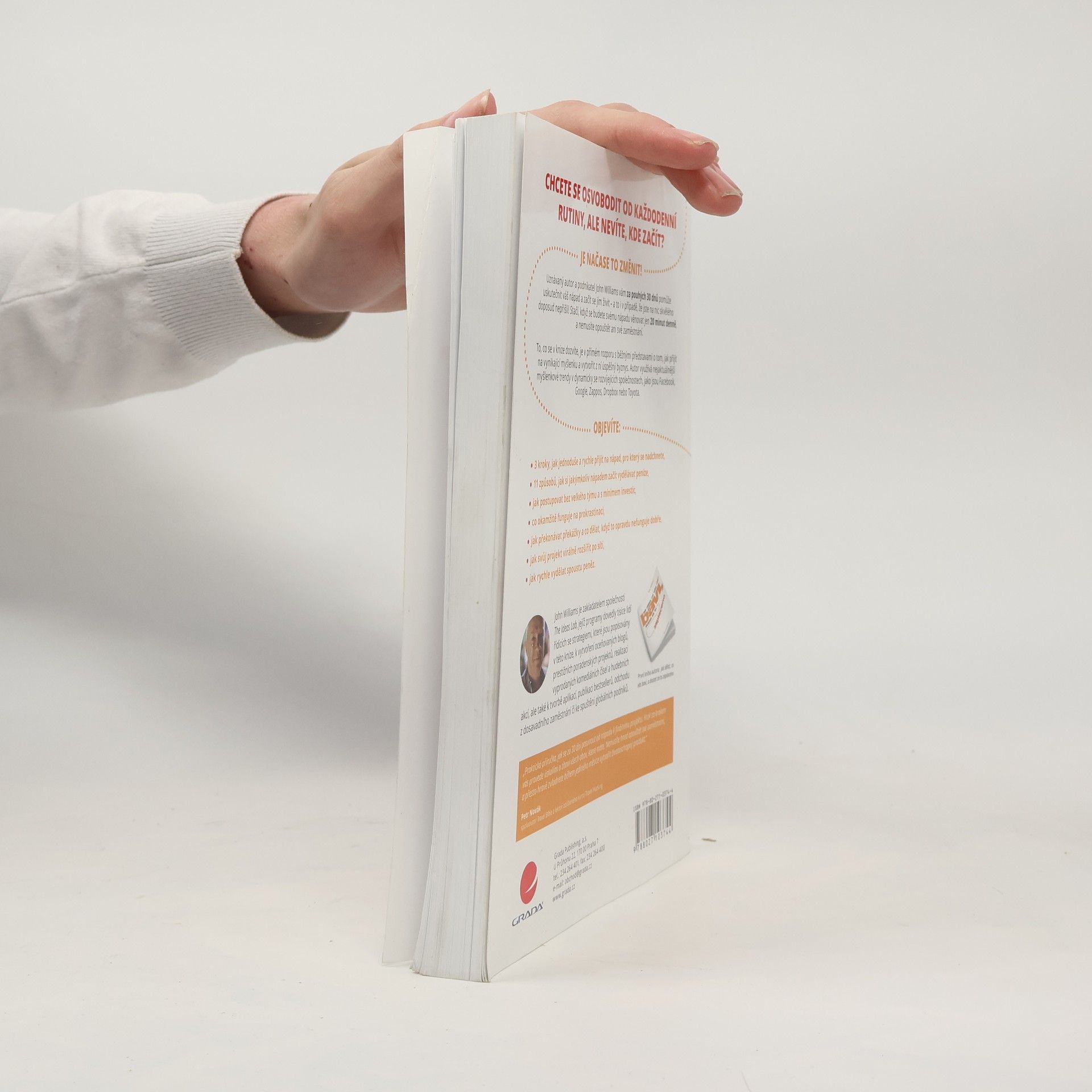CHCETE SE OSVOBODIT OD KAŽDODENNÍ RUTINY, ALE NEVÍTE, KDE ZAČÍT? Je načase to změnit! Uznávaný autor a podnikatel John Williams vám za pouhých 30 dnů pomůže uskutečnit váš nápad a začít se jím živit – a to i v případě, že jste na nic skvělého doposud nepřišli! Stačí, když se budete svému nápadu věnovat jen 20 minut denně, a nemusíte opouštět ani své zaměstnání. To, co se v knize dozvíte, je v přímém rozporu s běžnými představami o tom, jak přijít na vynikající myšlenku a vytvořit z ní úspěšný byznys. Autor využívá nejaktuálnější myšlenkové trendy v dynamicky se rozvíjejících společnostech, jako jsou Facebook, Google, Zappos, Dropbox nebo Toyota. Objevíte: 3 kroky, jak jednoduše a rychle přijít na nápad, pro který se nadchnete, 11 způsobů, jak si jakýmkoliv nápadem začít vydělávat peníze, jak postupovat bez velkého týmu a s minimem investic, co okamžitě funguje na prokrastinaci, jak překonávat překážky a co dělat, když to opravdu nefunguje dobře, jak svůj projekt virálně rozšířit po síti, jak rychle vydělat spoustu peněz.