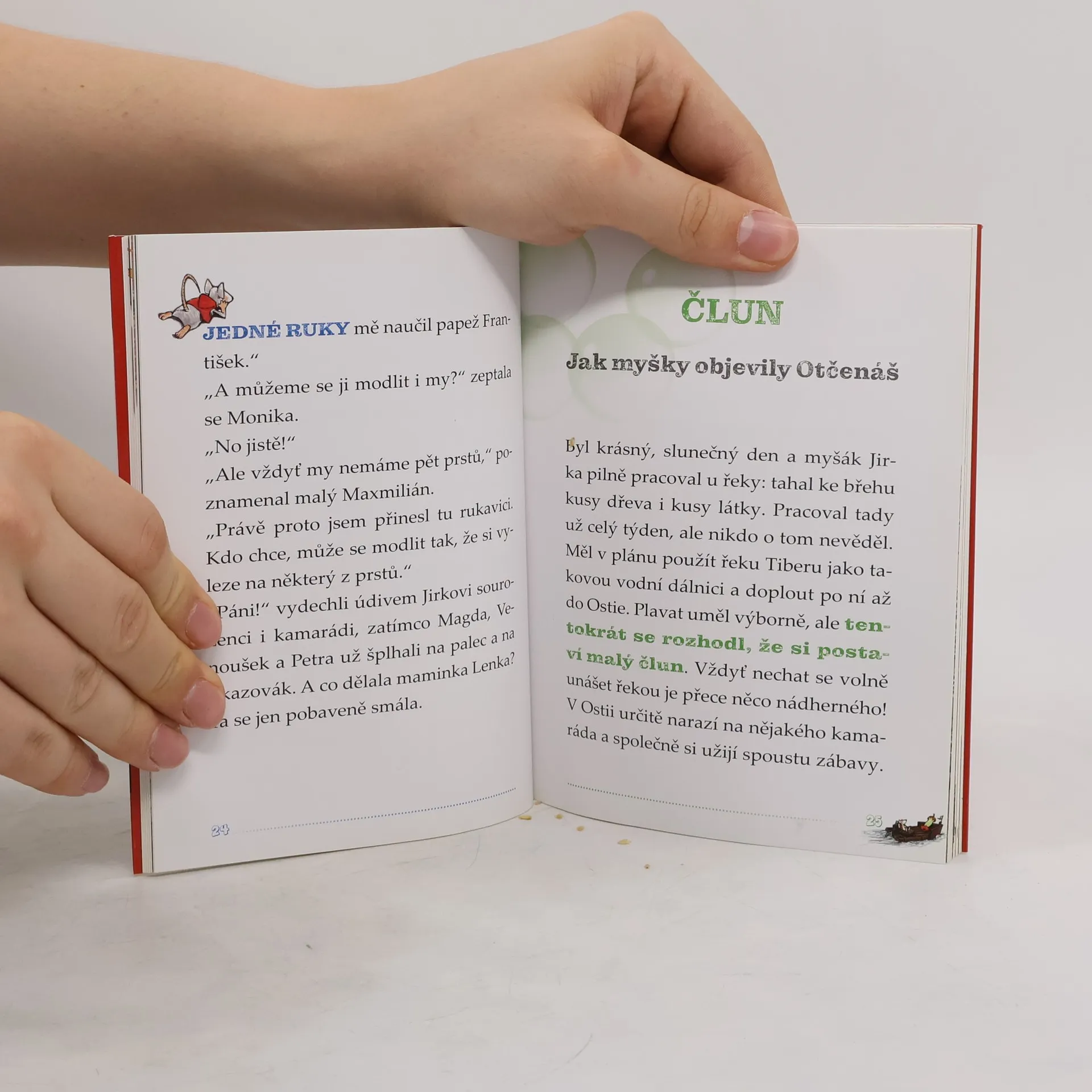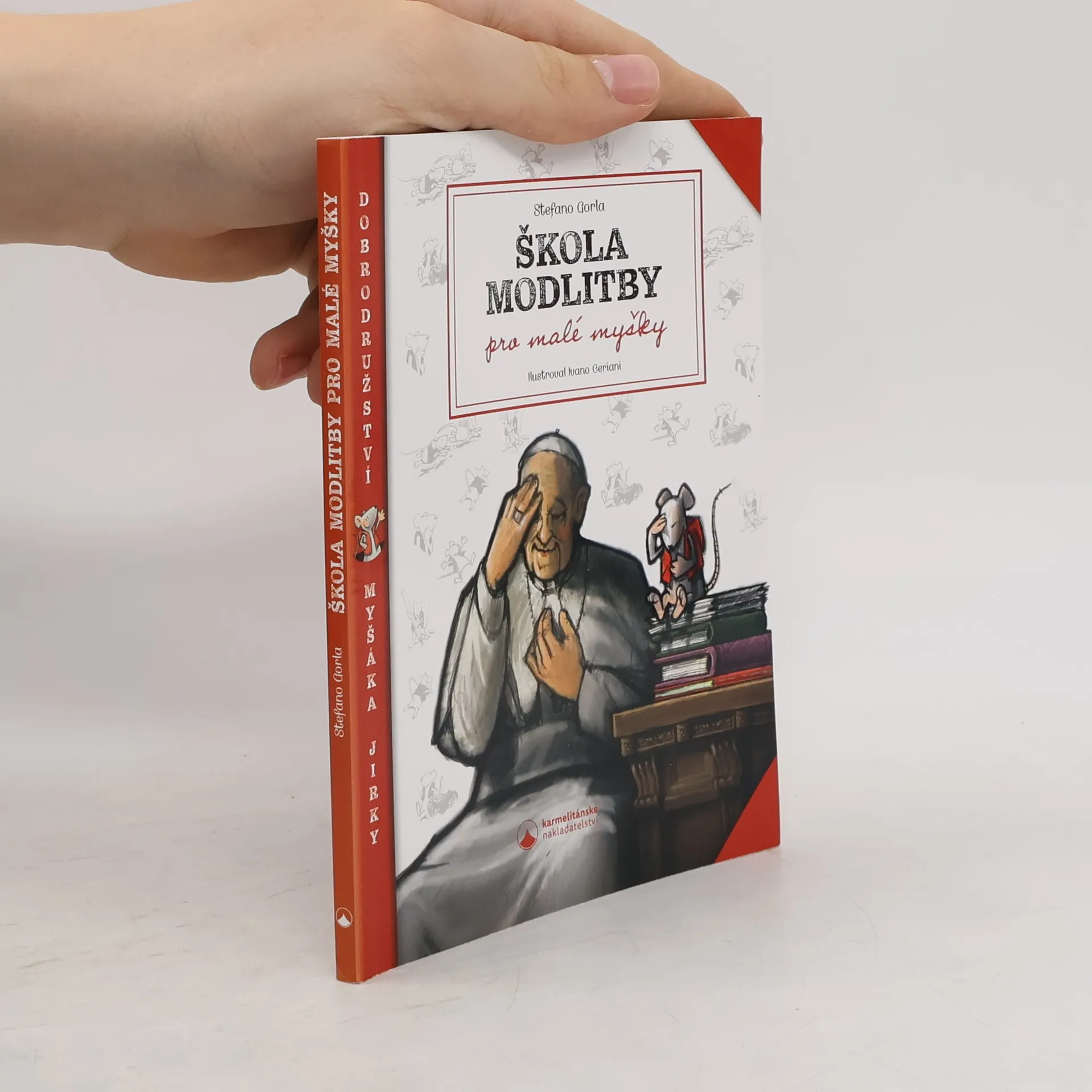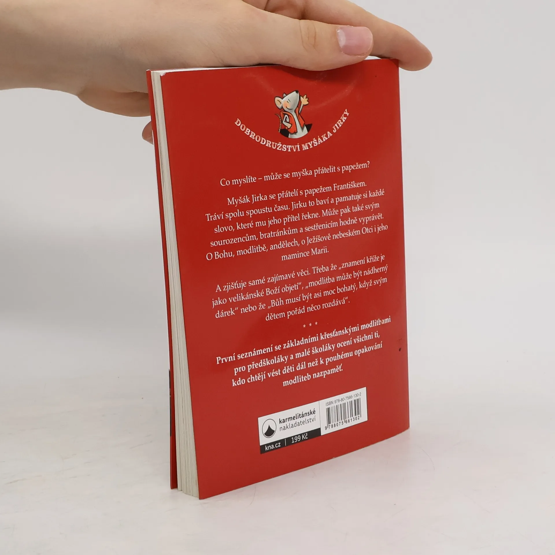 Co myslíte – může se myška přátelit s papežem? Myšák Jirka se přátelí s papežem Františkem. Tráví spolu spoustu času. Jirku to baví a pamatuje si každé slovo, které mu jeho přítel řekne. Může pak také svým sourozencům, bratránkům a sestřenicím hodně vyprávět. O Bohu, modlitbě, andělech, o Ježíšově nebeském Otci i jeho mamince Marii. A zjišťuje samé zajímavé věci. Třeba že „znamení kříže je jako velikánské Boží objetí“, „modlitba může být nádherný dárek“ nebo že „Bůh musí být asi moc bohatý, když svým dětem pořád něco rozdává“. * * * První seznámení se základními křesťanskými modlitbami pro předškoláky a malé školáky ocení všichni ti, kdo chtějí vést děti dál než k pouhému opakování modliteb nazpaměť.