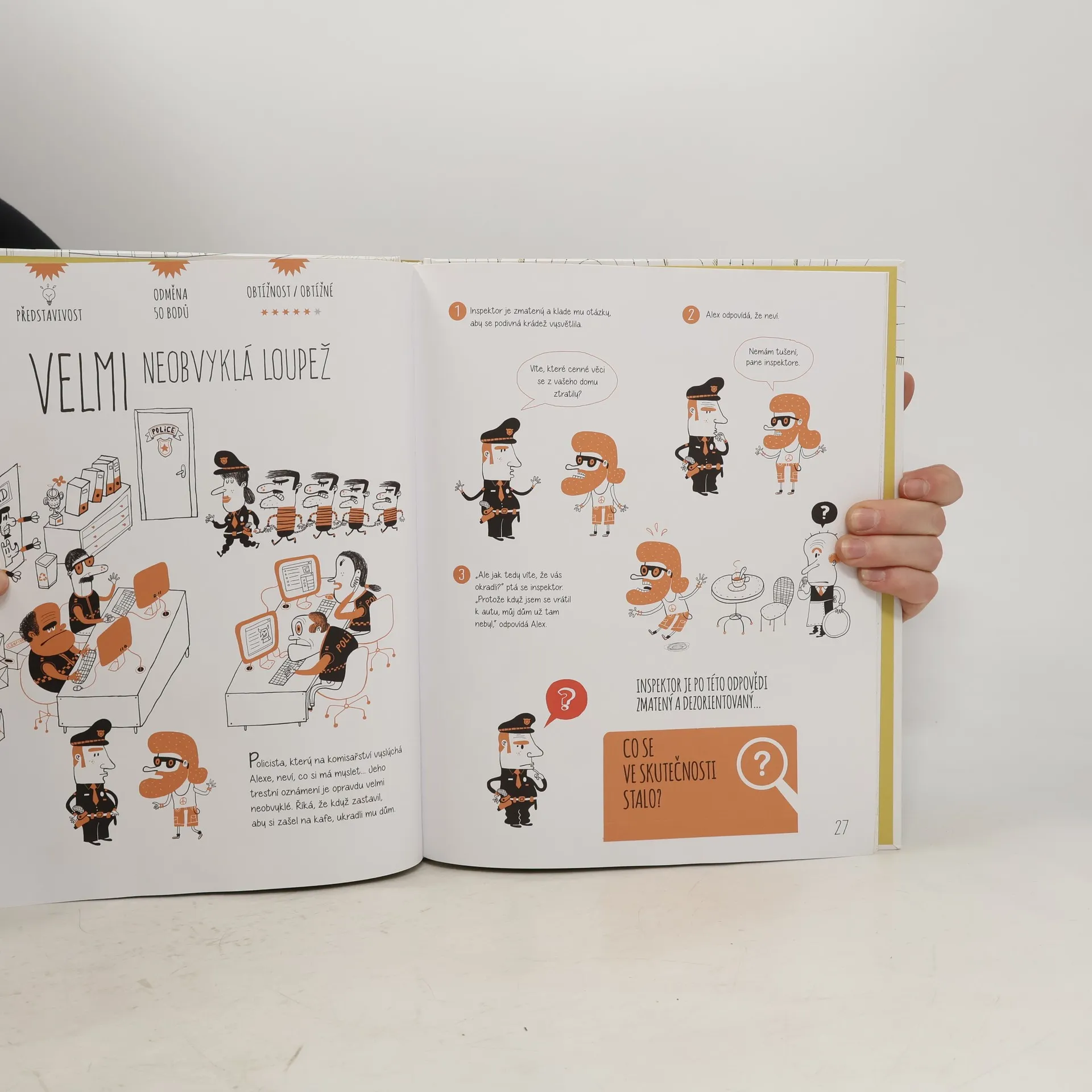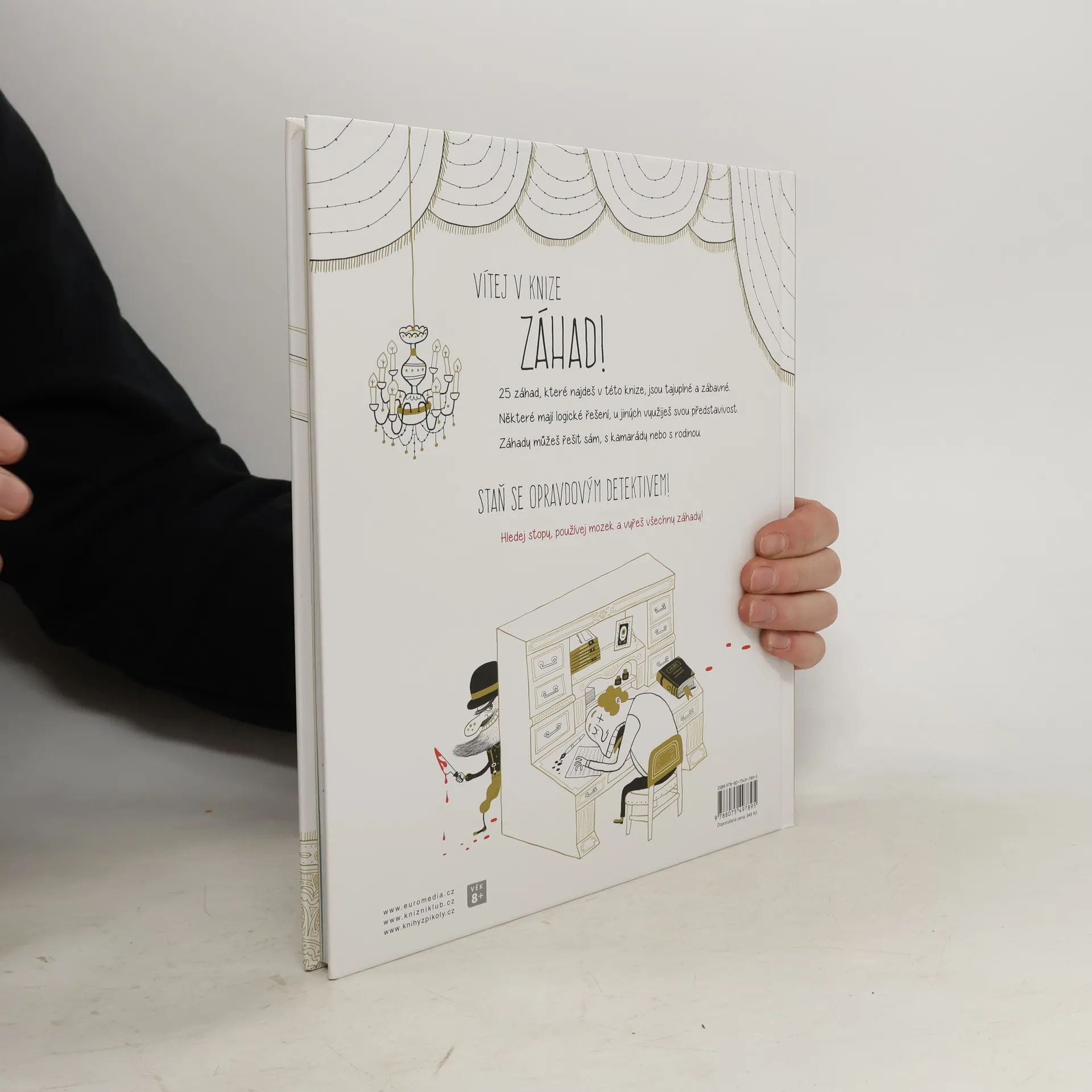 Neexistuje kniha, která by tě bavila víc, detektive. Vítej v knize záhad! Přijdeš na kloub 25 tajuplným případům? Některé mají logické řešení, u jiných využiješ své představivosti. A hlavně – hledej v zábavných obrázcích, a stopu máš nadosah. Záhady můžeš řešit sám, s kamarády nebo s celou rodinou. Staň se opravdovým detektivem! Hledej stopy, používej mozek a vyřeš všechny záhady. Věnováno dětem od 8 let a jejich rodičům, kteří mají chuť přicházet na kloub záhadám.