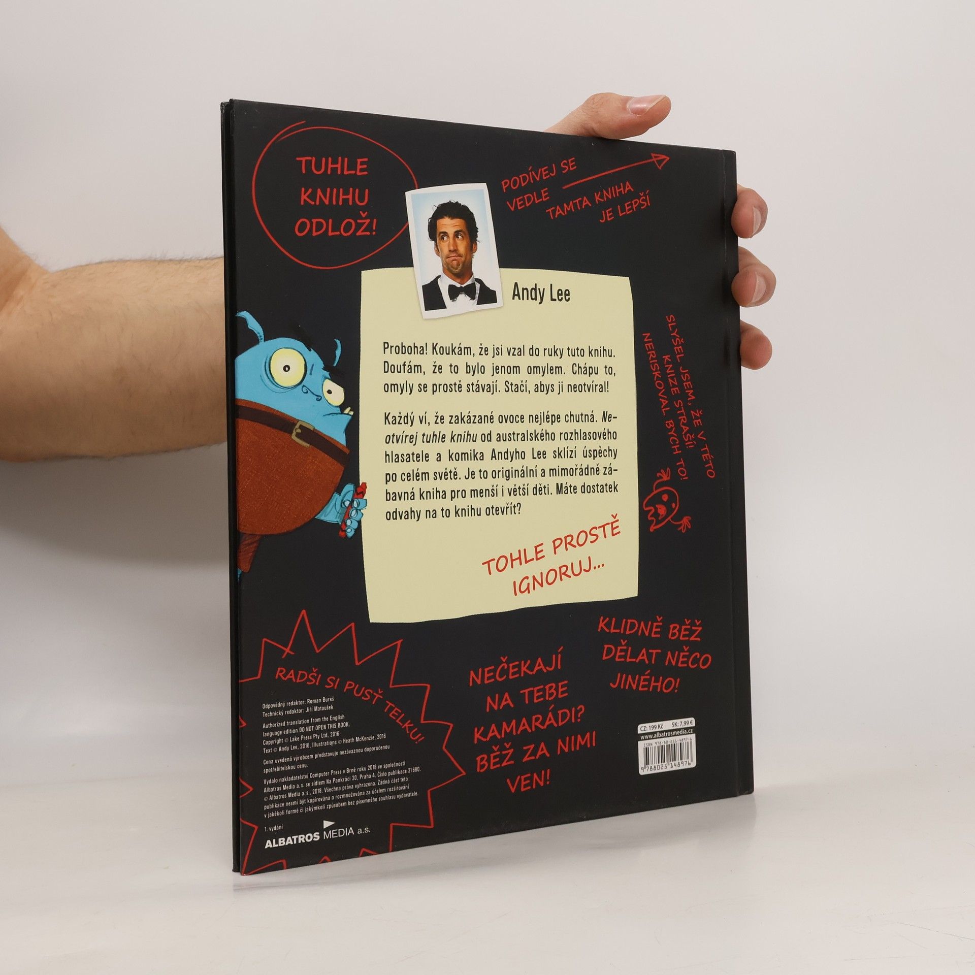 Proboha! Koukám, že jsi vzal do ruky tuto knihu. Doufám, že to bylo jenom omylem. Chápu to, omyly se prostě stávají. Stačí, abys ji neotvíral! A co se stane, když ji náhodou otevřeš? Každý ví, že zakázané ovoce nejlépe chutná. Neotvírej tuhle knihu od australského rozhlasového hlasatele a komika Andyho Lee sklízí úspěchy po celém světě. Je to originální a mimořádně zábavná kniha pro menší i větší děti. Máte dostatek odvahy na to knihu otevřít?