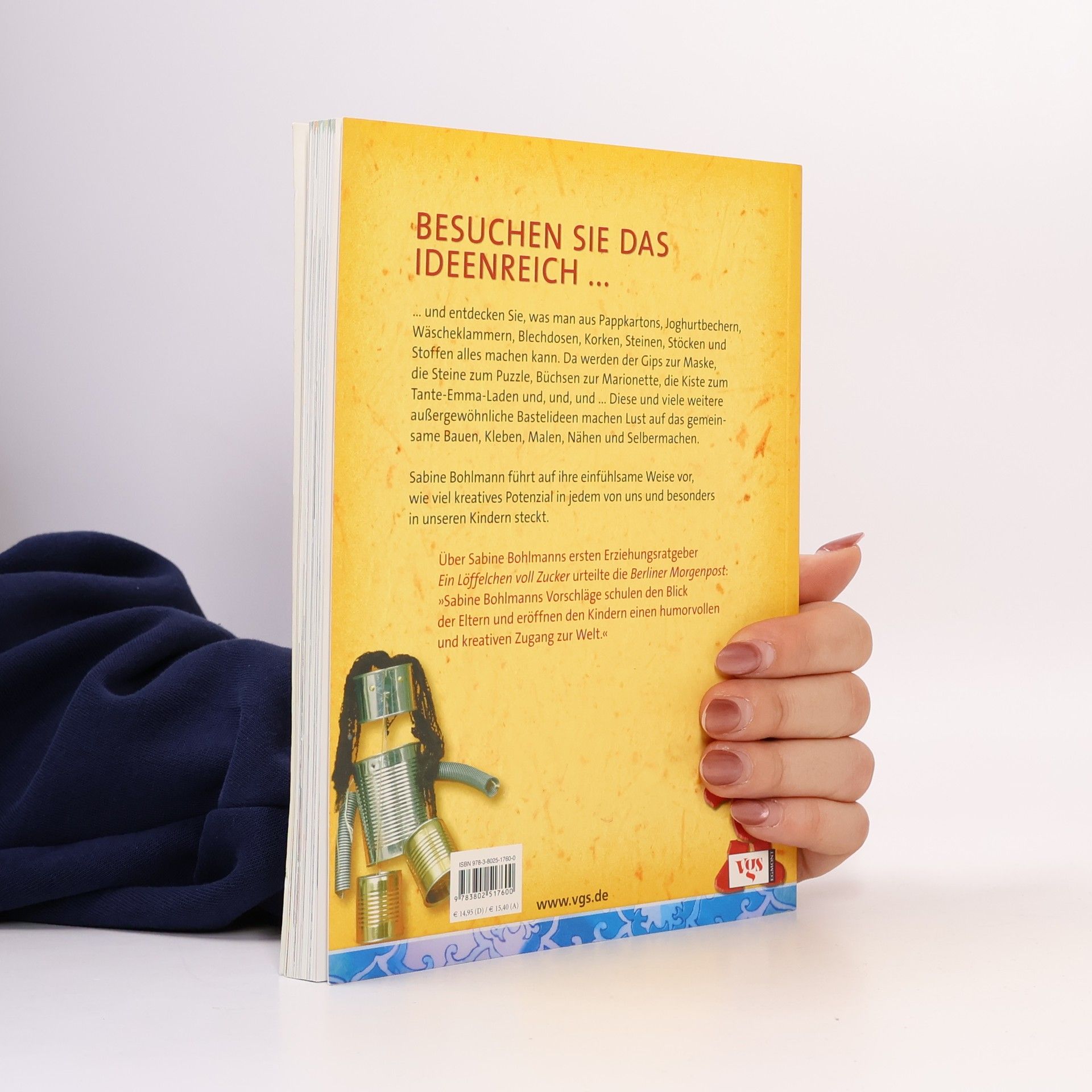 Besuchen Sie das Ideenreich. . und entdecken Sie, was man aus Pappkartons, Joghurtbechern, Wäscheklammern, Blechdosen, Korken, Steinen, Stöcken und Stoffen alles machen kann. Da werden der Gips zur Maske, die Steine zum Puzzle, Büchsen zur Marionette, die Kiste zum Tante-Emma-Laden und, und, und. Diese und viele weitere außergewöhnliche Bastelideen machen Lust auf das gemeinsame Bauen, Kleben, Malen, Nähen und Selbermachen. Sabine Bohlmann führt auf ihre einfühlsame Weise vor, wie viel kreatives Potenzial in jedem von uns und besonders in unseren Kindern steckt.