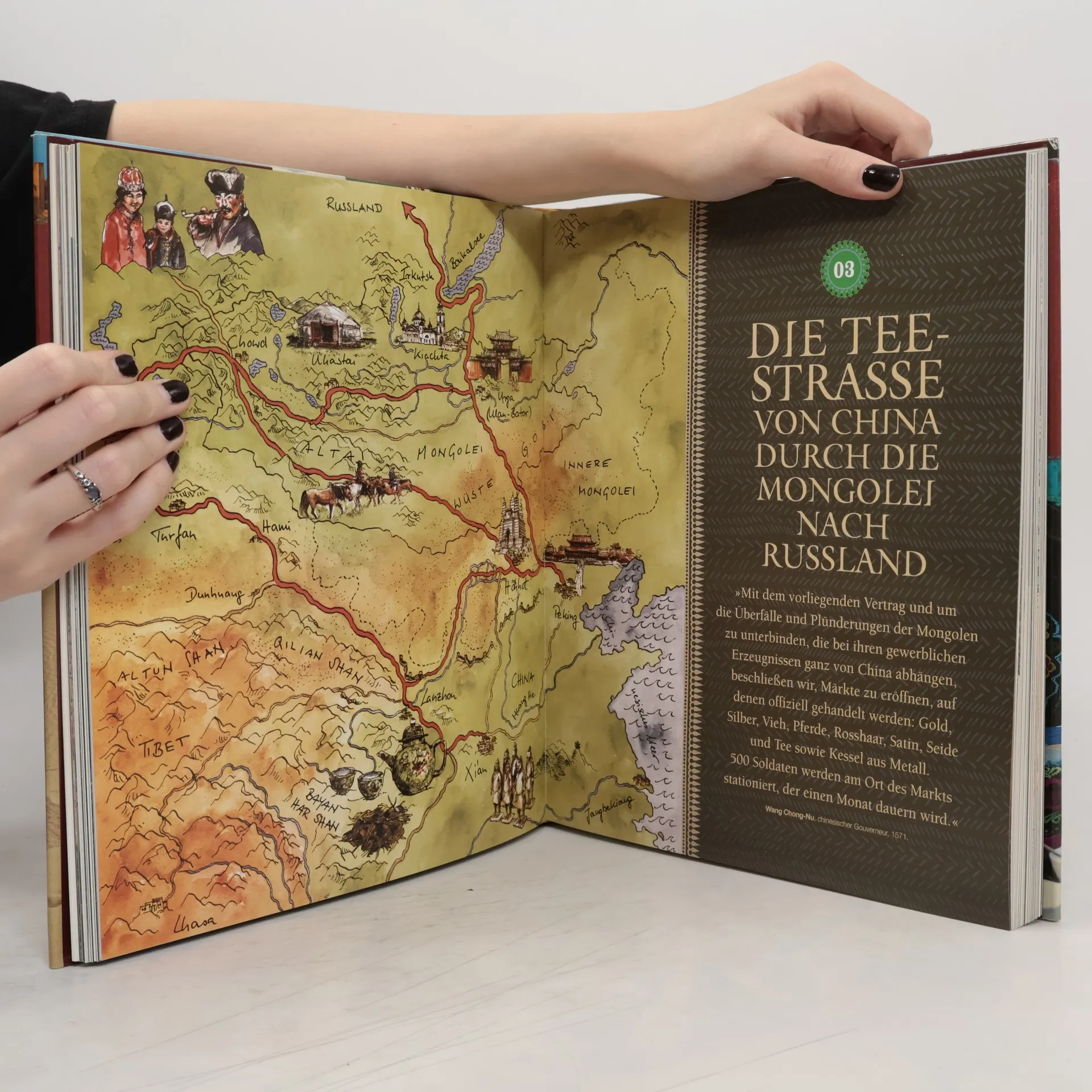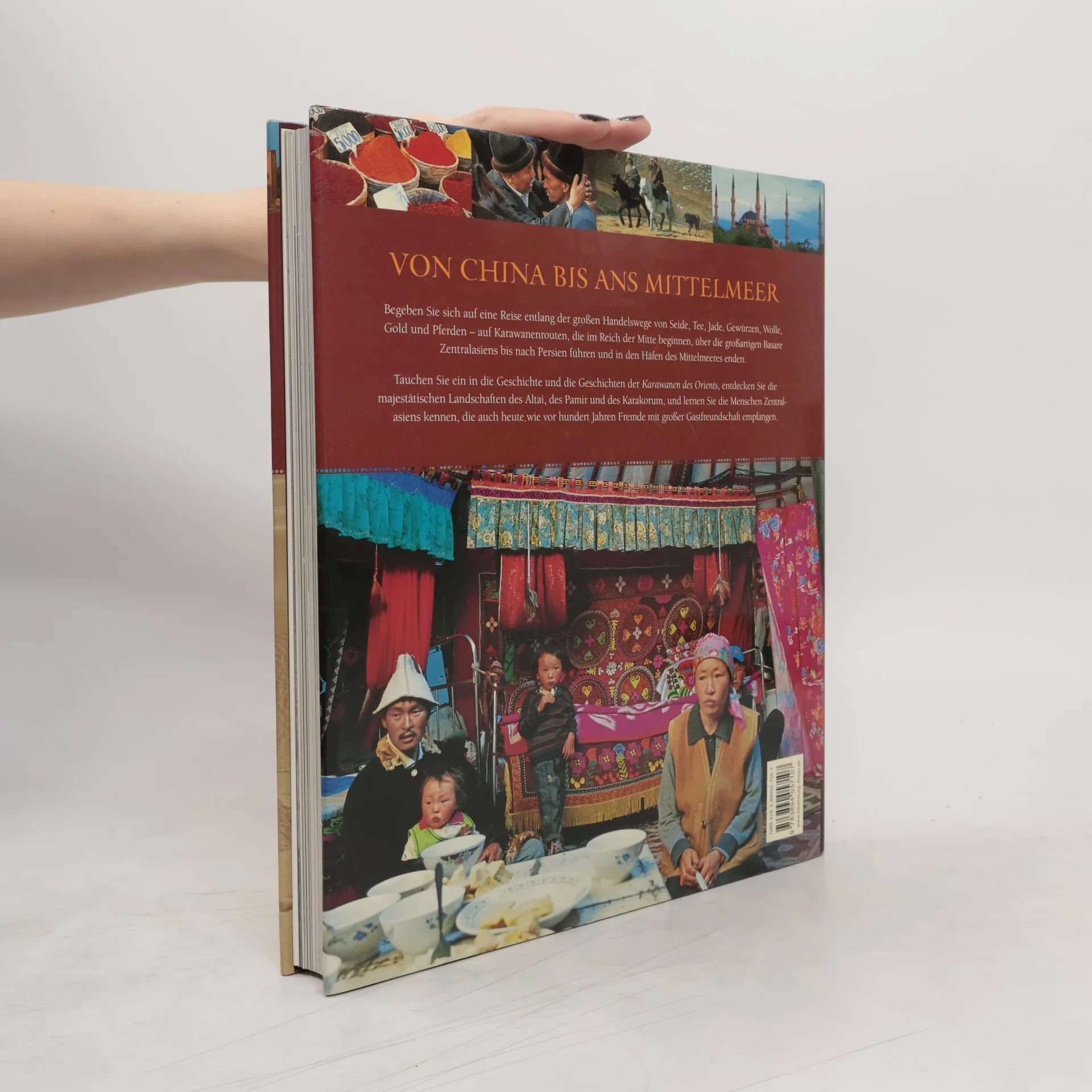 Begeben Sie sich auf eine Reise entlang der großen Handelswege der Seide, des Tees, der Jade, der Gewürze, der Wolle, des Goldes und der Pferde – auf Karawanenrouten, die im Reich der Mitte beginnen, über die großartigen Basare Zentralasiens bis nach Persien führen und in den Häfen des Mittelmeeres enden.