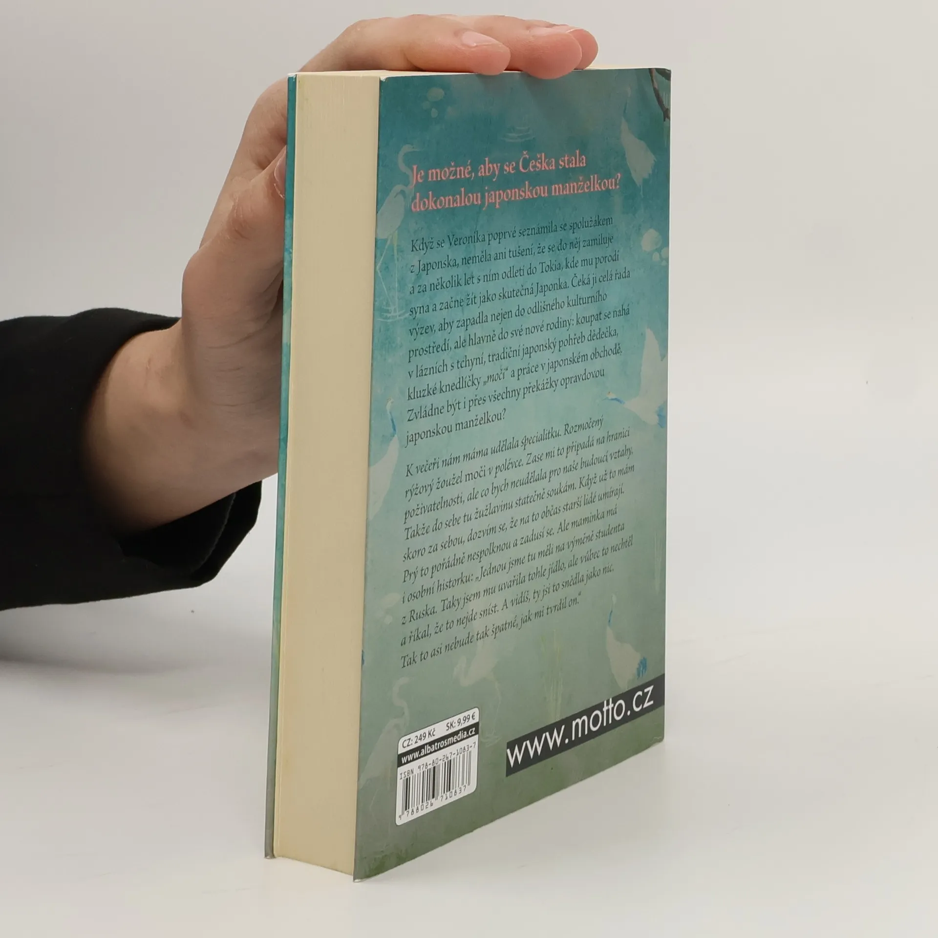 Když se Veronika poprvé seznámila se spolužákem z Japonska, neměla ani tušení, že se do něj zamiluje a za několik let s ním odletí do Tokia, kde mu porodí syna a začne žít jako skutečná Japonka. Čeká ji celá řada výzev, aby zapadla nejen do odlišného kulturního prostředí, ale hlavně do své nové rodiny: koupat se nahá v lázních s tchyní, tradiční japonský pohřeb dědečka, kluzké knedlíčky „moči“ a práce v japonském obchodě. Zvládne být i přes všechny překážky opravdovou japonskou manželkou? K večeři nám máma udělala specialitku. Rozmočený rýžový žoužel moči v polévce. Zase mi to připadá na hranici poživatelnosti, ale co bych neudělala pro naše budoucí vztahy. Takže do sebe tu žužlavinu statečně soukám. Když už to mám skoro za sebou, dozvím se, že na to občas starší lidé umírají. Prý to pořádně nespolknou a zadusí se. Ale maminka má i osobní historku: „Jednou jsme tu měli na výměně studenta z Ruska. Taky jsem mu uvařila tohle jídlo, ale vůbec to nechtěl a říkal, že to nejde sníst. A vidíš, ty jsi to snědla jako nic. Tak to asi nebude tak špatné, jak mi tvrdil on.“