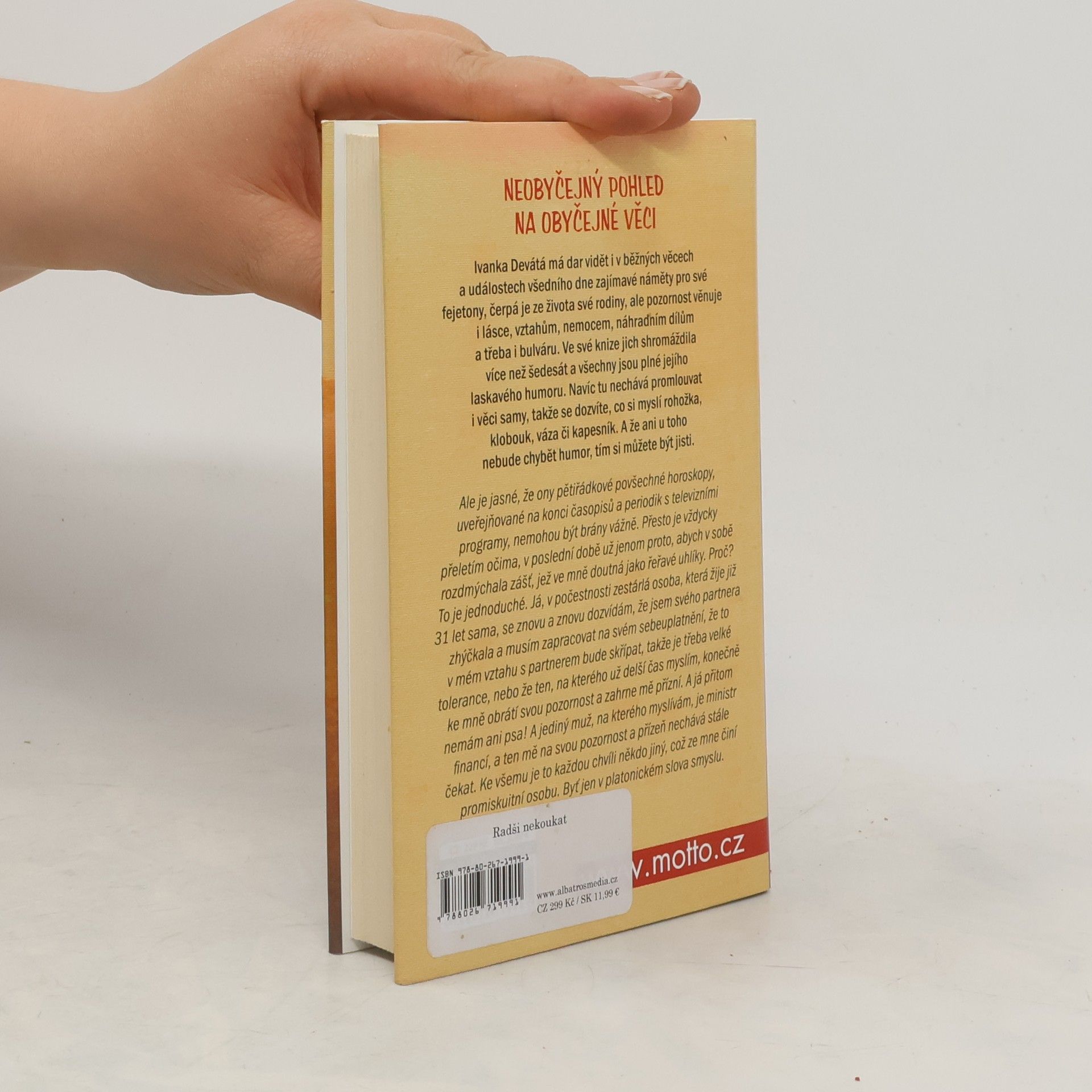 Kniha fejetonů ze života a o životě. Autorka se věnuje lásce, vztahům, společenským jevům, médiím... a to vše glosuje se svým typickým humorným nadhledem.Šedesát úsměvných a humorně pojatých fejetonů popisuje témata z každodenního života. Občas se autorka inspiruje vlastní rodinou, jindy se zaměřuje na typické jevy dnešní společnosti, ale také vzpomíná na svůj vlastní život. Dokonce nechává promlouvat věci - od rohožky až po suroviny na bramborový salát. Díky notné dávce smyslu pro humor je i drobná kritika pojatá s nadhledem. Zkrátka kniha o obyčejných věcech popisovaných z neobyčejného pohledu Ivanky Deváté.
