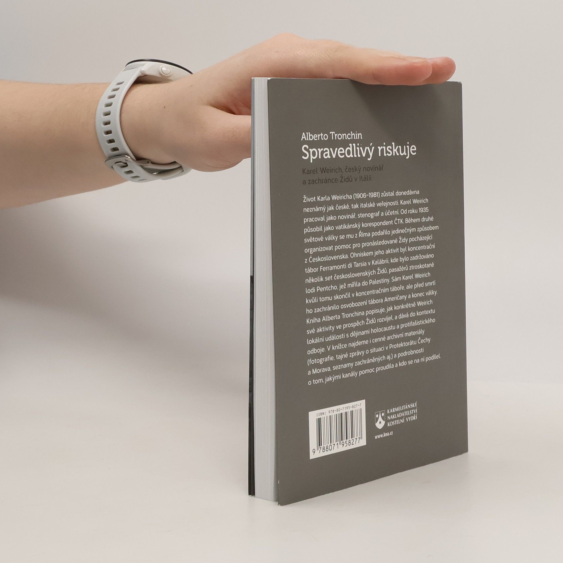 Karel Weirich, český novinář a zachránce Židů v Itálii. Život Karla Weiricha (1906–1981) zůstal donedávna neznámý jak české, tak italské veřejnosti. Karel Weirich pracoval jako novinář, stenograf a účetní. Od roku 1935 působil jako vatikánský korespondent ČTK. Během druhé světové války se mu z Říma podařilo jedinečným způsobem organizovat pomoc pro pronásledované Židy pocházející z Ćeskoslovenska. Ohniskem jeho aktivit byl koncentrační tábor Ferramonti di Tarsia v Kalábrii, kde bylo zadržováno několik set československých Židů, pasažérů ztroskotané lodi Pentcho, jež mířila do Palestiny. Sám Karel Weirich kvůli tomu skončil v koncentračním táboře, ale před smrtí ho zachránilo osvobození tábora Američany a konec války. Kniha Alberta Tronchina popisuje, jak konkrétně Weirich své aktivity ve prospěch Židů rozvíjel, a dává do kontextu lokální události s dějinami holocaustu a protifašistického odboje. V knížce najdeme i cenné archivní materiály (fotografie, tajné zprávy o situaci v Protektorátu Čechy a Morava, seznamy zachráněných aj.) a podrobnosti o tom, jakými kanály pomoc proudila a kdo se na ní podílel.