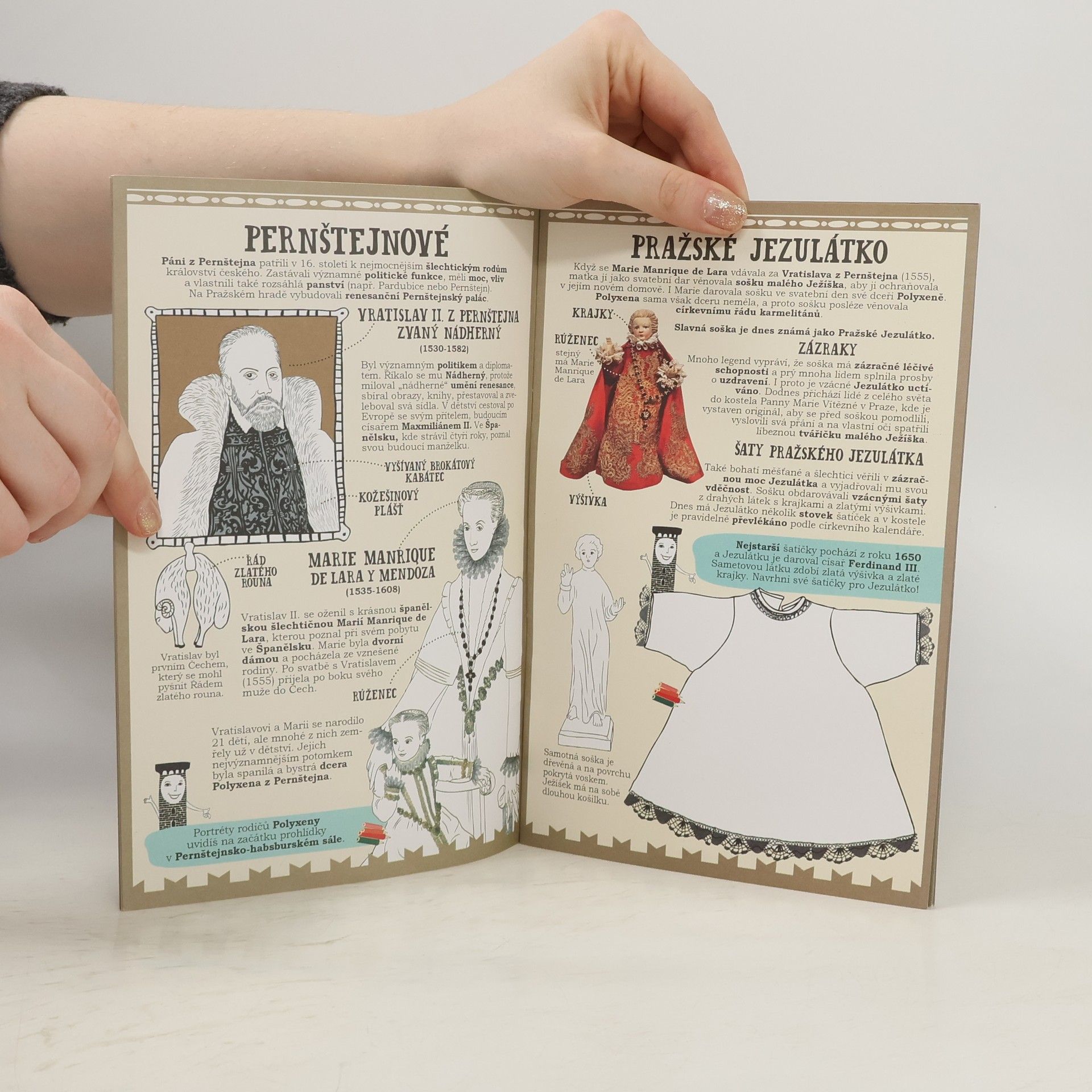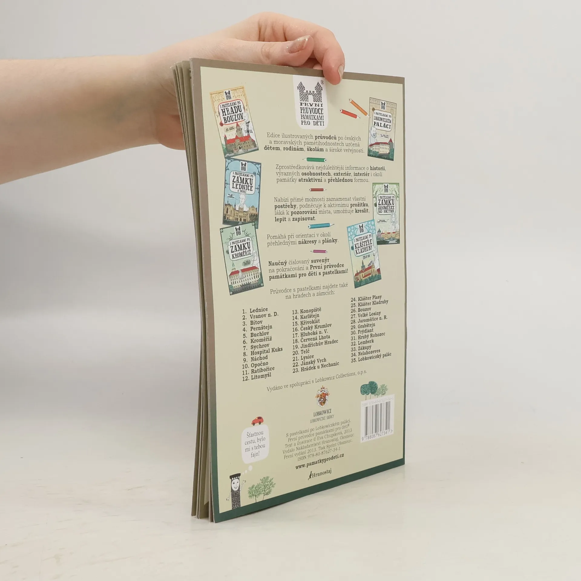 Průvodce z edice ilustrovaných průvodců s pastelkami po českých a moravských pamětihodnostech určená dětem, rodinám, školám a všem návštěvníkům památek. Zprostředkovává nejdůležitější informace o historii Lobkowiczkého paláce, výrazných osobnostech, exteriér, interiér i okolí památky atraktivní a přehlednou formou. Nabízí přímé možnosti zaznamenat vlastní postřehy, podněcuje k aktivnímu prožitku, láká k pozorování místa, umožňuje kreslit, lepit a zapisovat. Pomáhá při orientaci v okolí přehlednými nákresy a plánky. Naučný suvenýr na pokračování a první průvodce památkami pro děti s pastelkami. Součástí balení každého průvodce jsou malé pastelky (6ks, 9x4 cm) k okamžitému využití při návštěvě hospitalu.