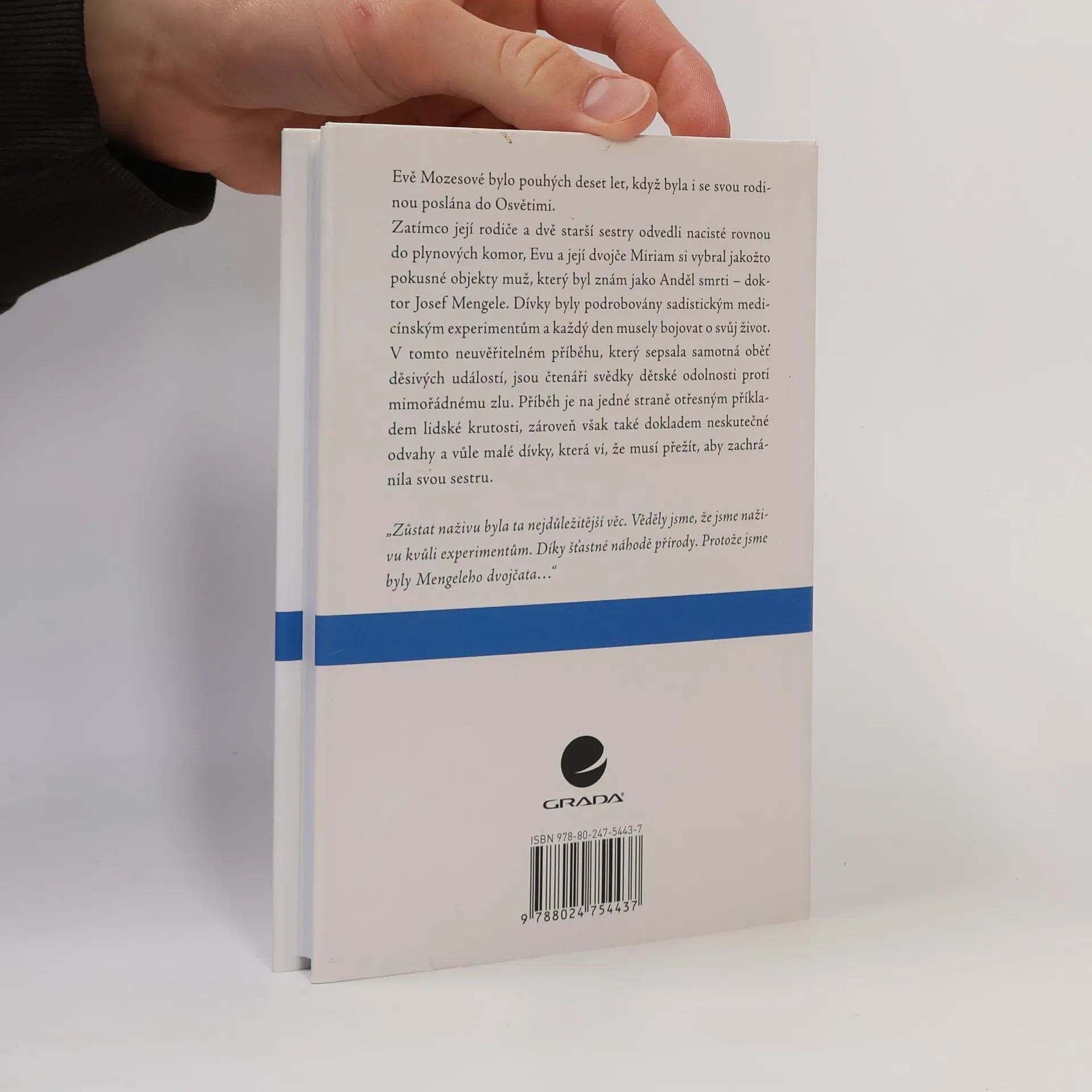 Evě Mozes bylo deset let, když byla se svou rodinou poslána do Osvětimi. Zatímco její rodiče a dvě starší sestry byli posláni do plynových komor, Evu a její dvojče Miriam si vybral coby pokusné objekty muž, který byl znám jako Anděl smrti – Dr. Josef Mengele. Dívky byly podrobeny sadistickým medicínským experimentům a musely každodenně bojovat o svůj život. V tomto neuvěřitelném příběhu, který sepsala samotná oběť děsivých událostí, jsou čtenáři svědky dětské odolnosti proti mimořádnému zlu. Eva byla například vystavena infekci, u níž Mengele věřil, že bude smrtelná, a bude pak moci provést pitvu i na Miriam, která měla sloužit jako „srovnávací vzorek“. Přežila – a dodnes neví, jaké onemocnění to bylo. Po osvobození tábora sestry založily skupinu, která podporovala bývalé oběti Mengeleho experimentů.