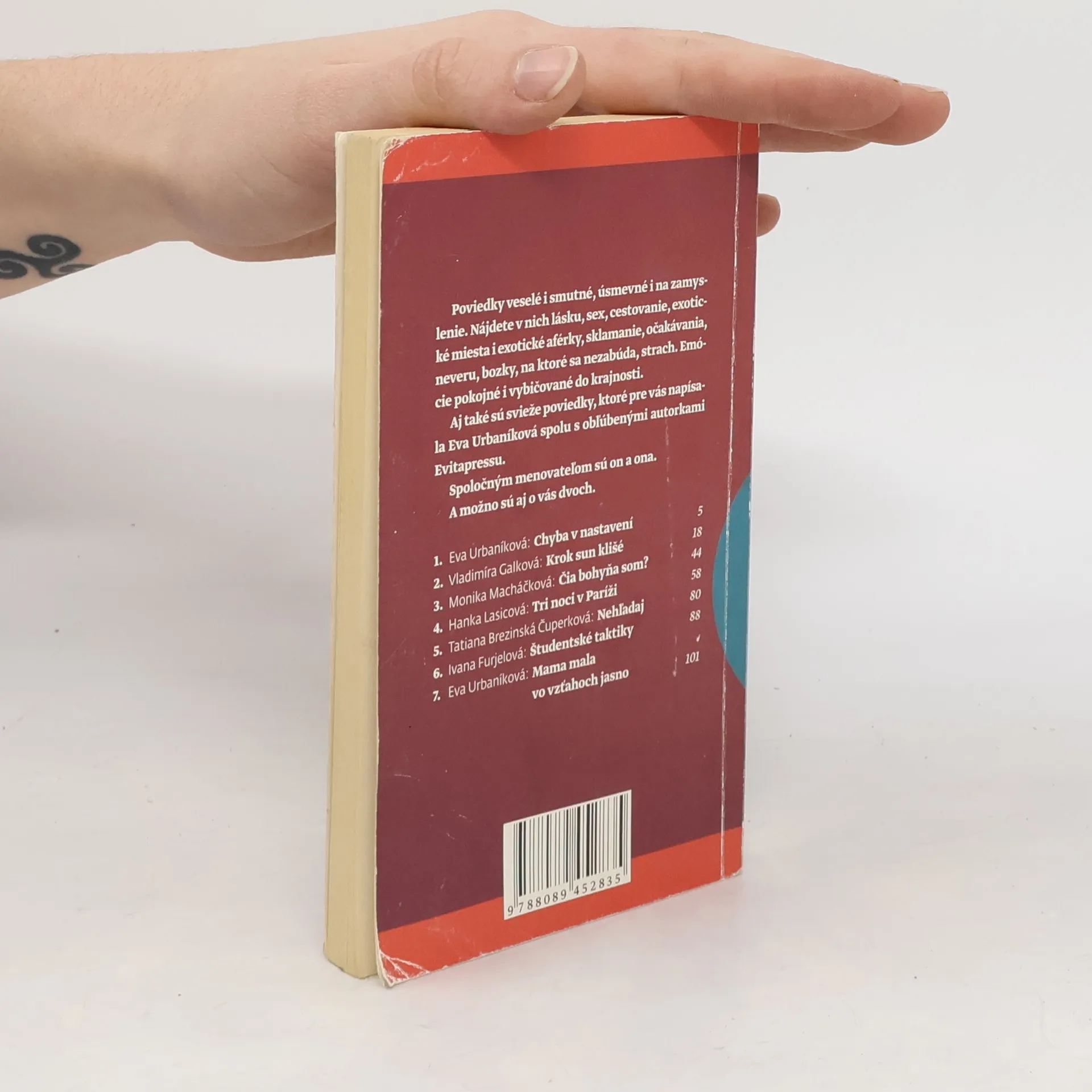 Poviedky veselé i smutné, úsmevné i na zamyslenie. Nájdete v nich lásku, sex, cestovanie, exotické miesta i exotické aférky, sklamanie, očakávania, neveru, bozky, na ktoré sa nezabúda, strach, Emócie pokojné i vybičované do krajnosti. Poviedky od autoriek: H. Lasicová, M. Macháčková, V. Galková, I. Furjelová, T.B. Čuperková.