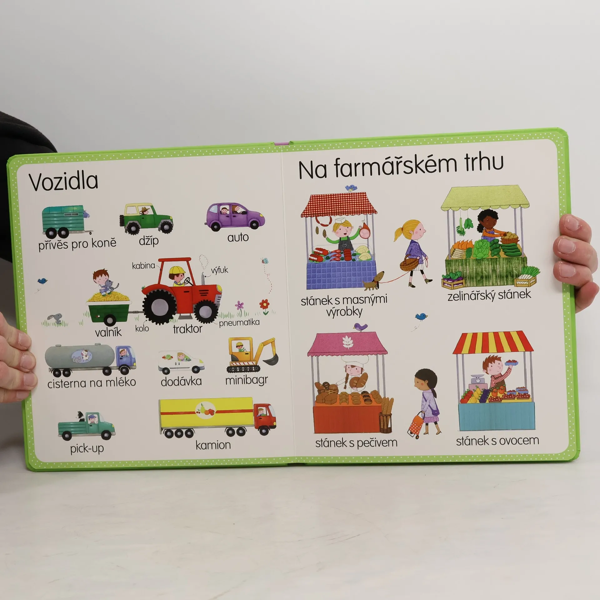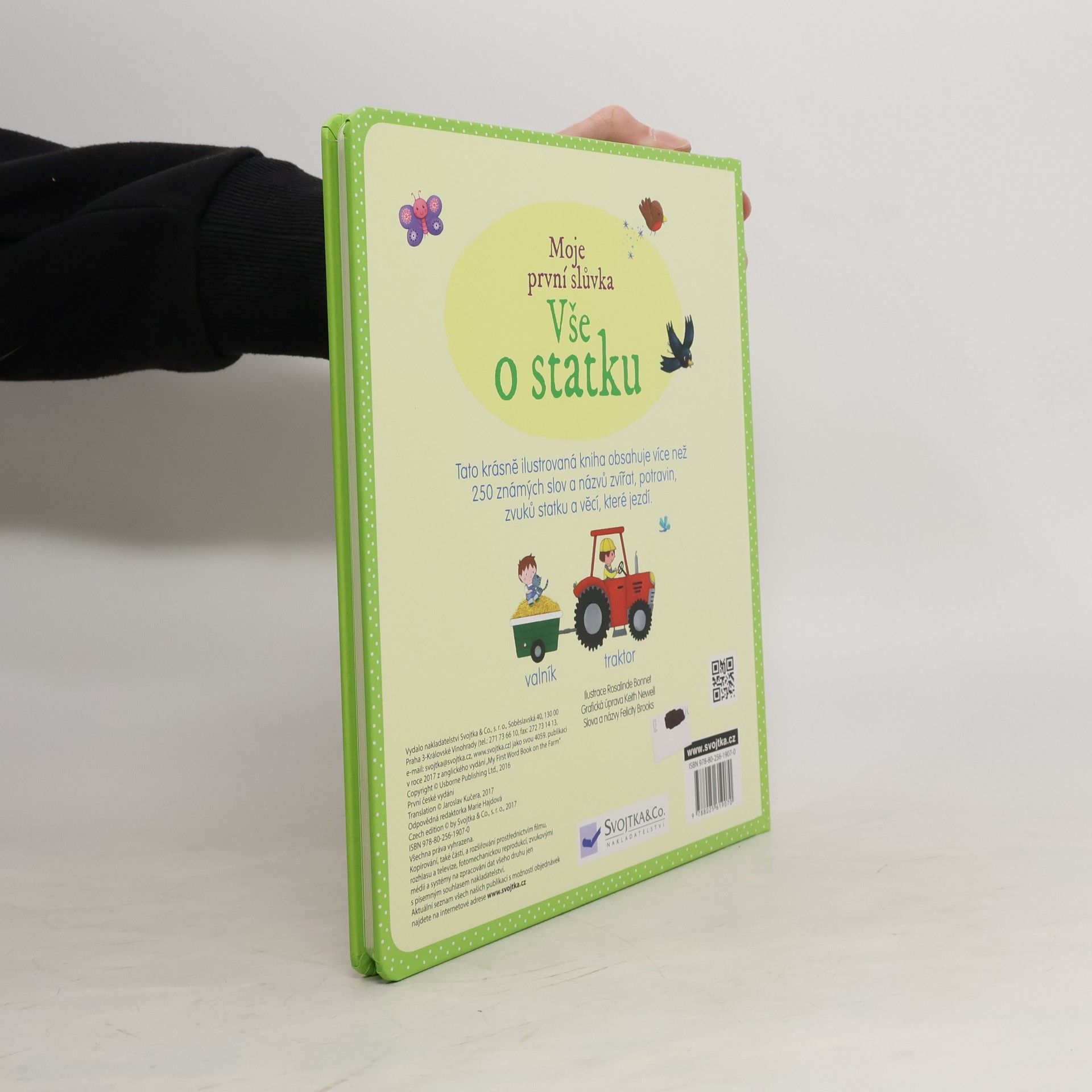 Obrázkový slovníček naučí děti názvy spousty věcí, které mohou najít na farmě či statku. Přehledně jsou tu pojmenovaná různá zvířátka, rostliny, stromy, vozidla a různé stroje i ostatní věci, které k farmě prostě patří. Děti se seznámí s činnostmi, které je třeba na farmě dělat i s farmářskými produkty, na nichž si mohou děti pochutnat doma. Slovíčka doplňují nádherné barevné ilustrace, které děti určitě zaujmou.