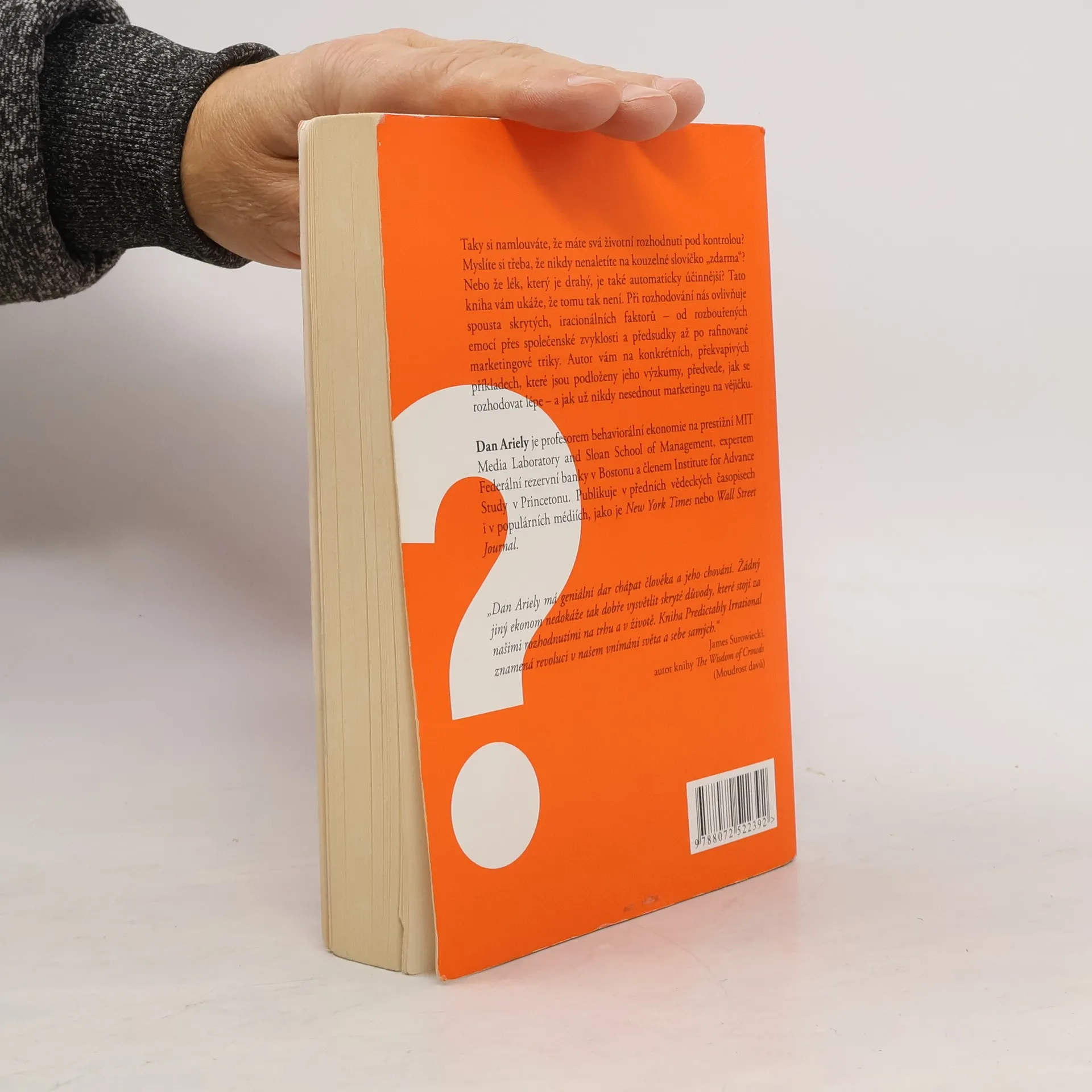 Iracionální faktory v ekonomice i v životě Taky si namlouváte, že máte svá životní rozhodnutí pod kontrolou? Myslíte si třeba, že nikdy nenaletíte na kouzelné slovíčko „zdarma“? Nebo že lék, který je drahý, je také automaticky účinnější? Tato kniha vám ukáže, že tomu tak není. Při rozhodování nás ovlivňuje spousta skrytých, iracionálních faktorů – od rozbouřených emocí přes společenské zvyklosti a předsudky až po rafinované marketingové triky. Autor této vysoce ceněné knihy vám na konkrétních, překvapivých příkladech, které jsou podloženy jeho výzkumy, předvede, jak se rozhodovat lépe – a jak už nikdy nesednout marketingu na vějičku.