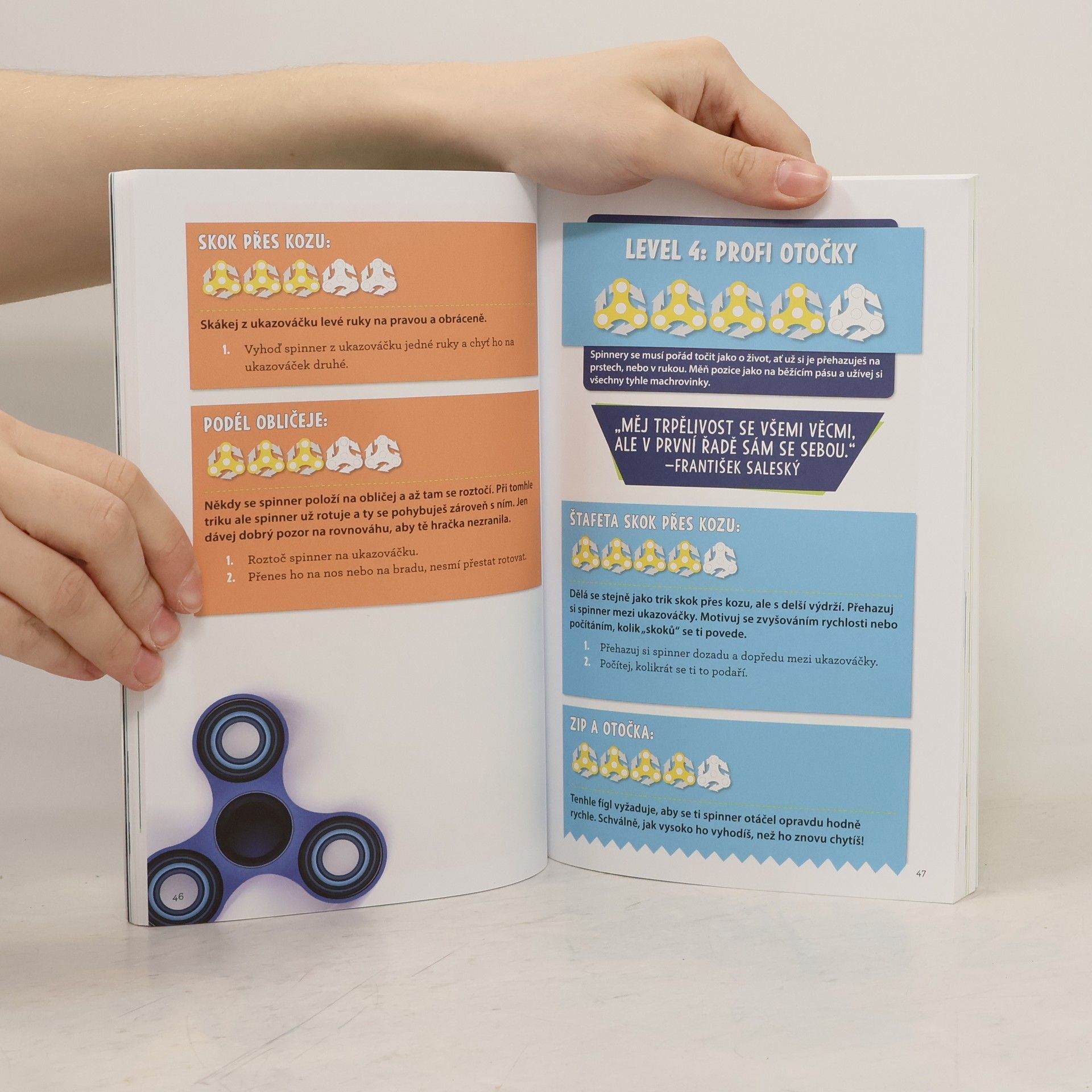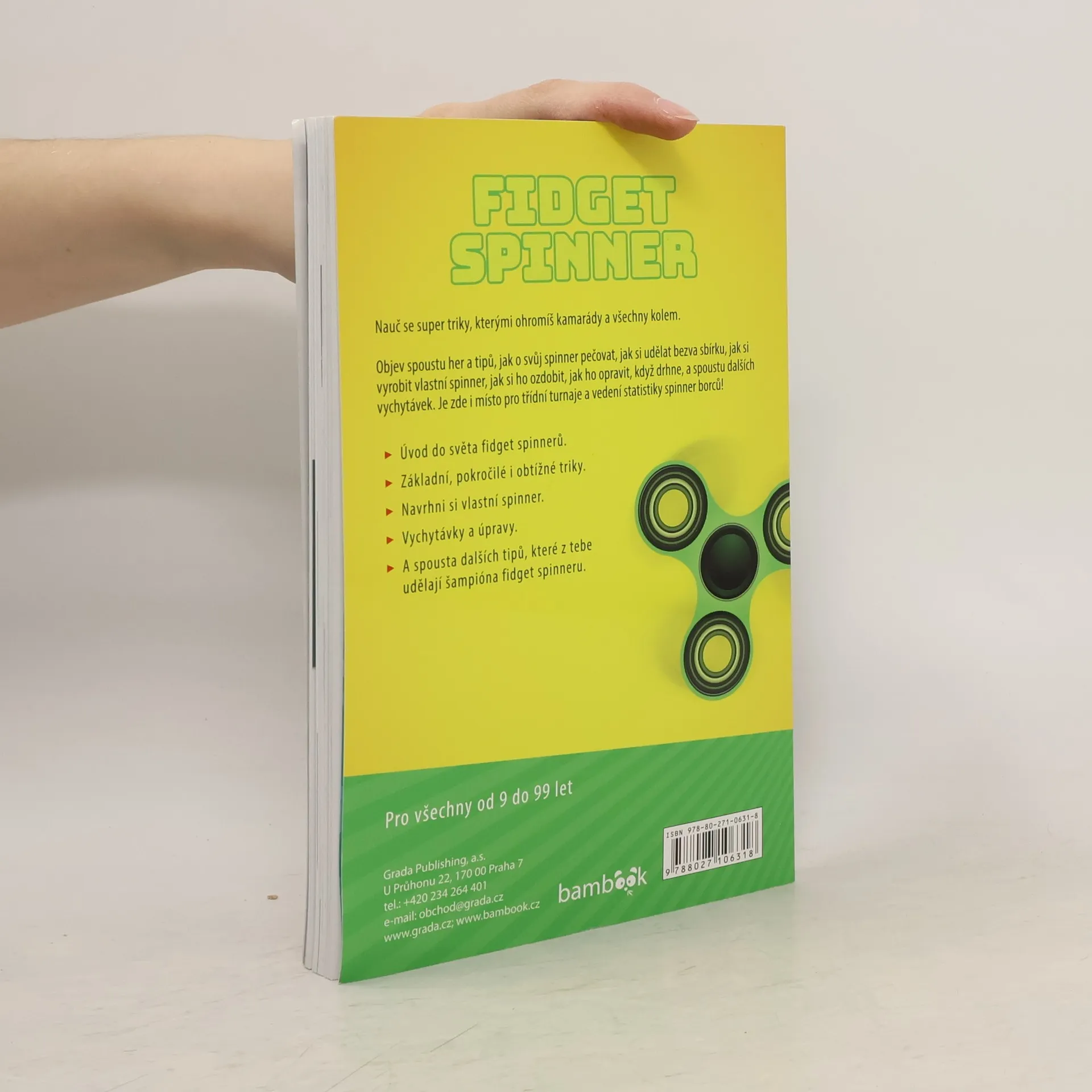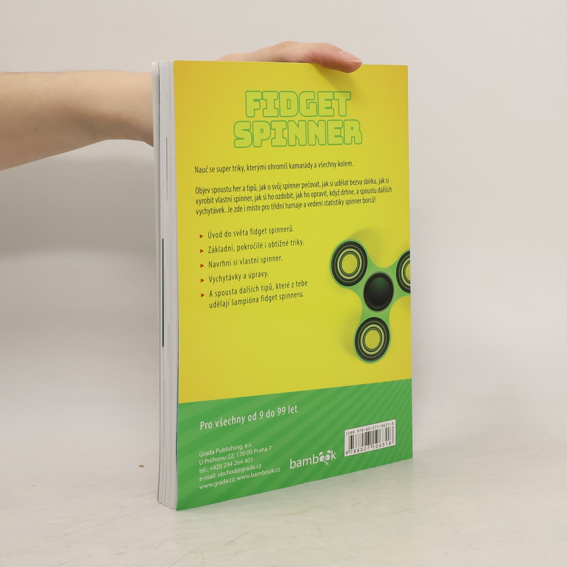 Užij si dokonalou zábavu se svým spinnerem! Nauč se super triky, kterými ohromíš své kamarády a všechny kolem. Objev spoustu her a tipů, jak o svůj spinner pečovat, jak si udělat bezva sbírku, jak si vyrobit vlastní spinner, jak si ho ozdobit, jak ho opravit, když píská a spoustu dalších vychytávek. Zjistíš, proč je spinner pro tebe tak dokonalá zábava. Je zde i místo pro zápisy výsledků třídních turnajů a vedení statistiky spinner borců! Jsi připraven stát se světovým spinner mistrem?