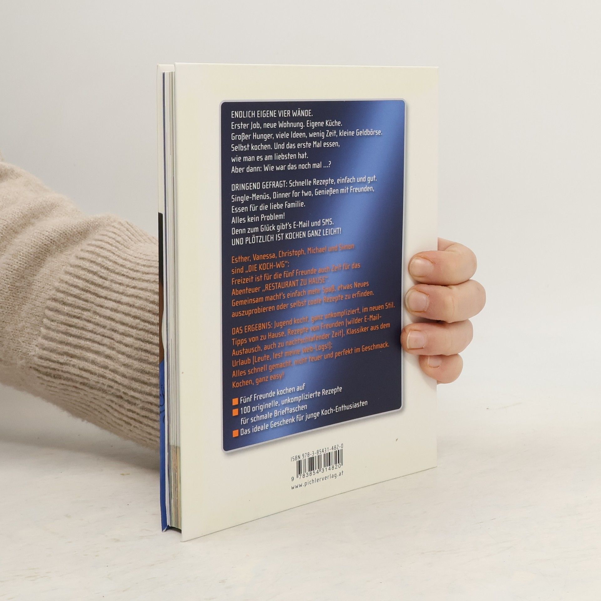 Esther, Vanessa, Christoph, Michael und Simon sind „die Koch-WG“: Freizeit ist für die fünf Freunde auch Zeit für das Abenteuer „Restaurant zu Hause“. Gemeinsam in der eigenen Küche macht’s einfach mehr Spaß, etwas Neues auszuprobieren oder selbst coole Rezepte gegen den großen Hunger zu erfinden. Alles ist schnell gemacht, schont die Geldbörse und schmeckt auch perfekt: Single-Menüs, Dinner for two, Futternmit Freunden, Essen für die liebe Familie, die sich überraschend zu einemBesuch ansagt. Alles kein Problem! Denn zumGlück gibt’s E-Mail und SMS – man holt sich Tipps von zu Hause und Rezepte von Freunden (wilder E-Mail- Austausch, auch zu nachtschlafender Zeit), bringt originelle Ideen für klassische Köstlichkeiten aus demUrlaubmit (Leute, lestmeineWeb-Logs!). Das aufregende kulinarische Ergebnis: Jugend kocht, ganz unkompliziert, im neuen Stil. Kochen, ganz easy!