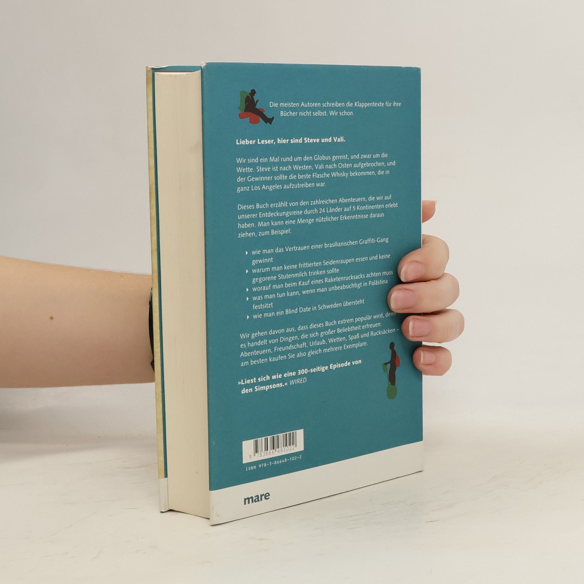 Sie haben ein Ziel: die Umrundung der Welt. Der Einsatz: eine Flasche Whisky. Die Bedingung: keine Flugzeuge. Es beginnt ein wahnwitziges Wettrennen um die Welt: Bald findet sich Steve auf einem Containerschiff wieder, das, beladen mit Rinderfellen und Altbatterien, von der amerikanischen Westküste aus Schanghai anläuft. Vali heizt derweil mit dem Mietwagen nach Mexiko und begreift erst langsam, dass ihn der Start gen Osten durch die Zeitverschiebung jeden zweiten Tag eine Stunde Schlaf kosten wird. Umso eiliger hat er es, bei Juan Lozano in Cuernavaca seinen ganz persönlichen Raketenrucksack zu erstehen. Doch Augenblick mal. Kommt man mit einem Raketenrucksack über den Atlantik? Wie man im Eiltempo 24 Länder auf 5 Kontinenten durchquert und dabei die coolsten Geschichten erlebt, wie man das Vertrauen einer brasilianischen Graffiti-Gang gewinnt, warum man keine frittierten Seidenraupen essen und keine gegorene Stutenmilch trinken sollte, wie man ein Blind Date in Schweden übersteht oder eine Entführung in Moskau plant – das erfahren Sie in diesem Buch über das skurrile Reiseabenteuer zweier liebenswerter Chaoten.