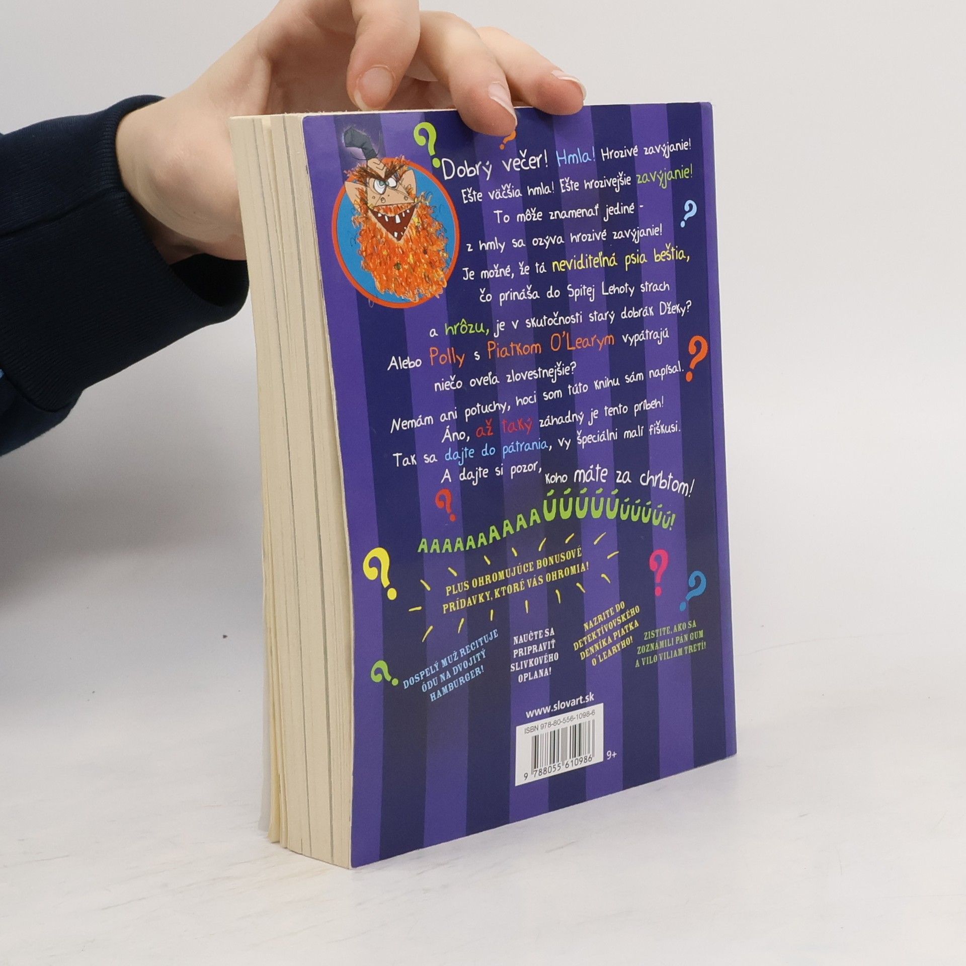 Posledné pokračovanie obľúbených ostrovtipných príbehov hrozivého pána Guma obsahuje tentoraz ešte niečo navyše – je v ňom vyše sto pestrofarebných nálepiek. A nový príbeh? Hmla! Hrozivé zavýjanie! Ešte väčšia hmla! Ešte hrozivejšie zavýjanie! Čo to znamená? To znamená, že z hmly sa ozývajú zvuky, z ktorých ľuďom naskakujú zimomriavky! Je možné, že tá neviditeľná psia beštia, čo prináša do Spitej Lehoty strach a hrôzu, je v skutočnosti starý dobrák Džeky? Tomu sa dá len ťažko uveriť! Možno Polly s Piatkom O’Learym vypátrajú, čo alebo kto sa za tým všetkým skrýva. Je to jedna z najväčších záhad, akú naši hrdinovia musia vyriešiť. Mimochodom, neviete, kde je pán Gum so svojím verným spoločníkom Vilom Viliamom Tretím?