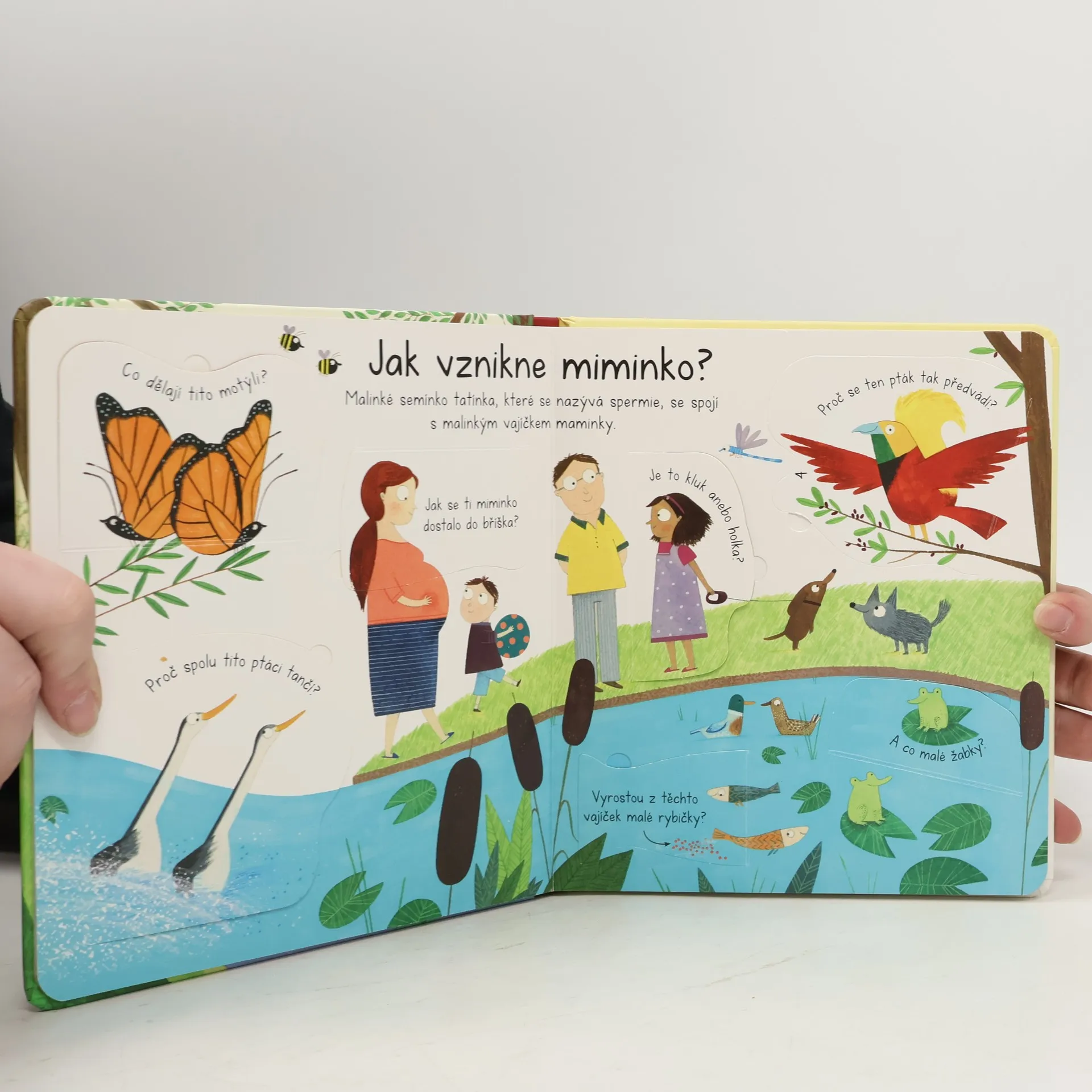 Myslíš si ještě, že děti nosí čáp nebo vrána? Tak to přece vůbec není! Čeká tvoje maminka miminko a ty se těšíš na malého brášku nebo sestřičku? A chtěl by ses mezitím dozvědět něco o tom, jak taková miminka v bříšku rostou, jak se tam dostala, co tam dělají a za jak dlouho se narodí? V této knížce plné otázek a odpovědí se dozvíš vše o tom, jak taková miminka přicházejí na svět. A ne jen ta lidská! I malá zvířátka, co se teprve narodí nebo vylíhnout, rostou v bříšku své maminky, případně ve vejcích. Bohaté ilustrace a jasné popisky ti umožní porovnat, v čem se lidská a zvířecí mláďata liší a v čem jsou si naopak podobná. Zajímá tě, jak je to v přírodě zařízeno? Odpovědi na své otázky nalezneš pod odklápěcími okýnky