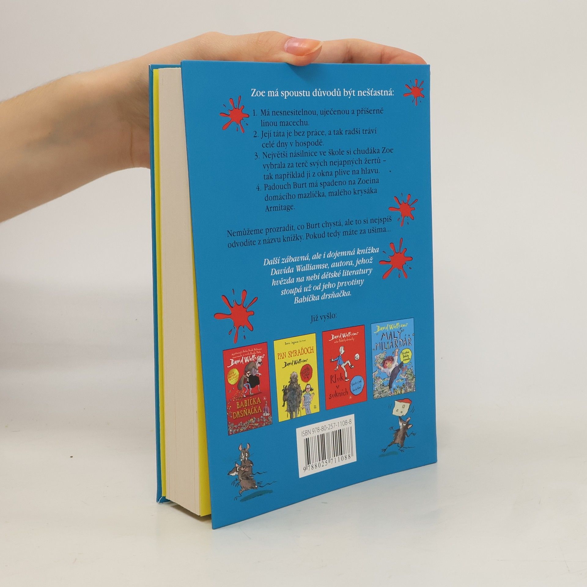 Další zábavná, ale i dojemná knížka Davida Walliamse, autora, jehož hvězda na nebi dětské literatury stoupá už od jeho prvotiny Babička drsňačka. Jak je u Walliamse obvyklé, nemají to jeho hrdinové v životě zrovna snadné. Ani Zoe není výjimkou. Její táta se po smrti Zoeiny mámy podruhé oženil, ale neměl v tomhle směru zrovna štěstí. Sheila je uječená a bezkonkurenčně nejlínější osoba pod sluncem, nebo aspoň v činžáku, kde rodina bydlí. Svoji nevlastní dceru bytostně nesnáší. A aby toho nebylo málo, největší násilnice ve škole si chudáka Zoe vybrala za terč svých nejapných žertů. Zoe se cítí osamělá a nešťastná. Proto se zaraduje, když jednoho dne do jejího pokoje zabloudí roztomilé krysí mládě – neděste se, může se to stát i v lepších rodinách. Holčička si ho rychle ochočí a začne ho učit cirkusovým kouskům. Na malého krysáka však číhá velké nebezpečí. Má na něj spadeno majitel firmy na výrobu... Čeho? To si snadno odvodíte z názvu knížky. První vydání.