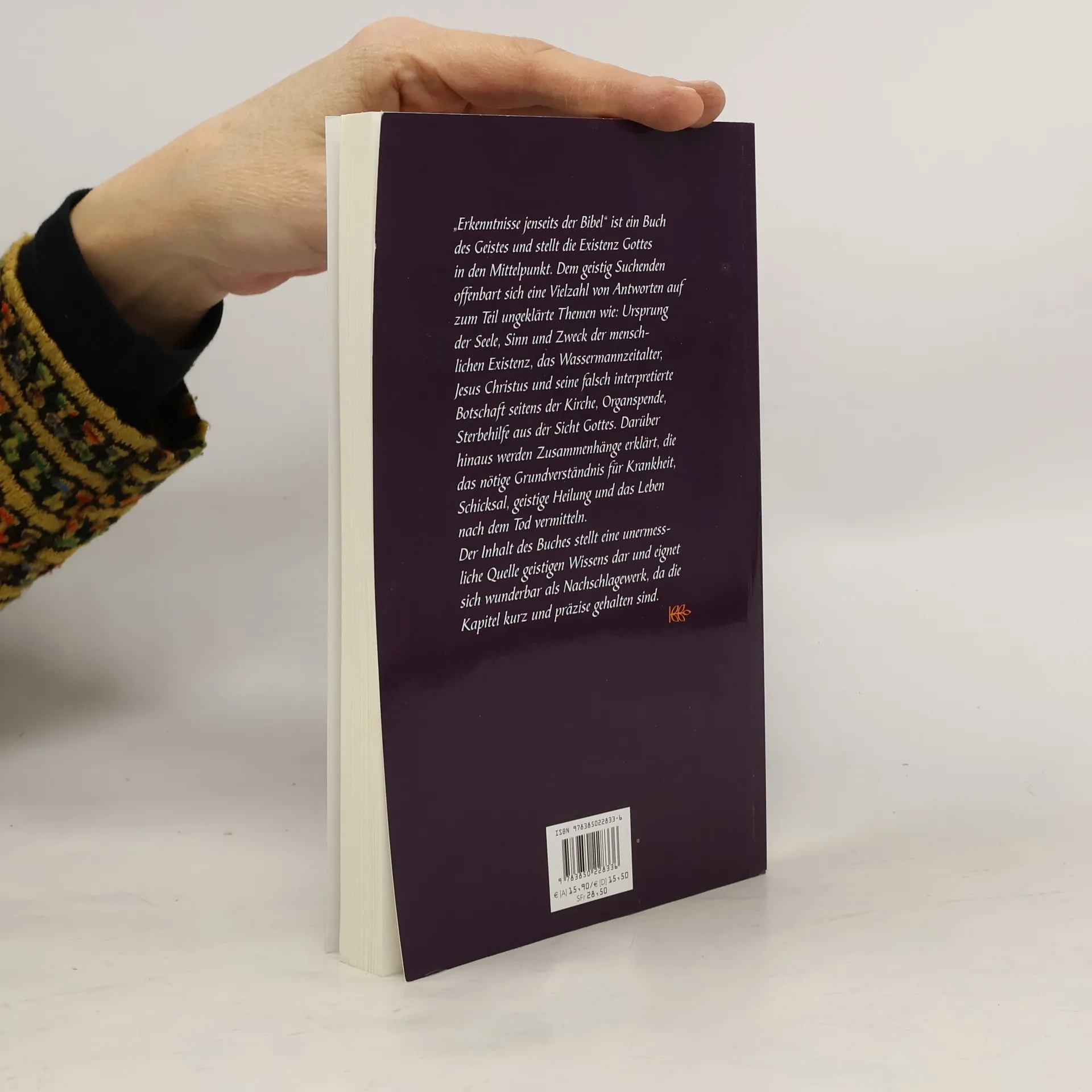 „Erkenntnisse jenseits der Bibel” ist ein Buch des Geistes und stellt die Existenz Gottes in den Mittelpunkt. Dem geistig Suchenden offenbart sich eine Vielzahl von Antworten auf zum Teil ungeklärte Themen wie: Ursprung der Seele, Sinn und Zweck der menschlichen Existenz, das Wassermannzeitalter, Jesus Christus und seine falsch interpretierte Botschaft seitens der Kirche, Organspende, Sterbehilfe aus der Sicht Gottes. Darüber hinaus werden Zusammenhänge erklärt, die das nötige Grundverständnis für Krankheit, Schicksal, geistige Heilung und das Leben nach dem Tod vermitteln. Der Inhalt des Buches stellt eine unermessliche Quelle geistigen Wissens dar und eignet sich wunderbar als Nachschlagewerk, da die Kapitel kurz und präzise gehalten sind.