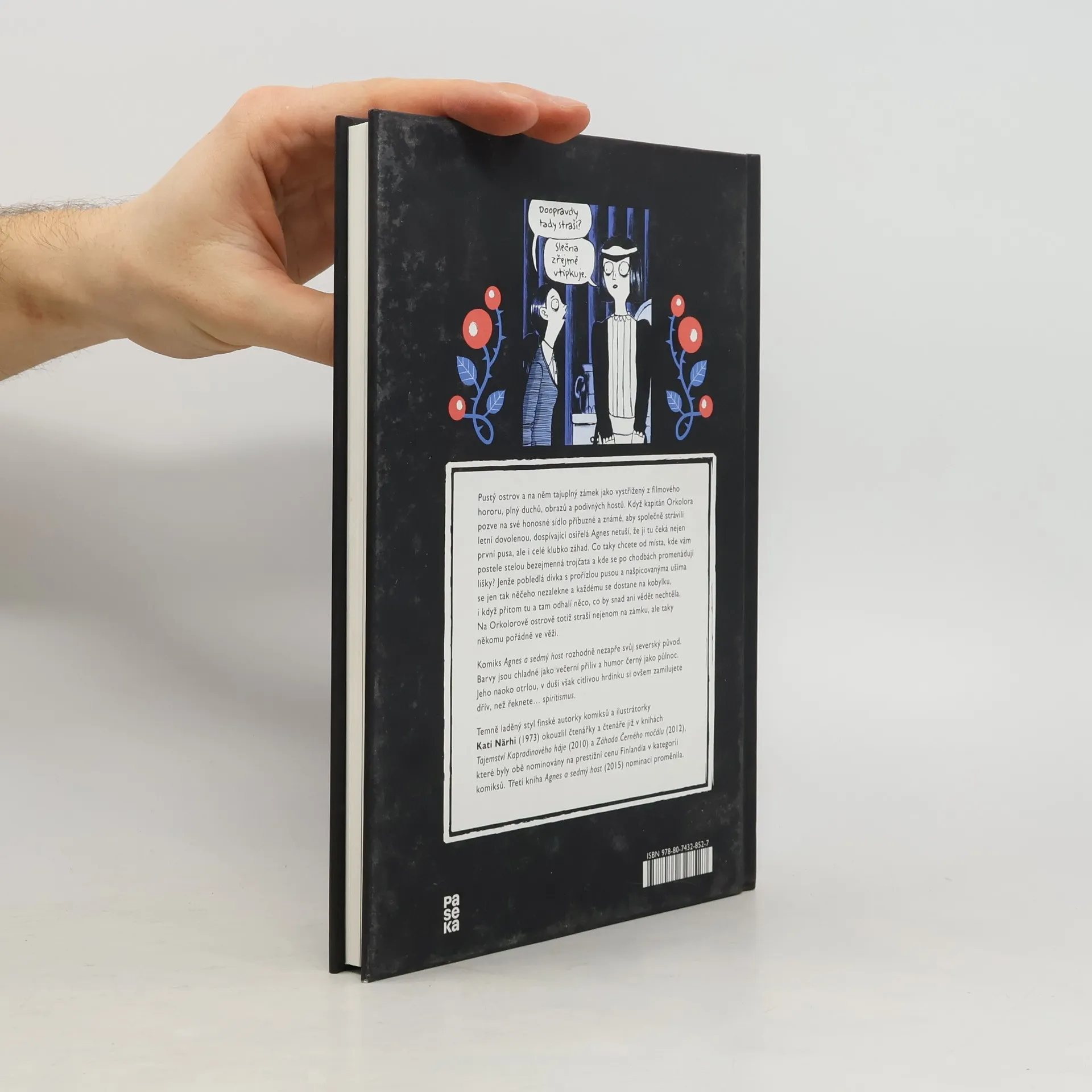 Pustý ostrov a na něm tajuplný zámek plný duchů, obrazů a podivných hostů. Když kapitán Orkolora pozve na své honosné sídlo jako vystřižené z filmového hororu příbuzné a známé, aby společně strávili letní dovolenou, dospívající osiřelá Agnes ještě netuší, že ji tu čeká nejen první pusa, ale i celé klubko záhad. Co taky čekat od místa, kde vám postele stelou bezejmenná trojčata a kde se po chodbách promenádují lišky? Jenže pobledlá dívka s prořízlou pusou a našpicovanýma ušima se jen tak něčeho nezalekne a každému se dostane na kobylku, i když přitom občas odhalí něco, co by snad ani vědět nechtěla. Protože na Orkolorově ostrově straší nejenom na zámku, ale taky někomu pořádně ve věži. Komiks Agnes a sedmý host rozhodně nezapře svůj severský původ. Barvy jsou chladné a humor černý jako půlnoc. Ale jeho naoko otrlou, v duši však citlivou hrdinku si zamilujete dřív, než řeknete... spiritismus