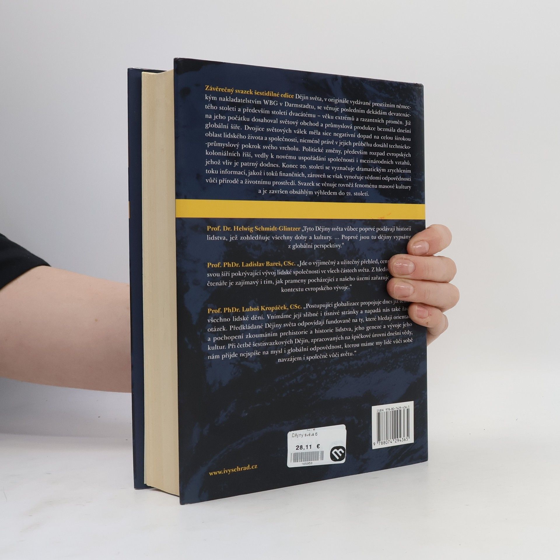 Globální dějiny od počátků do 21. století. Sv. 6 - Globalizace od roku 1880 do dneška. Závěrečný svazek šestidílné edice Dějin světa, v originále vydávané prestižním německým nakladatelstvím WBG v Darmstadtu, se věnuje dvacátému století – století razantních proměn. Již na jeho počátku dosahoval obchod a průmyslová produkce bezmála dnešní globální šíře. Dvojice světových válek měla sice negativní dopad na celou širokou oblast lidského života a společnosti, nicméně právě v jejich průběhu dosáhl technicko-průmyslový pokrok svého vrcholu. Politické změny vedly k novému uspořádání společnosti i mezinárodních vztahů, jehož vliv je patrný dodnes. Konec 20. století se vyznačuje dramatickým zrychlením toku informací, jakož i toků finančních, zároveň se však vynořuje vědomí odpovědnosti vůči přírodě a životnímu prostředí. Svazek se věnuje rovněž fenoménu masové kultury a je završen obsáhlým výhledem do 21. století.