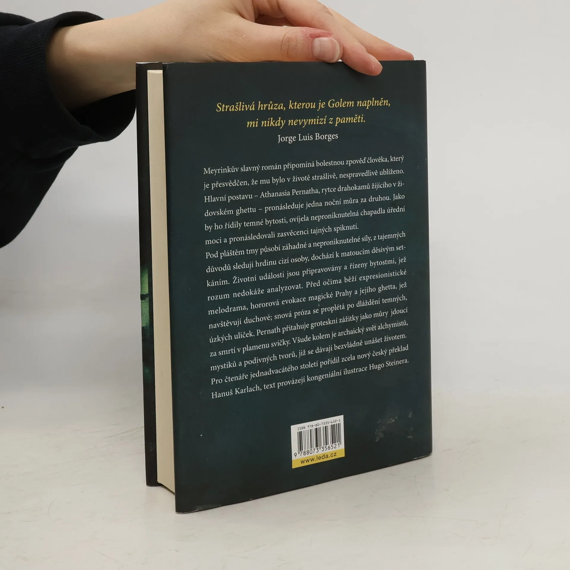 „Strašlivá hrůza, kterou je Golem naplněn, mi nikdy nevymizí z paměti.“ — Jorge Luis Borges Meyrinkův slavný román připomíná bolestnou zpověď člověka, který je přesvědčen, že mu bylo v životě strašlivě, nespravedlivě ublíženo. Hlavní postavu – Athanasia Pernatha, rytce drahokamů žijícího v židovském ghettu – pronásleduje jedna noční můra za druhou. Jako by ho řídily temné bytosti, ovíjela neproniknutelná chapadla úřední moci a pronásledovali zasvěcenci tajných spiknutí. Pod pláštěm tmy působí záhadné a neproniknutelné síly, z tajemných důvodů sledují hrdinu cizí osoby, dochází k matoucím děsivým setkáním. Životní události jsou připravovány a řízeny bytostmi, jež rozum nedokáže analyzovat. Před očima běží expresionistické melodrama, hororová evokace magické Prahy a jejího ghetta, jež navštěvují duchové; snová próza se proplétá po dláždění temných, úzkých uliček. Pernath přitahuje groteskní zážitky jako můry jdoucí za smrtí v plamenu svíčky. Všude kolem je archaický svět alchymistů, mystiků a podivných tvorů, již se dávají bezvládně unášet životem. Pro čtenáře jednadvacátého století pořídil zcela nový český překlad Hanuš Karlach, text provázejí kongeniální ilustrace Hugo Steinera.