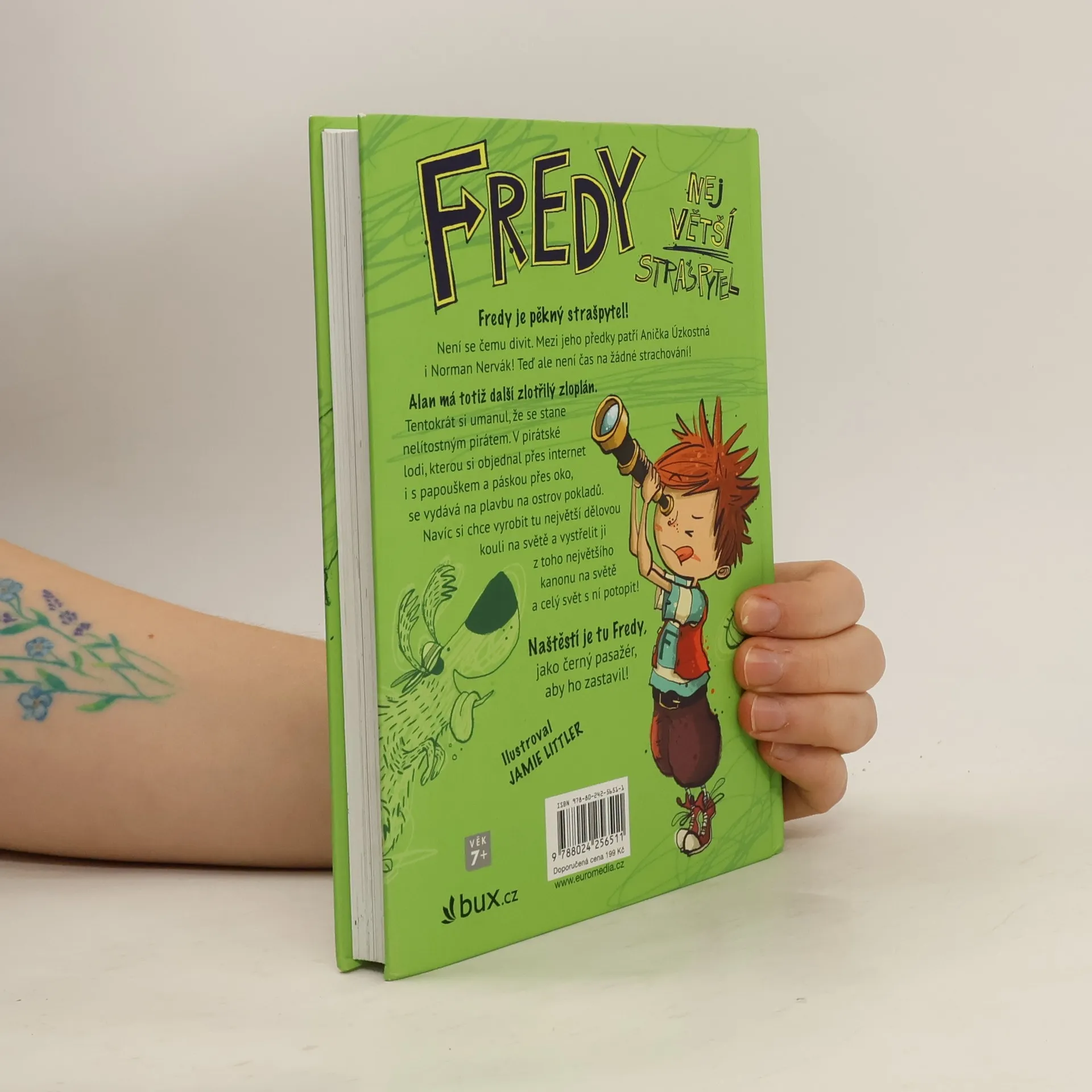 Fredy je pěkný strašpytel! Není se čemu divit. Mezi jeho předky patří Anička Úzkostná i Norman Nervák! Teď ale není čas na žádné strachování! Alan má totiž další zlotřilý zloplán. Tentokrát si umanul, že se stane nelítostným pirátem. V pirátské lodi, kterou si objednal přes internet i s papouškem a páskou přes oko, se vydává na plavbu na ostrov pokladů. Navíc si chce vyrobit tu největší dělovou kouli na světě a vystřelit ji z toho největšího kanonu na světě a celý svět s ní potopit! Naštěstí je tu Fredy, jako černý pasažér, aby ho zastavil! Kniha je určena dětem od 7 let. Ilustrace Jamie Littler.