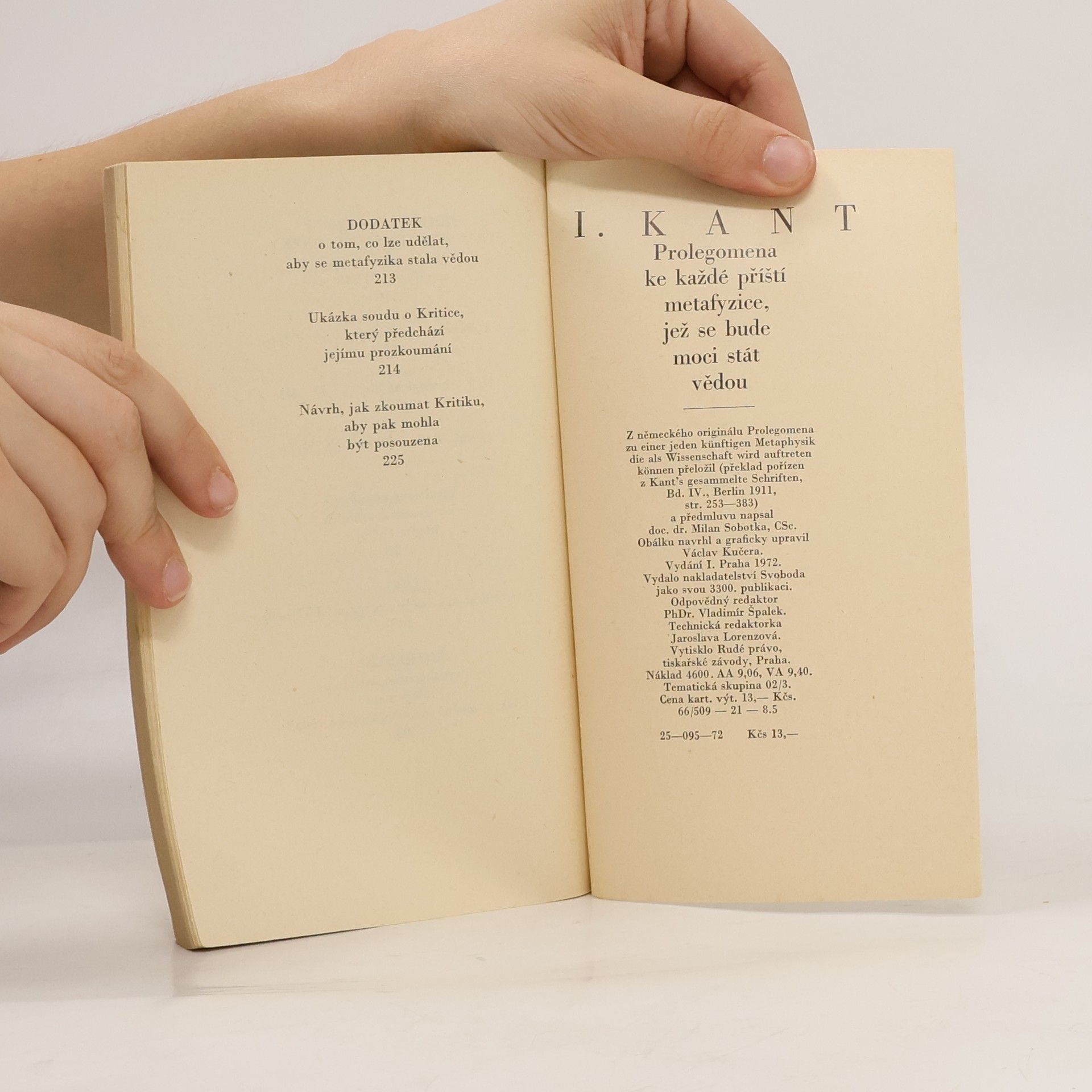 Klasické dílo z r. 1783 ozřejmuje analytickým způsobem obsah autorovy Kritiky čistého rozumu, zpracované syntetickou metodou. Jsou v něm podrobeny rozboru podmínky našeho možného poznání. Kant pátrá po charakteru poznatků v dosavadních vědách a vytváří ideu nové vědy vížící se k subjektu. Tento druhý český překlad spisu je moderně uzpůsoben (terminologicky, lexikálně, stylisticky), aniž se vzdaluje syntaxi Kantově.