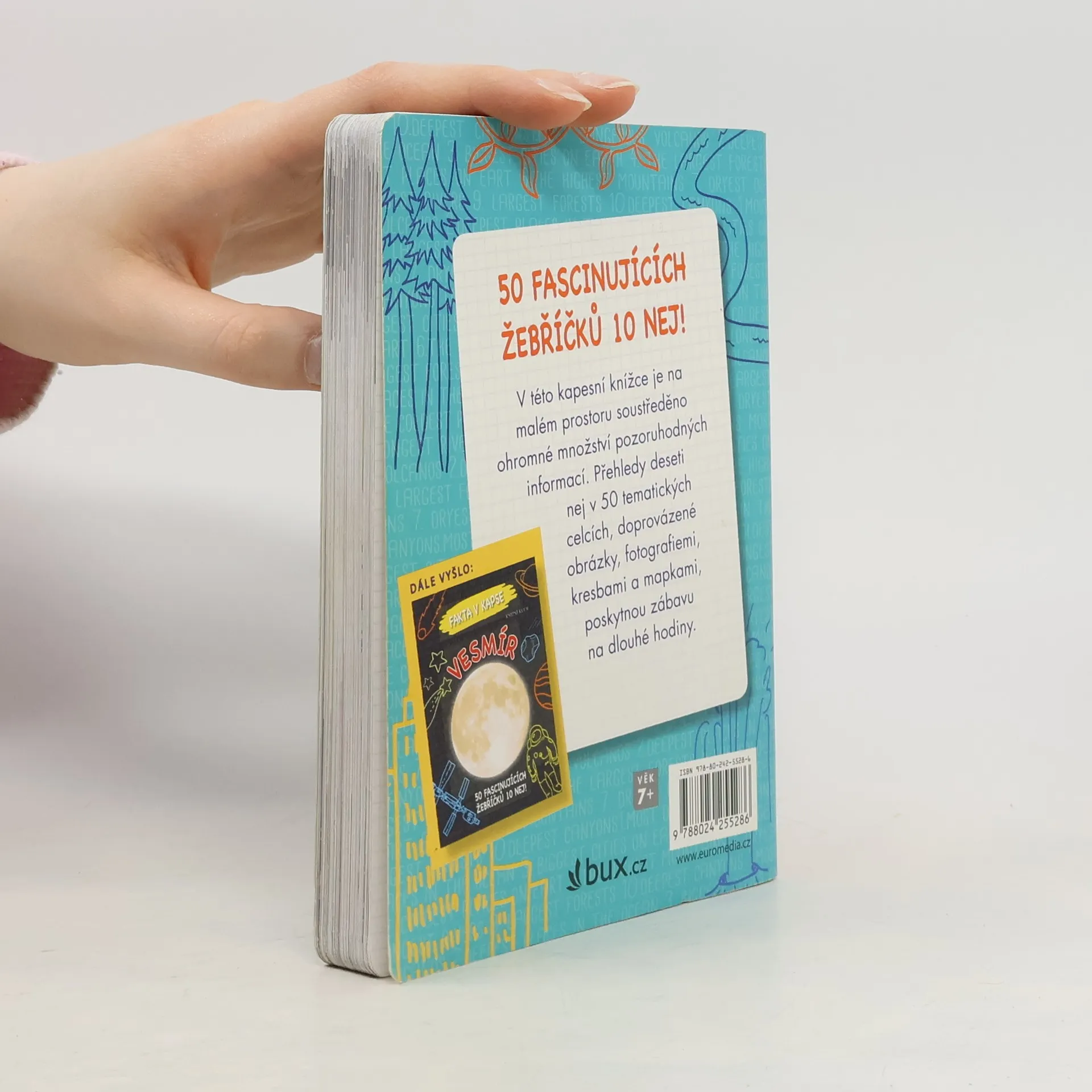 V této kapesní knížce je na malém prostoru v 50 tematických celcích soustředěno ohromné množství fascinujících informací. Zejména mladí čtenáři ve věku 7–10 let zde naleznou ta nejextrémnějších, nejkurióznější, nejneobvyklejší, zkrátka „nej“ fakta o naší planetě Zemi. Vedle obvyklých údajů o nejvyšších vrcholech, nejdelších řekách a nejnebezpečnějších sopkách pozná i nejpodivnější místa světa, nejneobvyklejší budovy, místa s nejkrásnějšími západy slunce, nejšťastnější země světa… Originální kniha nabízí nejen informace doprovázené obrázky, fotografiemi, kresbami a mapkami – ale především odlehčený přístup k populárně naučnému tématu.