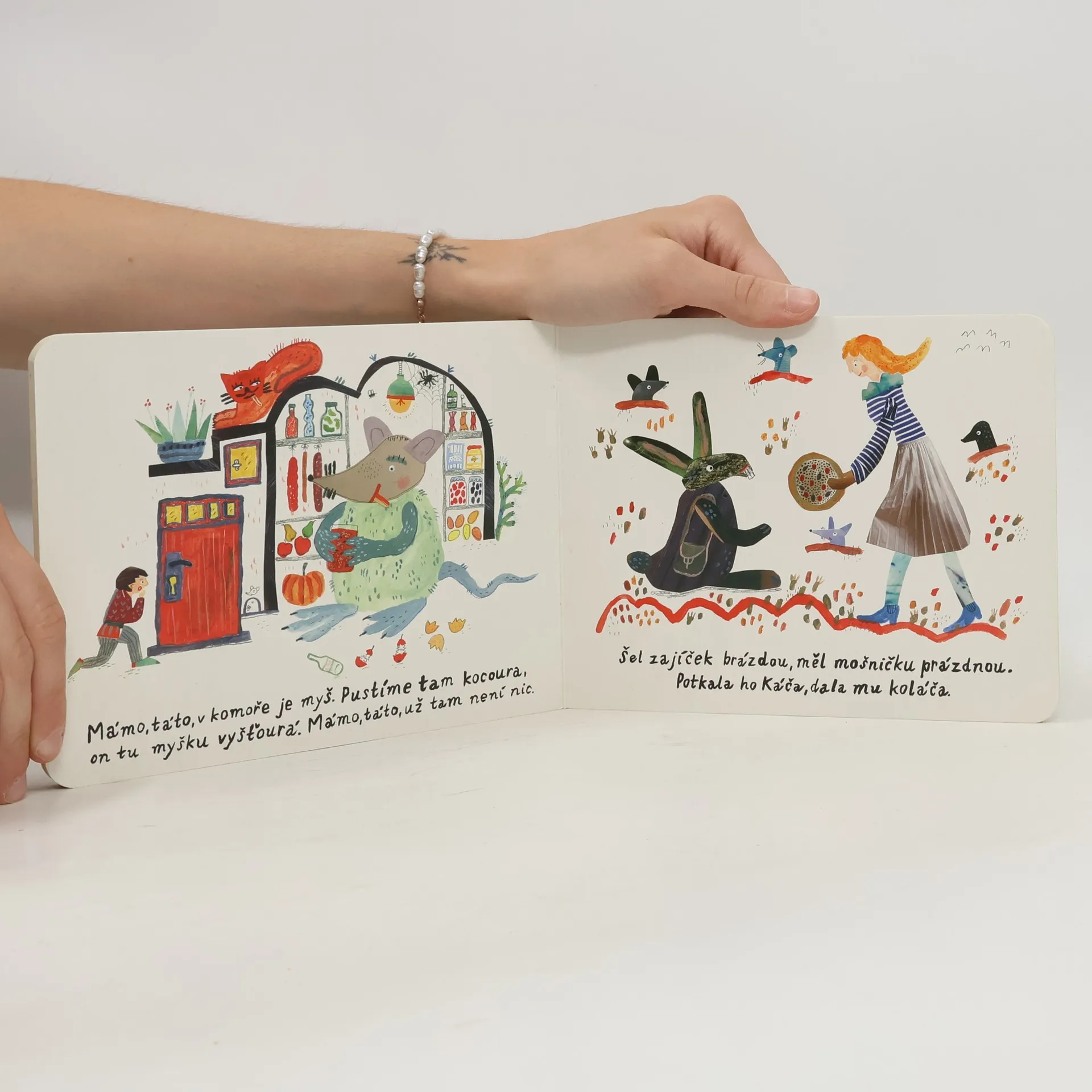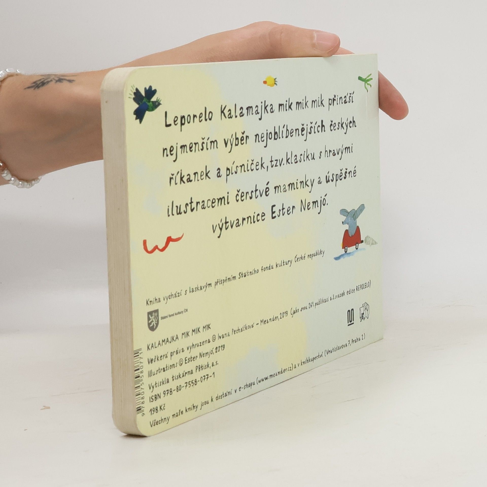 Leporelo Kalamajka mik mik mik přináší nejmenším výběr nejoblíbenějších českých říkanek, básniček a písniček, tzv. klasiku s krásnými ilustracemi a ručním písmem čerstvé maminky a úspěšné ilustrátorky Ester Nemjó.