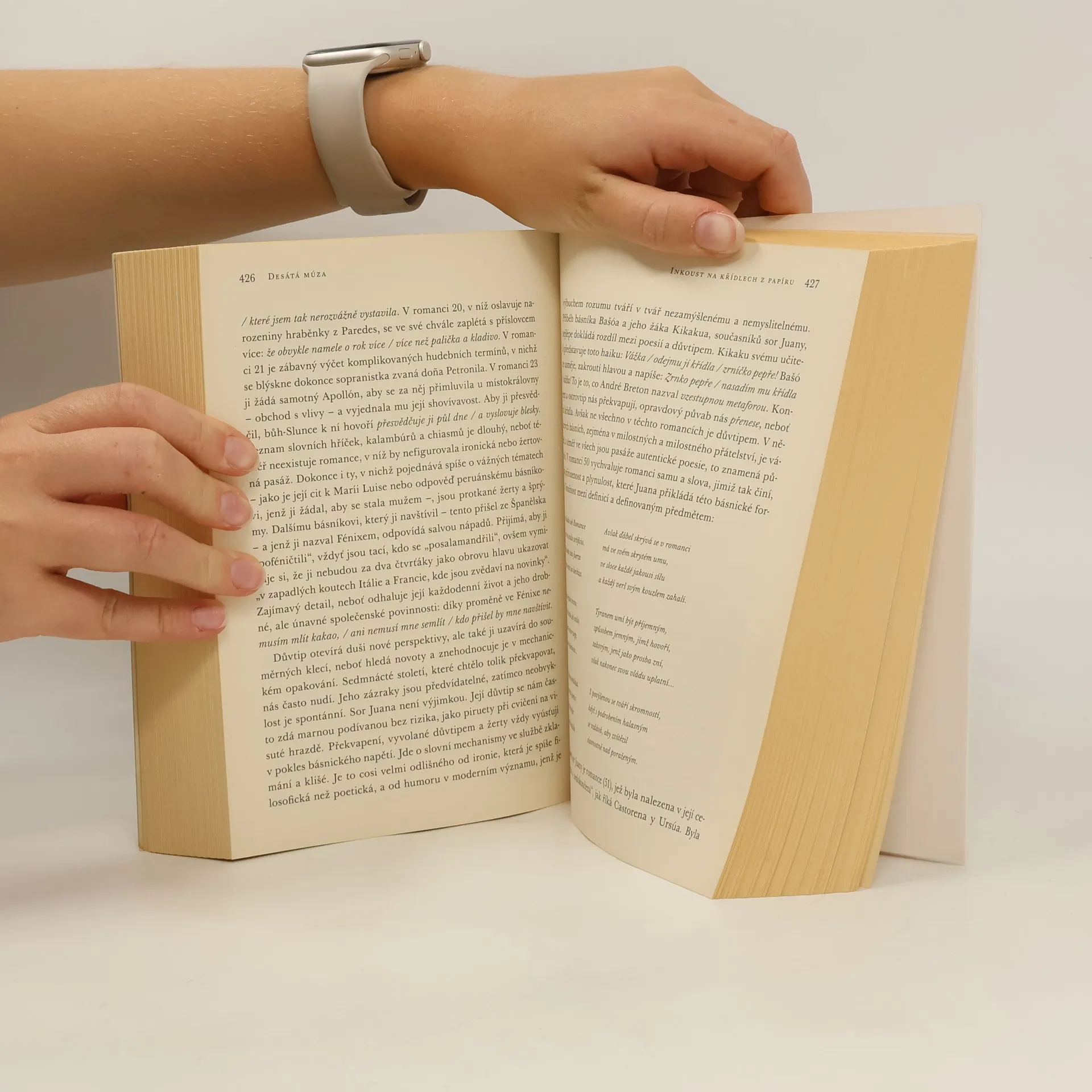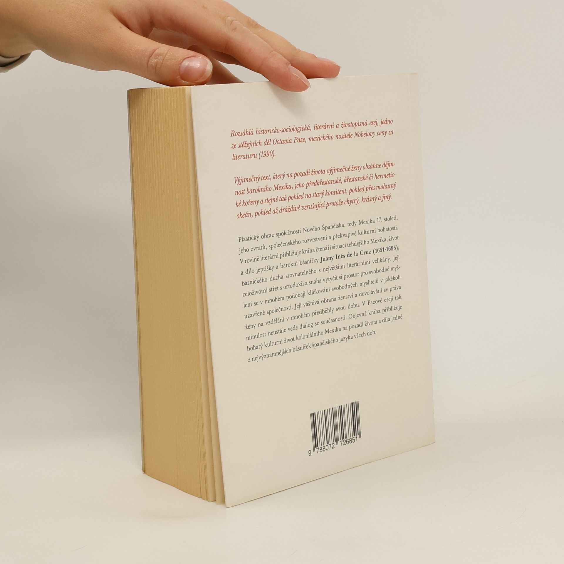 Výjimečný text, který na pozadí života výjimečné ženy obsáhne dějinnost barokního Mexika, jeho předkřesťanské, křesťanské či hermetické kořeny a stejně tak pohled na starý kontinent, pohled přes mohutný okeán, pohled až dráždivě vzrušující protože chytrý, krásný a jiný.