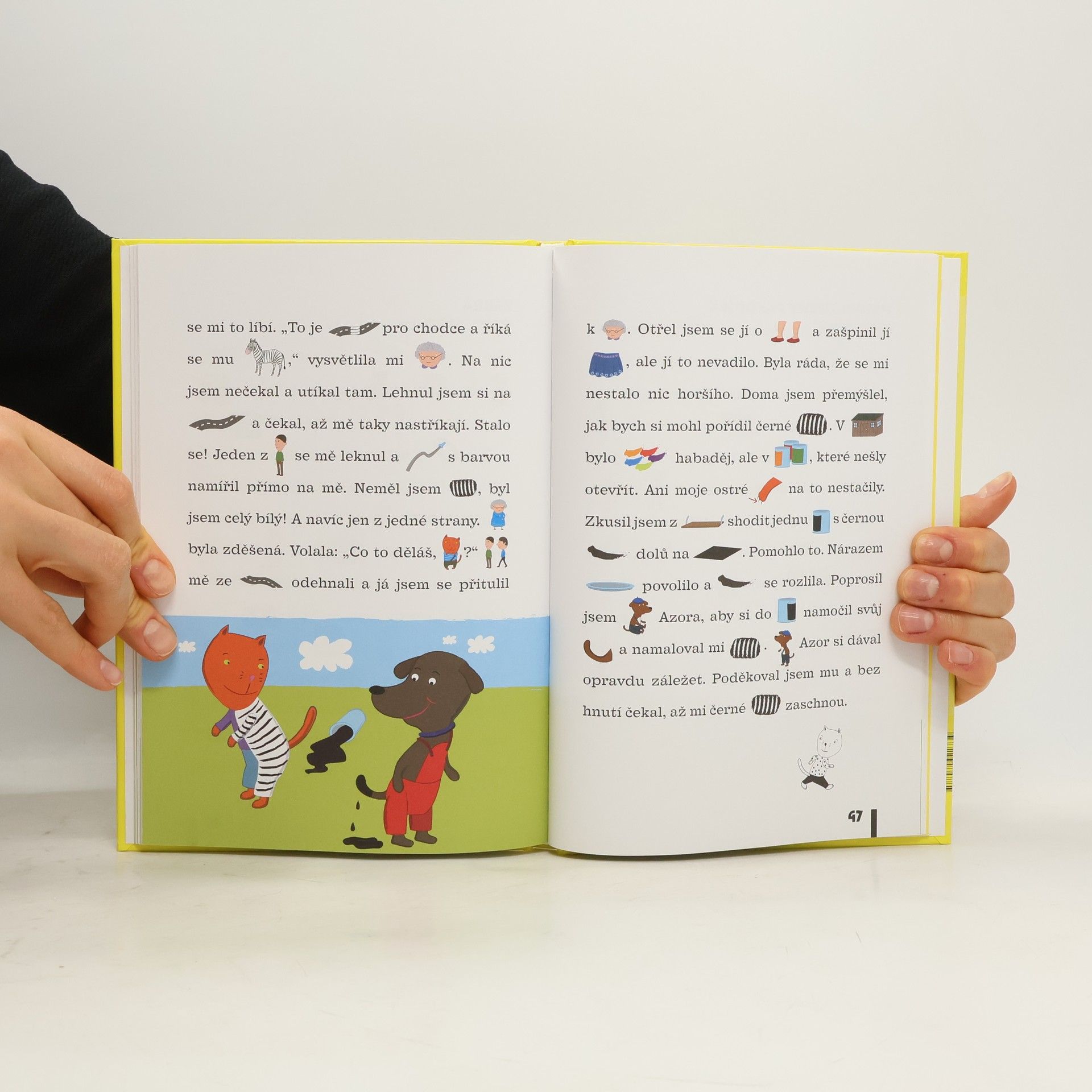 Jak chtěl být kocour želvou, pávem, slonem, jelenem, žirafou, velbloudem, lvem, zebrou a papouškem a nakonec se stal spokojeným kocourem i tygrem.