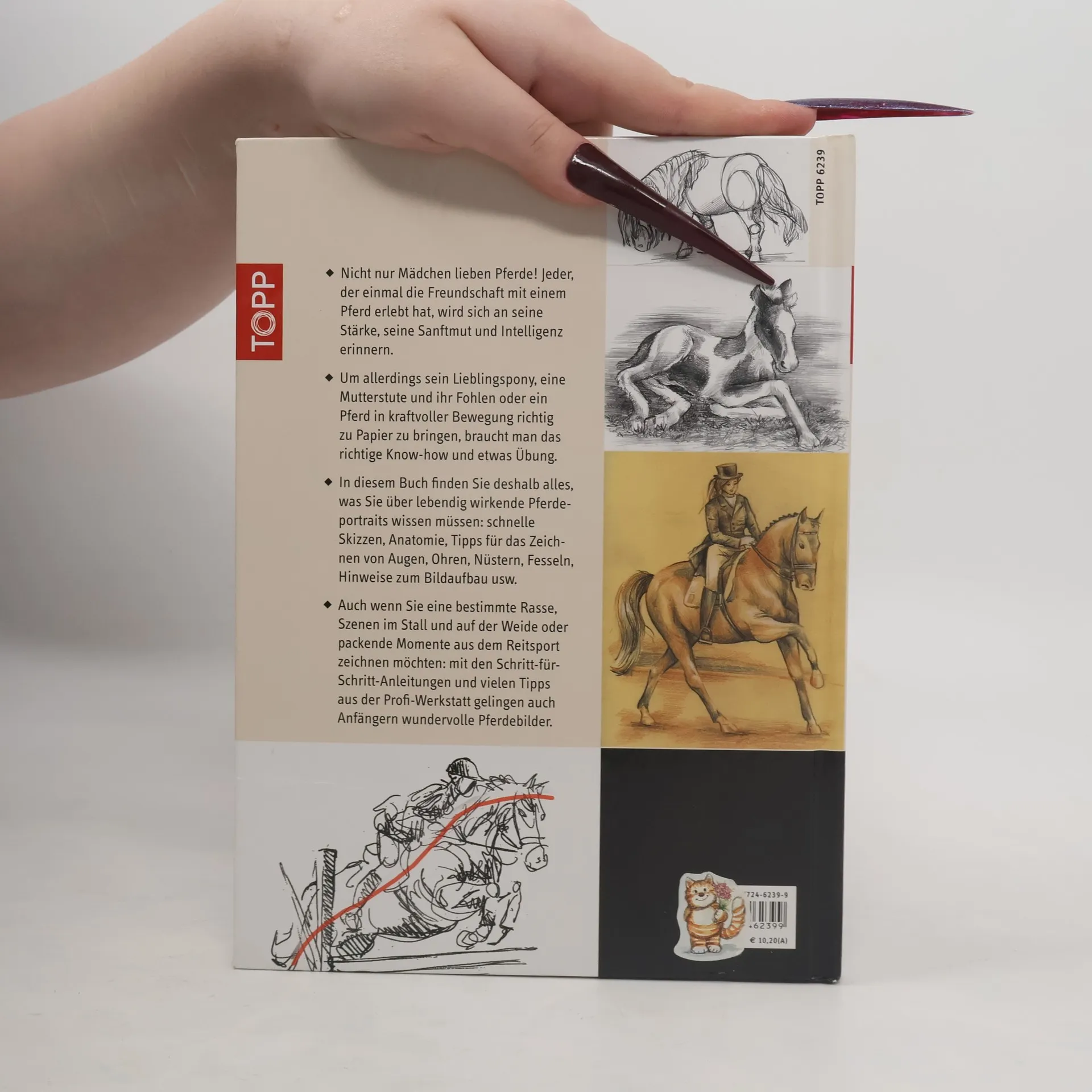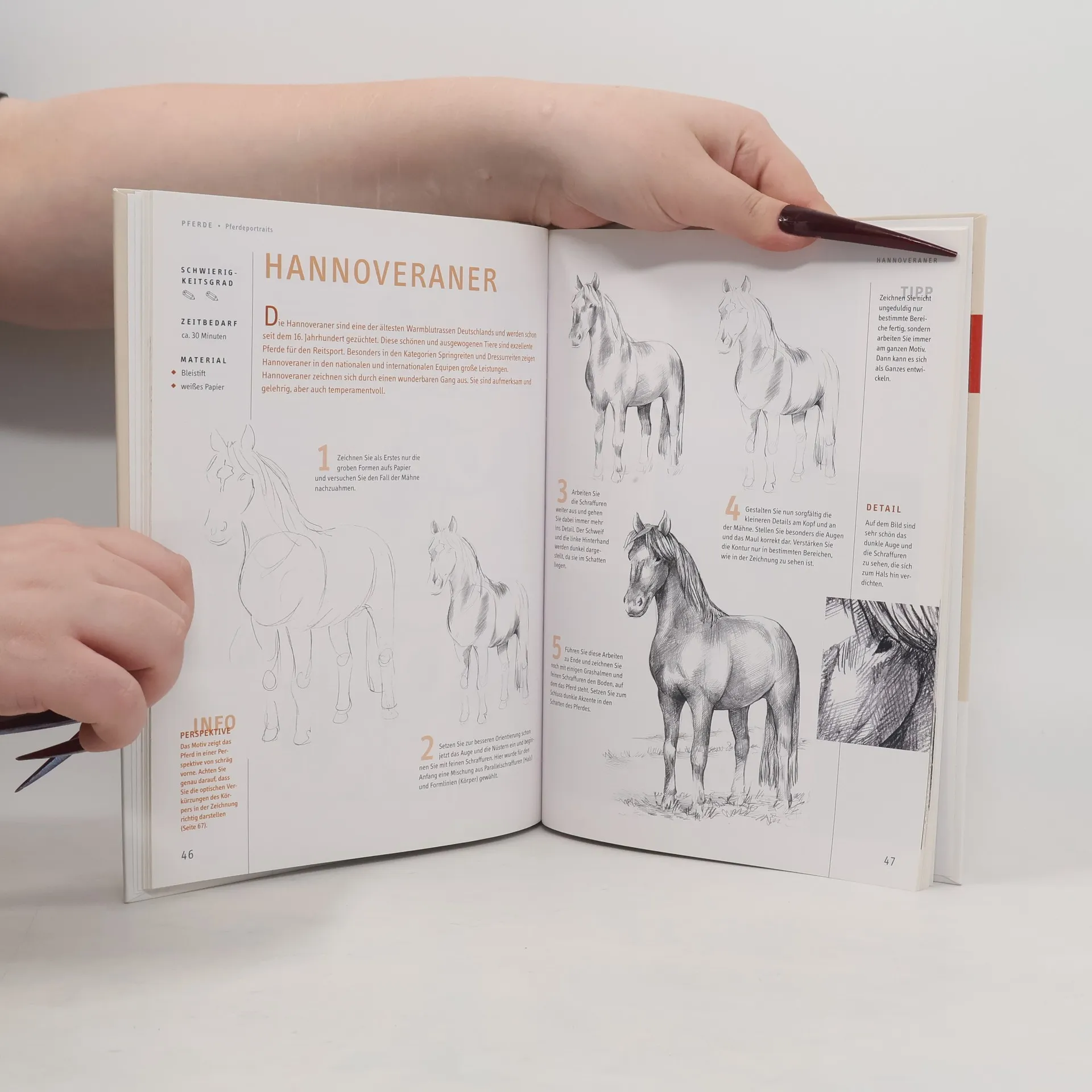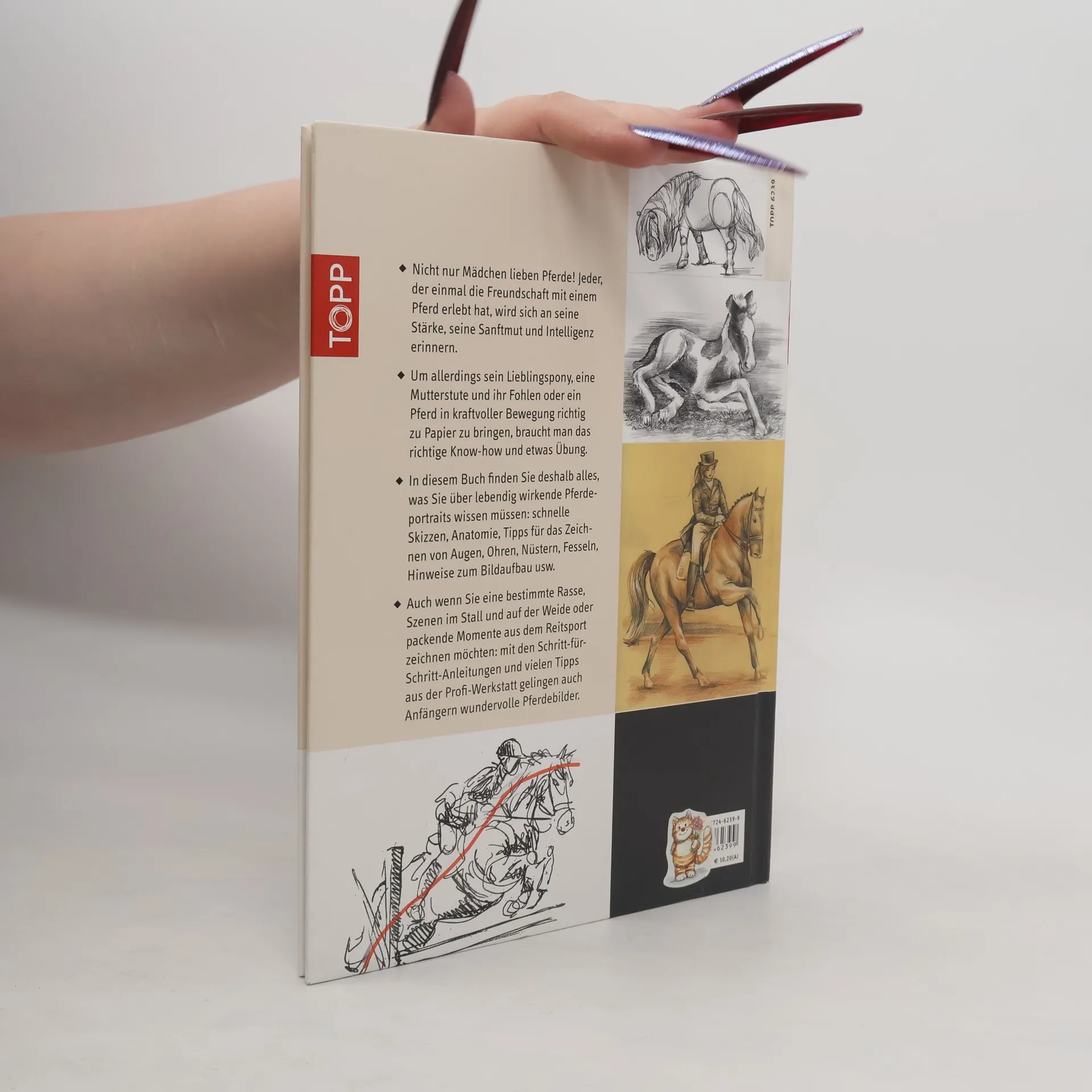Für Pferdeliebhaber: wer sein freches Lieblingspony, eine Mutterstute und ihr Fohlen oder ein Pferd in kraftvoller Bewegung richtig zu Papier bringen möchte, braucht das richtige Know-how und etwas Übung. In diesem Buch findet sich deshalb alles, was man über gekonnt und lebendig wirkende Pferdeportraits wissen muss: schnelle Skizzen, Anatomie, Tipps für das Zeichnen von Augen, Ohren, Nüstern, Fesseln, Hinweise zum Bildaufbau usw. 80 Seiten, 18,7 x 26 cm, Hardcover