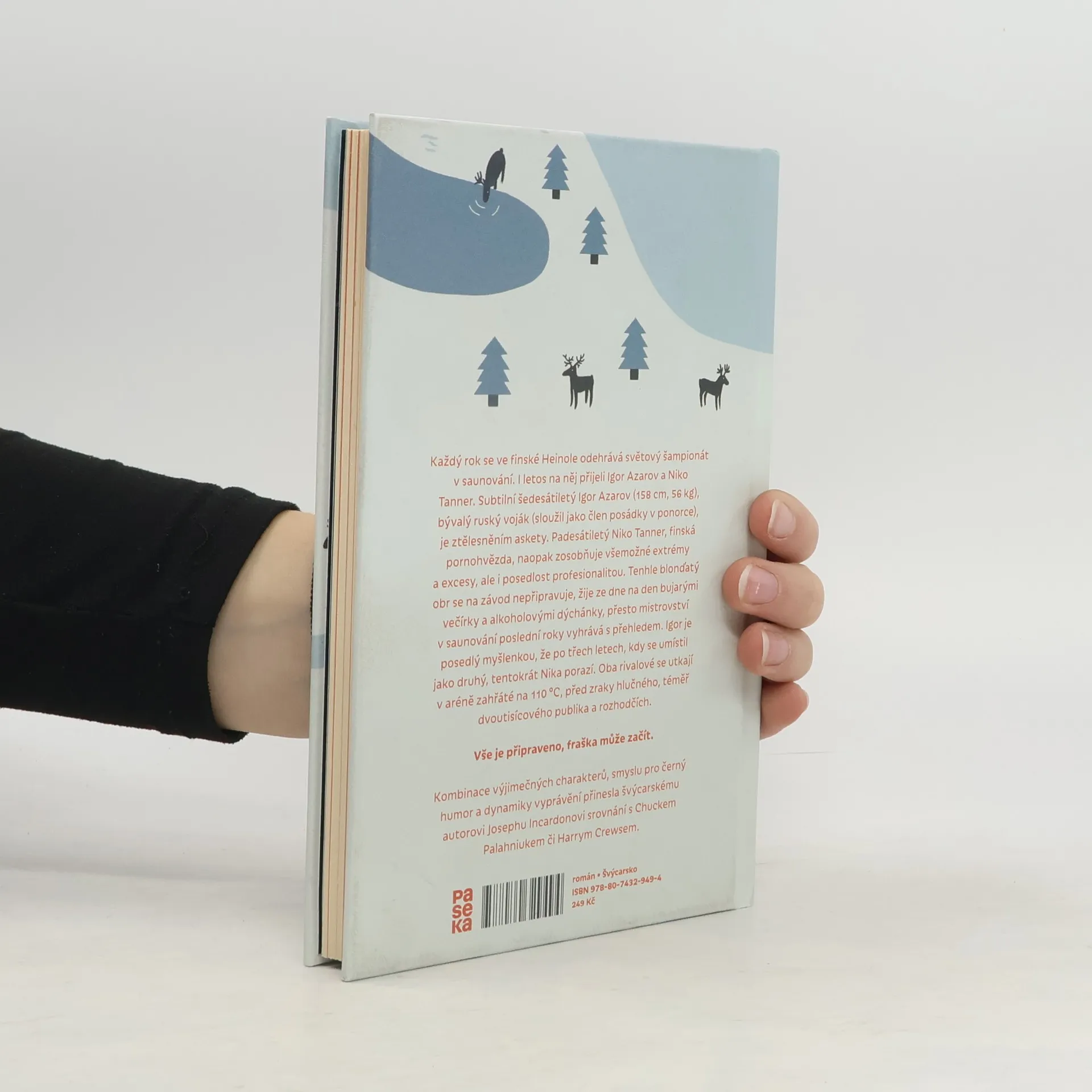 Každý rok se ve finské Heinole odehrává světový šampionát v saunování. Letos na něj přijeli i dva hrdinové tohoto románu, kteří působí jako vzájemné protiklady. Subtilní šedesátiletý Igor Azarov (158 cm, 56 kg), bývalý ruský voják (sloužil jako člen posádky v ponorce), je ztělesnění askety. Padesátiletý Niko Tanner, finská pornohvězda, naopak zosobňuje všemožné extrémy a excesy, ale i posedlost profesionální kvalitou. Tenhle blonďatý obr se na závod nepřipravuje, žije ze dne na den bujarými večírky a alkoholovými dýchánky, přesto mistrovství v saunování poslední roky vyhrává s přehledem. Igor je posedlý myšlenkou, že po třech letech, kdy se umístil jako druhý, tentokrát Nika porazí. Oba rivalové se utkají v aréně zahřáté na 110° Celsia, před zraky hlučného, téměř dvoutisícového publika a rozhodčích. Vše je připraveno, fraška může začít.