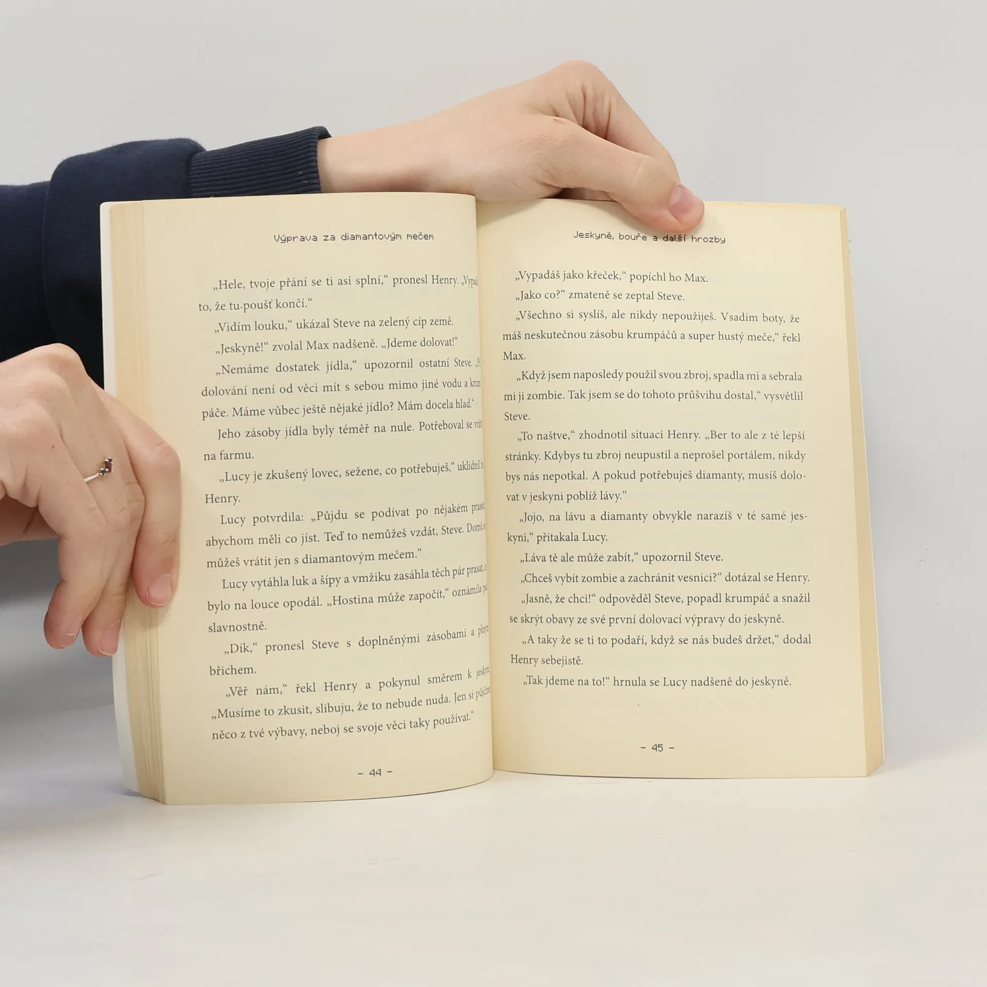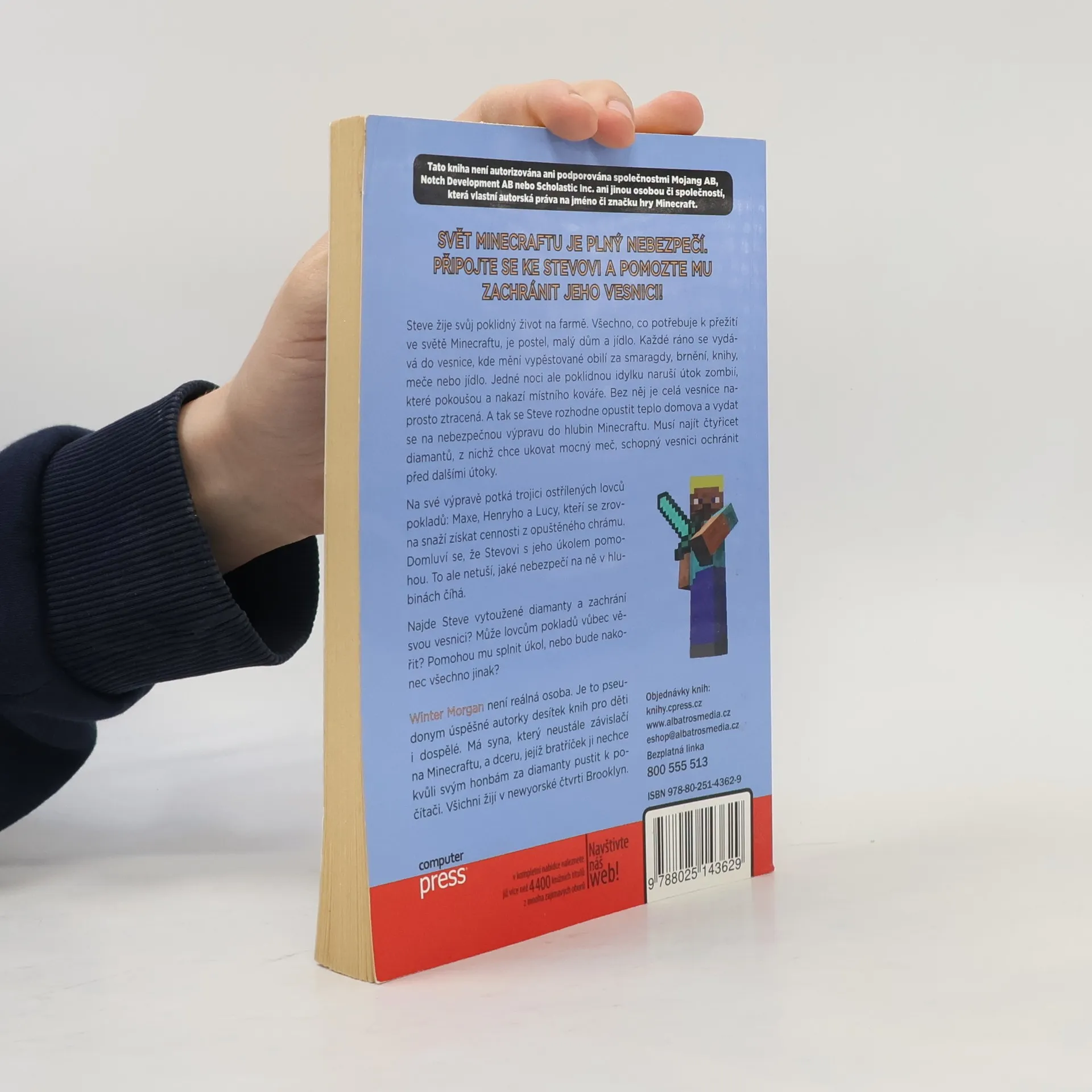 Steve žije klidný život na farmě, kde má vše potřebné k přežití: postel, malý dům a jídlo. Každé ráno navštěvuje vesnici, aby vyměnil obilí za smaragdy, brnění, knihy, meče nebo jídlo. Jedné noci však jeho idylku naruší útok zombií, které pokoušou místního kováře. Bez něj je vesnice v ohrožení, a tak se Steve rozhodne opustit domov a vyrazit na nebezpečnou výpravu do hlubin Minecraftu. Jeho cílem je najít čtyřicet diamantů, aby ukoval mocný meč, který vesnici ochrání před dalšími útoky. Na své cestě potká trojici lovců pokladů: Maxe, Henryho a Lucy, kteří se snaží získat cennosti z opuštěného chrámu. Dohodnou se, že Stevovi pomohou, aniž by tušili, jaké nebezpečí na ně čeká. Dokáže Steve najít diamanty a zachránit vesnici? Může lovcům pokladů věřit? Pomohou mu splnit úkol, nebo se vše obrátí jinak? Winter Morgan není reálná osoba, ale pseudonym úspěšné autorky knih pro děti i dospělé, která žije v Brooklynu se svým synem a dcerou.