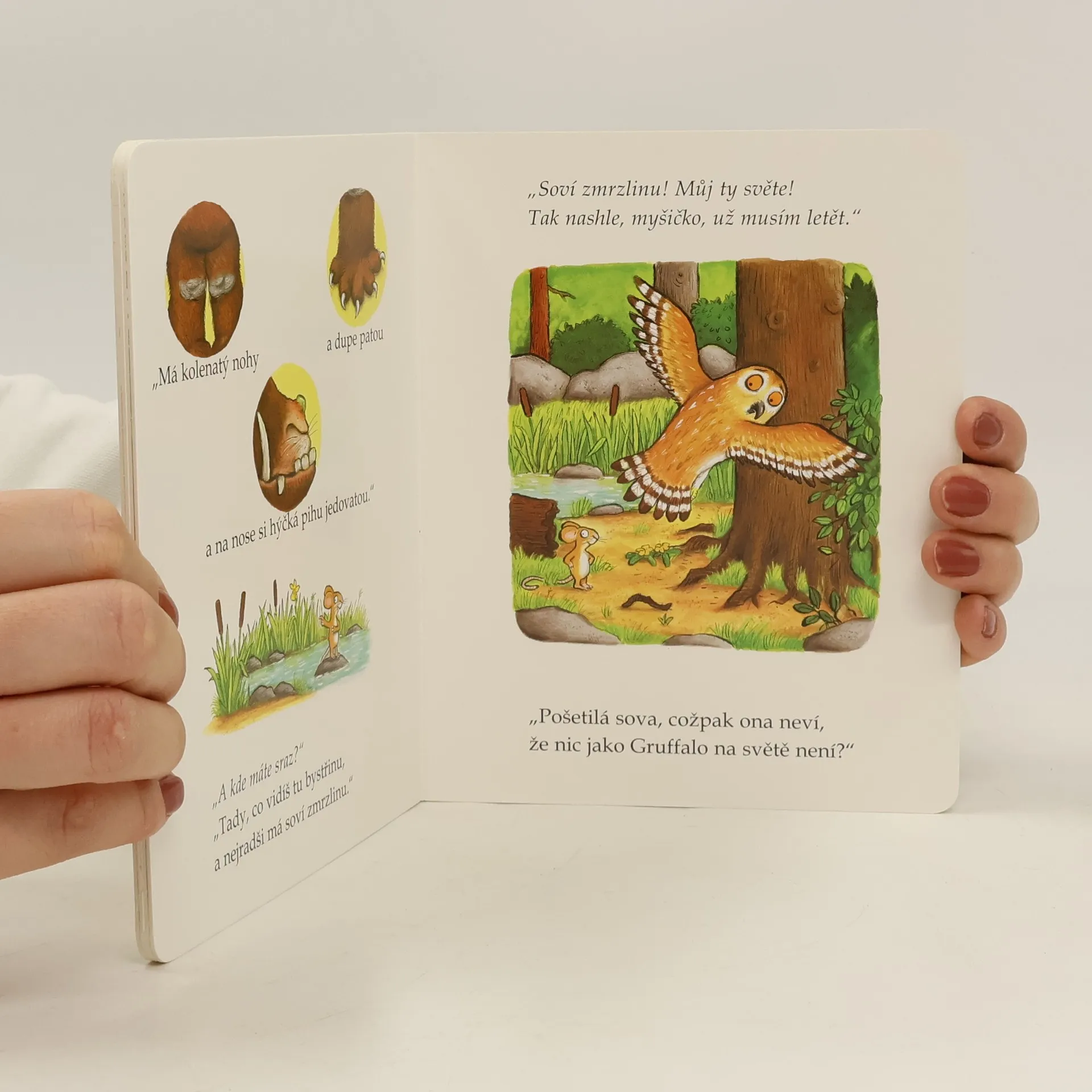 Myška si vyjde do lesa, ale na procházce nemá chvíli klidu. Pořád se ji někdo snaží sežrat! Had, liška, sova... Ještě že má myška "pod čepicí" a na pomoc si přimyslí Gruffala – strašlivou příšeru, která by všechnu tu nenechavou zvěř zblajzla na posezení. A tak myšku všichni raději nechají být. Jenže co když je Gruffalo skutečný? Je myška dost statečná na to, aby převezla i jeho? Nenapodobitelné ilustrace Axela Schefflera se geniálně propojují s originálním, vtipným textem Julie Donaldson a společně tvoří dnes již takřka klasický příběh, který si získal srdce dětí po celém světě. Možná jej znáte i z oceněného animovaného filmu. Legendární Gruffalo vychází v novém, čtivém a nápaditém překladu, a navíc na tvrdých stránkách leporela – takže odolá opakovanému prohlížení i těch divočejších dětských čtenářů.
