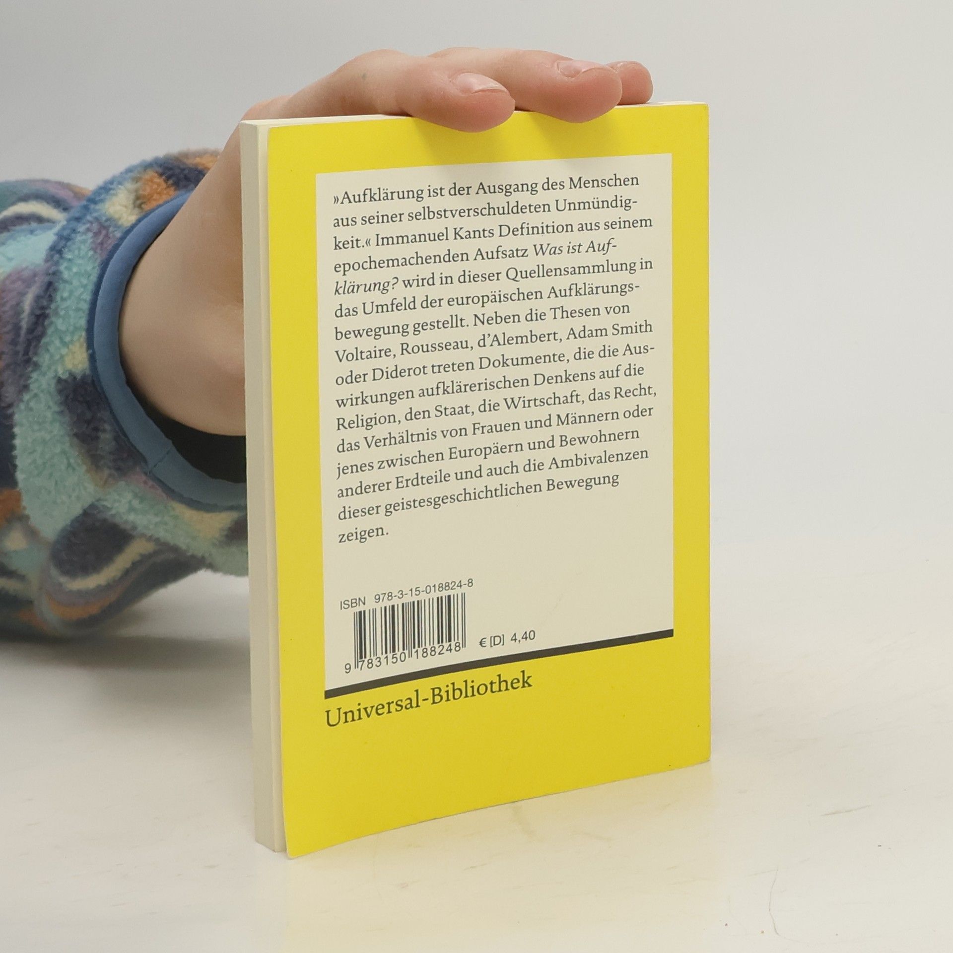 An die Stelle des bisherigen, 1974 erstmals erschienenen Bändchens (UB 9714) tritt mit dieser Neuerscheinung eine wesentlich breiter und international angelegte Auswahl, die einen Eindruck von den herrschenden Tendenzen der Aufklärungsbewegung vermittelt, dabei aber deren Ambivalenzen und Wiedersprüche nicht ausblendet. Wie bisher steht am Beginn Kants epochemachender Aufsatz Was ist Aufklärung? Ihm folgen Texte prominenter Aufklärer wie d'Alembert, Voltaire, Thomasius und Lichtenberg, die das Postulat des kritischen Selbstdenkens formulierten. Andere Quellen zeigen, welche Lebensbereiche dieses Programm erfasste: die Religion, den Staat, die Wirtschaft, das Recht, das Verhältnis zwischen Männern und Frauen, Erwachsenen und Kindern, europäischen und außereuropäischen Völkern.