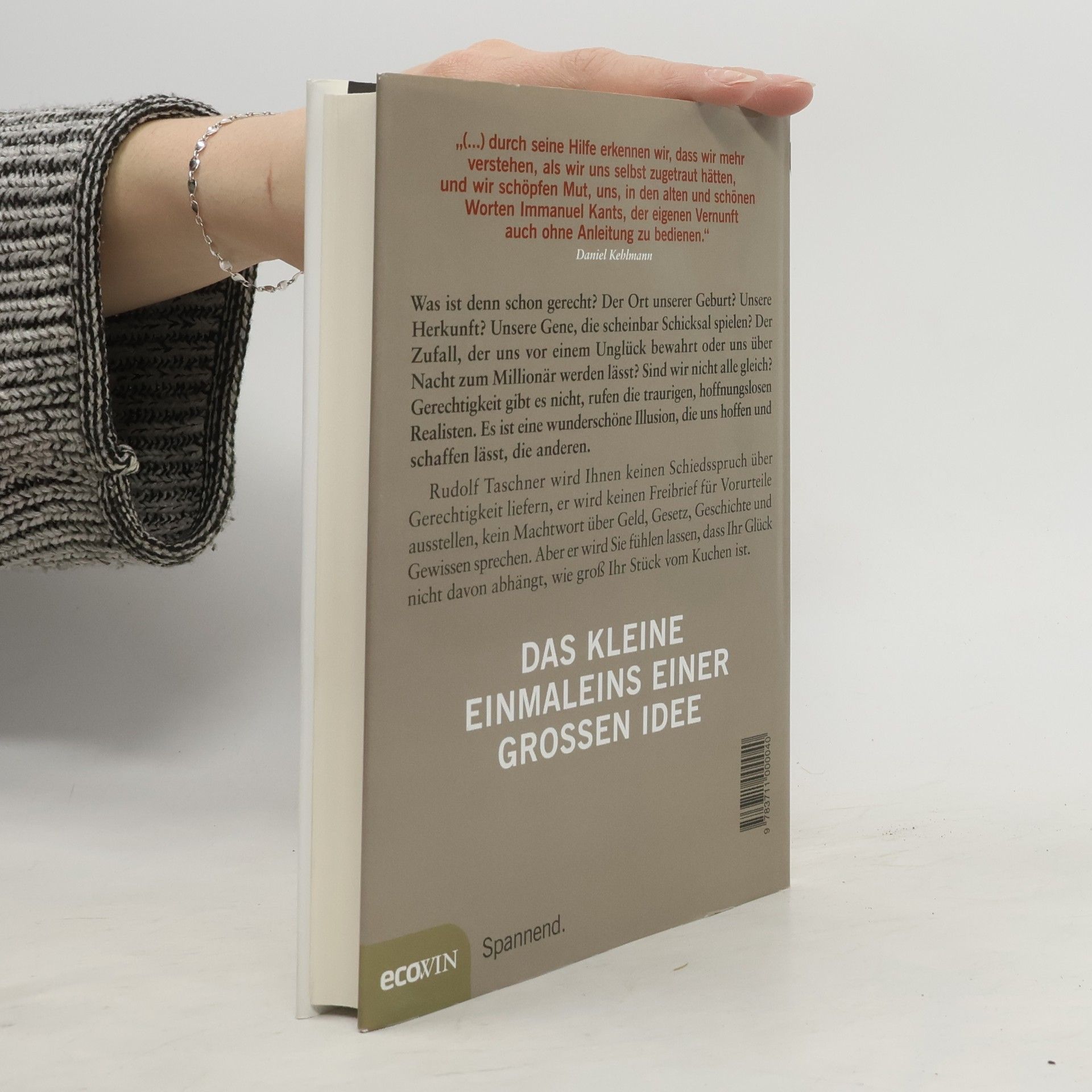 Was ist denn schon gerecht? Der Ort unserer Geburt? Unsere Herkunft? Unsere Gene, die scheinbar Schicksal spielen? Der Zufall, der uns vor einem Unglück bewahrt, oder uns über Nacht zum Millionär werden lässt? Sind wir nicht alle gleich? Gerechtigkeit gibt es nicht!, rufen die traurigen, hoffnungslosen Realisten. Es ist eine wunderschöne Illusion, die uns hoffen und schaffen lässt, die anderen. Rudolf Taschner wird Ihnen keinen Schiedsspruch über Gerechtigkeit liefern, er wird keinen Freibrief für Vorurteile ausstellen, kein Machtwort über Geld, Gesetz, Geschichte und Gewissen sprechen. Aber er wird Sie fühlen lassen, dass Ihr Glück nicht davon abhängt, wie groß Ihr Stück vom Kuchen ist.
