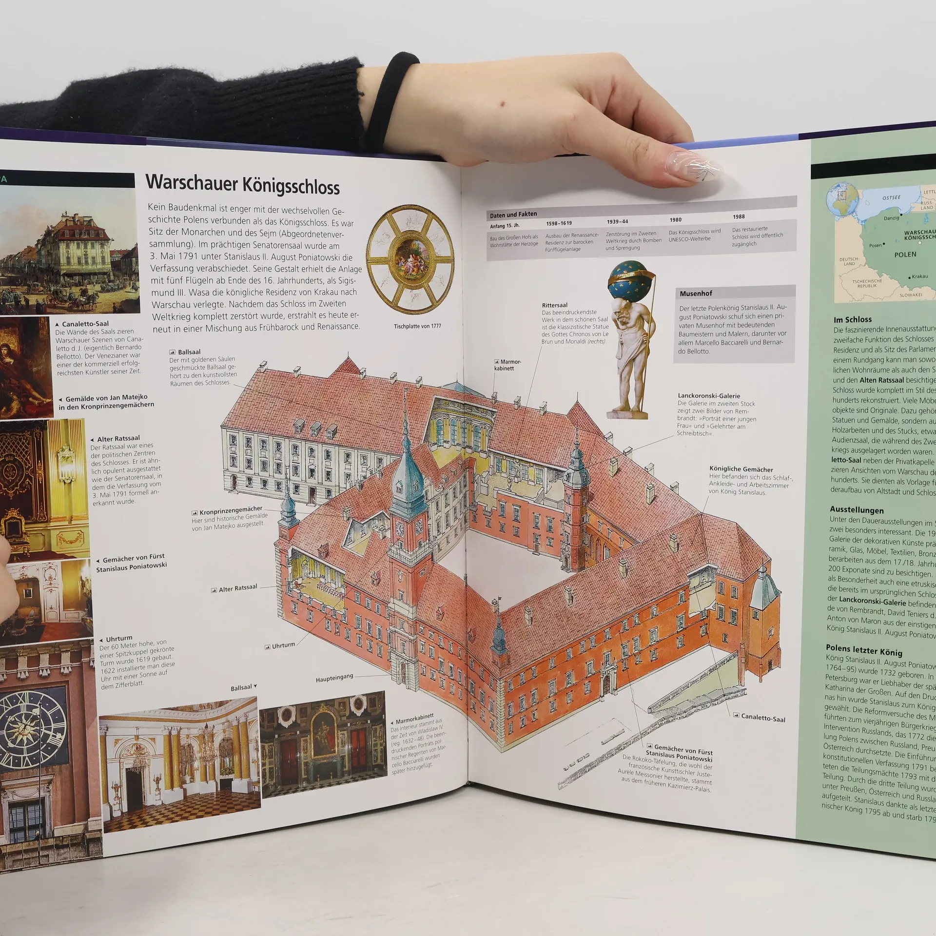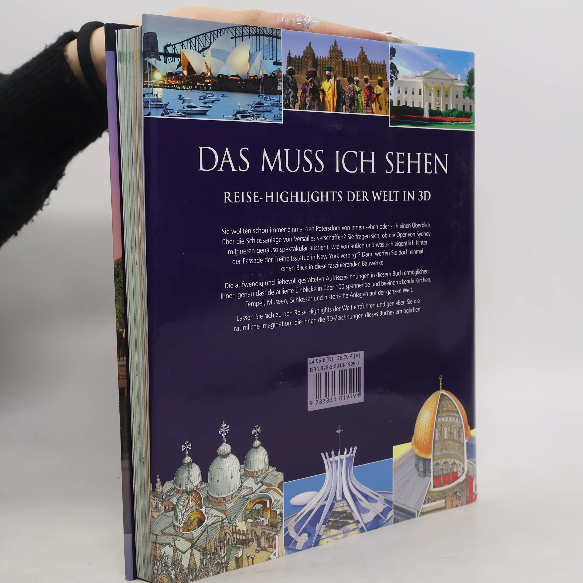 Das muss ich sehen. Reise-Highlights der Welt in 3D. nimmt den Leser mit auf eine Reise zu über 100 spannenden Sehenswürdigkeiten der Welt. Aufwendige Aufrisszeichnungen – bekannt aus der erfolgreichen Reiseführer-Reihe Vis-à-Vis – ermöglichen faszinierende Einblicke in Kirchen und Gebäude wie den Kölner Dom und Schloss Neuschwanstein, den Petersdom und das Kolosseum in Rom oder die Guggenheim Museen in New York und Bilbao. Außerdem bieten gezeichnete Pläne einen detaillierten Blick auf historische Stätten wie Machu Picchu in Peru oder Anlagen wie Schloss Versailles in Frankreich. Dank der einmaligen Aufrisszeichnungen ist es möglich, einen genauen Blick in das Innere der Sehenswürdigkeiten zu werfen. Zahlreiche kleine Texte erklären die Zeichnung im Detail, so dass der Leser komplett in ihren Bann gezogen wird. Zusätzliche Informationen liefern Themenkästen, Zeitleisten und Fotos. Außerdem findet sich auf jeder Seite eine kleine Orientierungskarte, die es dem Leser sofort ermöglicht, einen Überblick über die Lage der Sehenswürdigkeit zu erhalten.